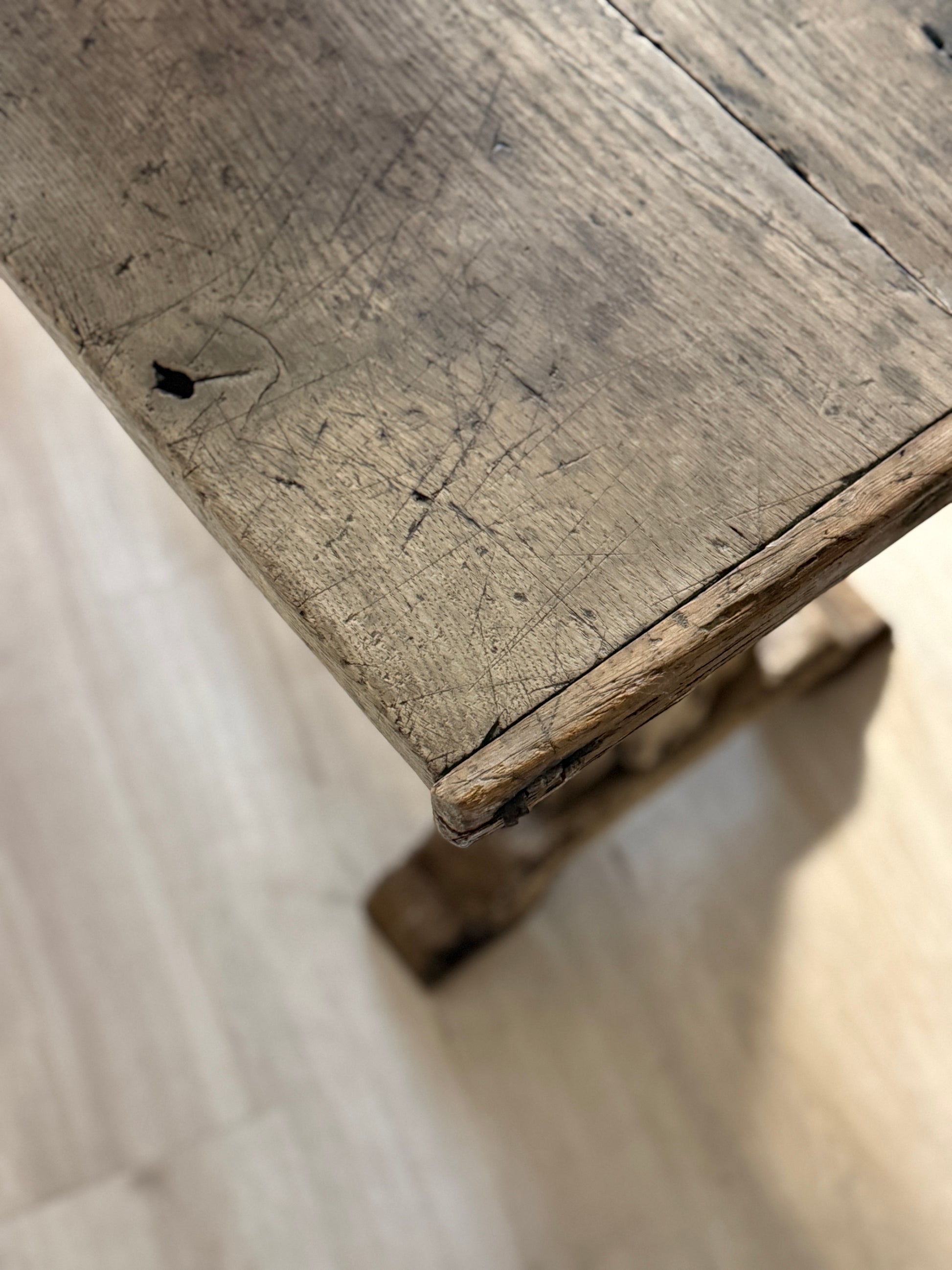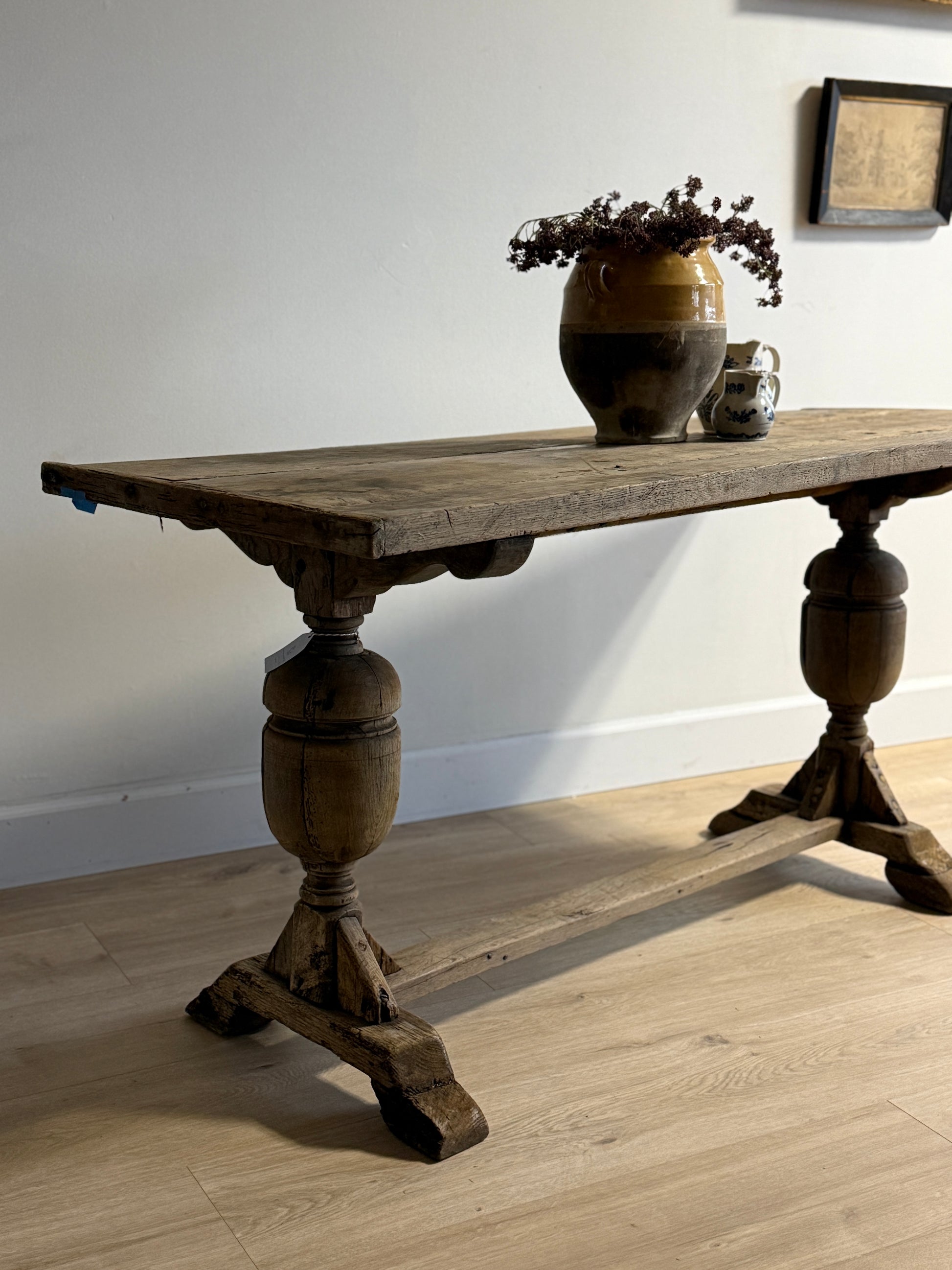 An extraordinary 17th-century French oak dining table showcasing exquisite craftsmanship and sculptural form. Its trestle base, with deeply turned baluster legs joined by a stretcher, reflects the architectural strength and refined simplicity of early French design. The thick oak top bears the textured marks of age and use, a surface softened by centuries of wear yet rich with character. A table of remarkable presence—equally suited as a statement dining piece or as a striking console in an entry or gallery space.