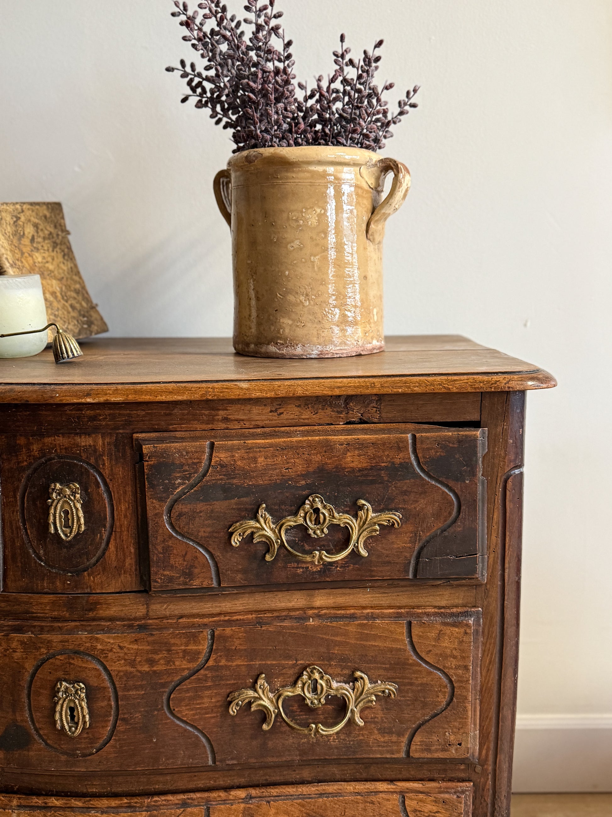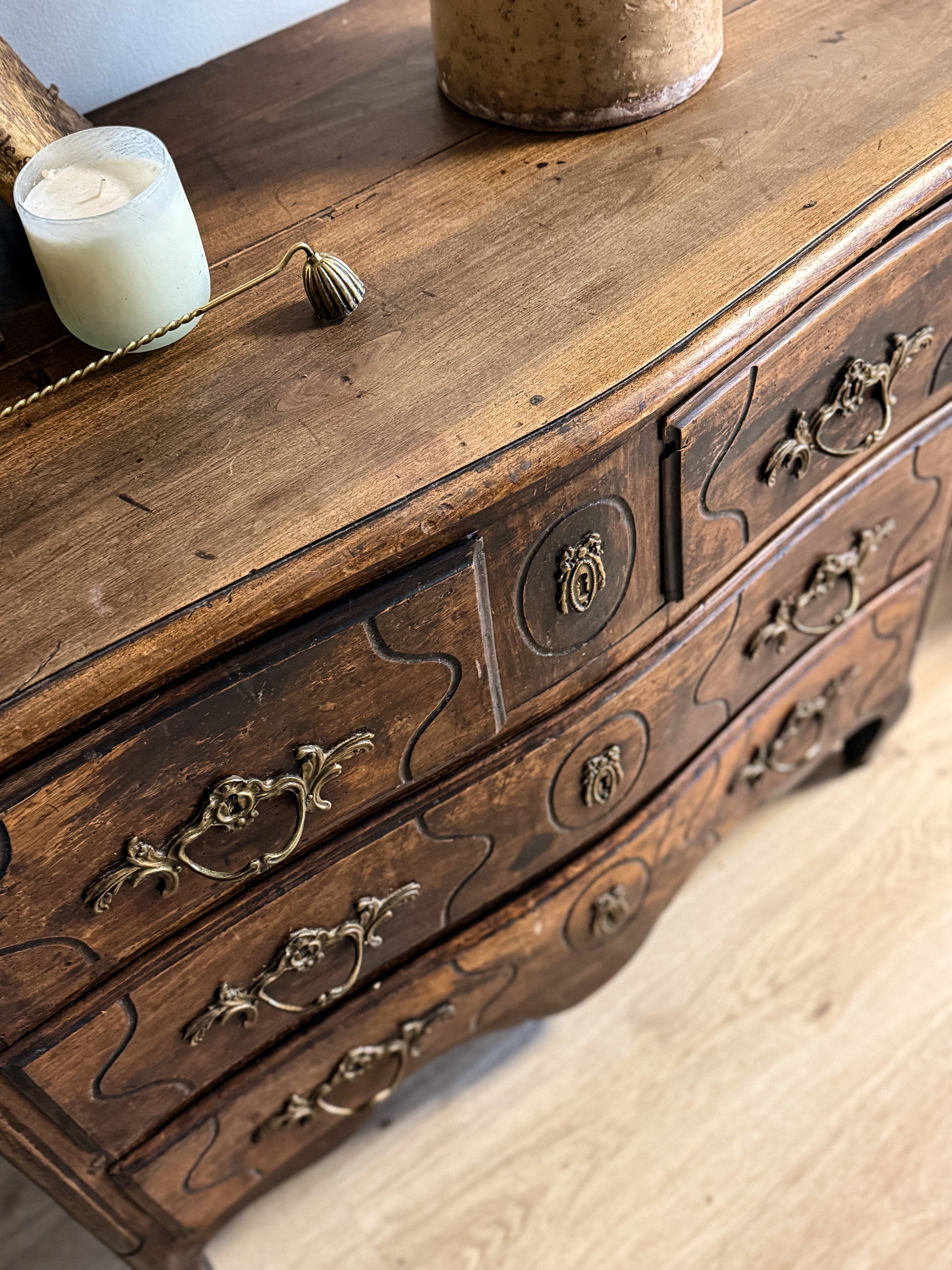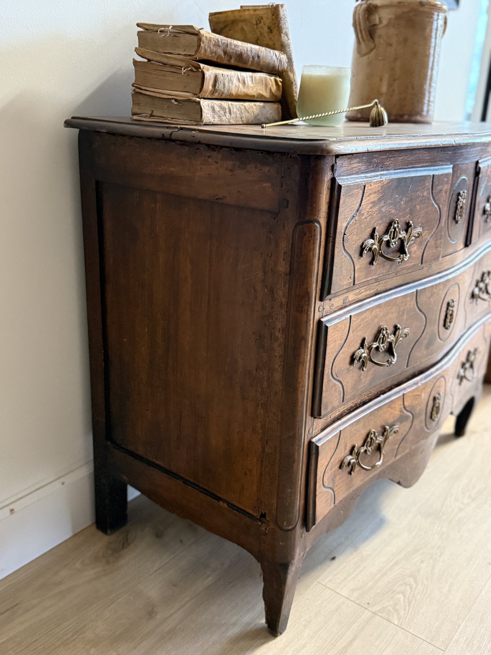 This antique French dresser is crafted from walnut, its warm, time-softened surface showing the depth and variation that only age can create. The softly shaped drawers are framed by gentle curves and subtle carved detailing, balanced by original brass hardware worn smooth through years of use. Natural shifts in tone across the walnut add quiet richness and visual interest, giving the piece presence without feeling formal. Well-proportioned and versatile, it works beautifully in a bedroom, entry, or living space—an understated French piece with real substance and lived-in charm.