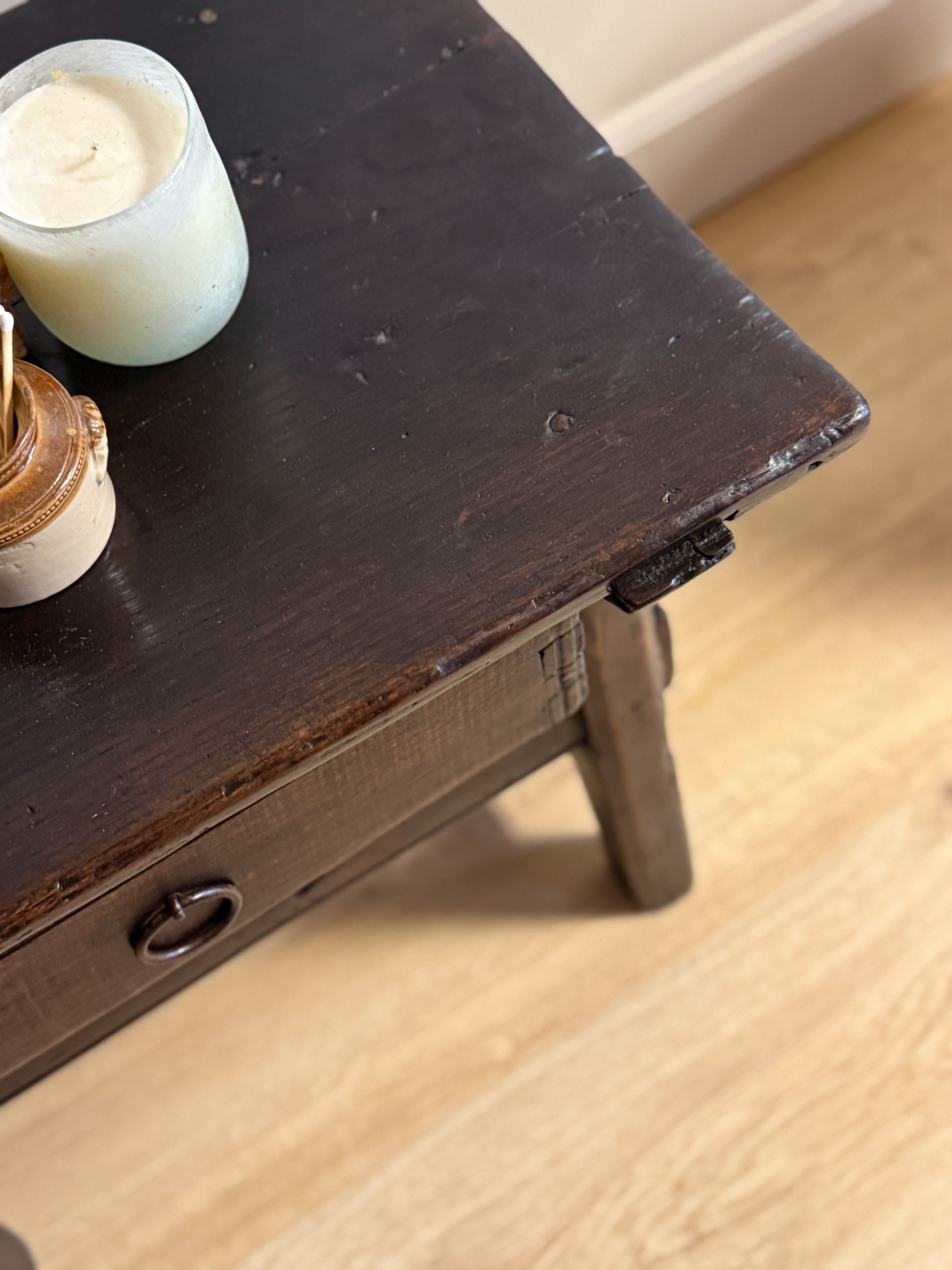 This 18th century Spanish shepherd’s table, dating to circa 1750, is a quietly powerful piece with all the soul you hope to find in early rural furniture. Crafted in richly aged wood with a deep, time-earned tone, it features stout, squared legs, simple pegged construction, and a single drawer fitted with its original iron ring pull. The surface bears centuries of use—soft undulations, worn edges, and a patina that could never be replicated—while the compact scale makes it endlessly versatile. Perfect as a side table or nightstand, this is the kind of piece that brings history into a room without asking for attention, yet never goes unnoticed.