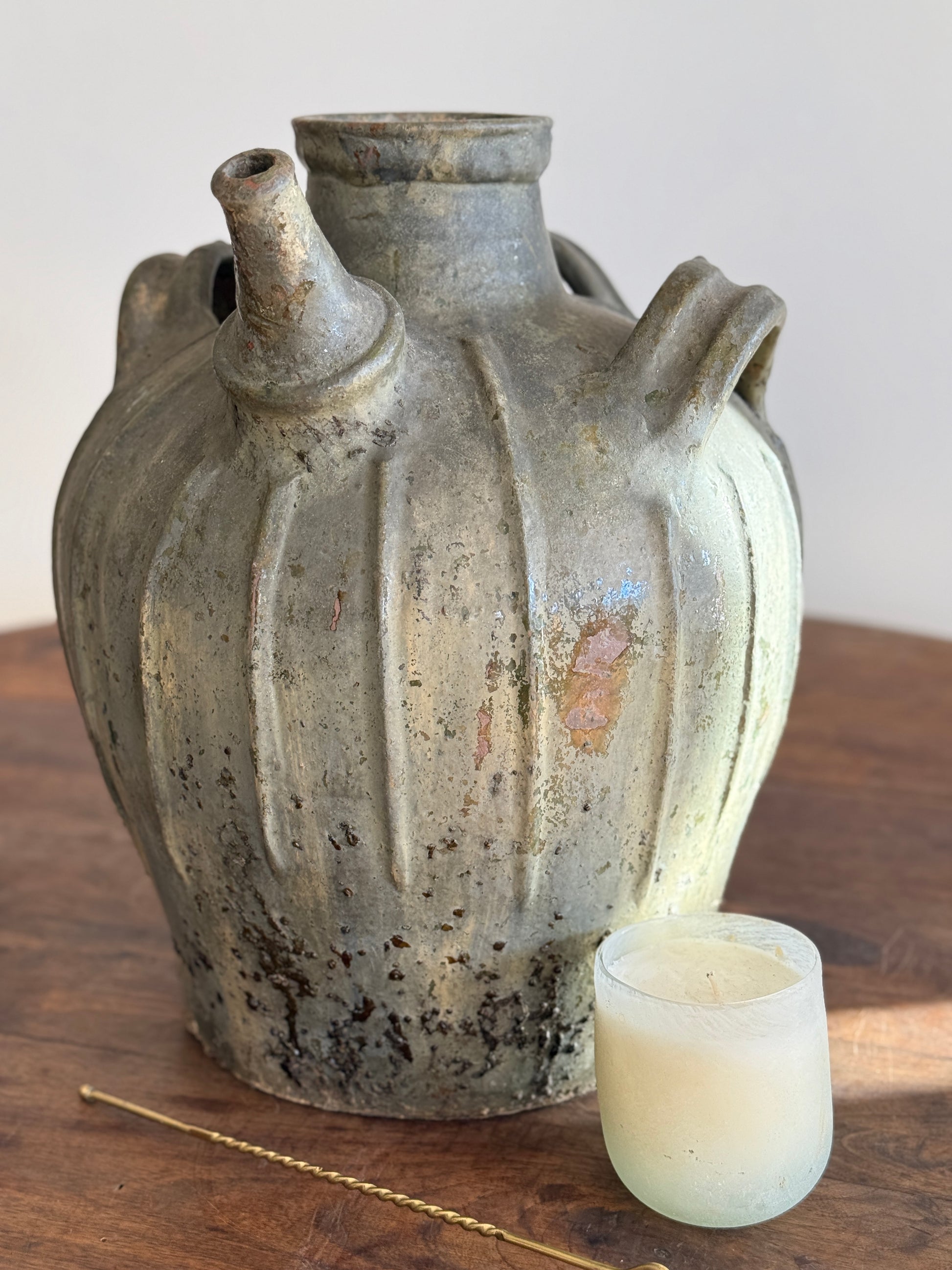 This rare 18th century walnut oil jug is a quietly striking example of early utilitarian pottery, shaped by hand and softened by centuries of use. Its generously rounded body is accented with softly ribbed sides and two small looped handles, while the spout and wide mouth speak to its original purpose in storing and pouring precious oil. The surface has mellowed to a beautifully muted grey-green tone, with scattered areas of wear and mineral staining that tell the story of its long working life. Subtle imperfections, firing marks, and surface variations give the piece an unmistakable sense of age and authenticity. Both sculptural and functional in form, this jug brings depth, texture, and understated character to any shelf, console, or kitchen display.