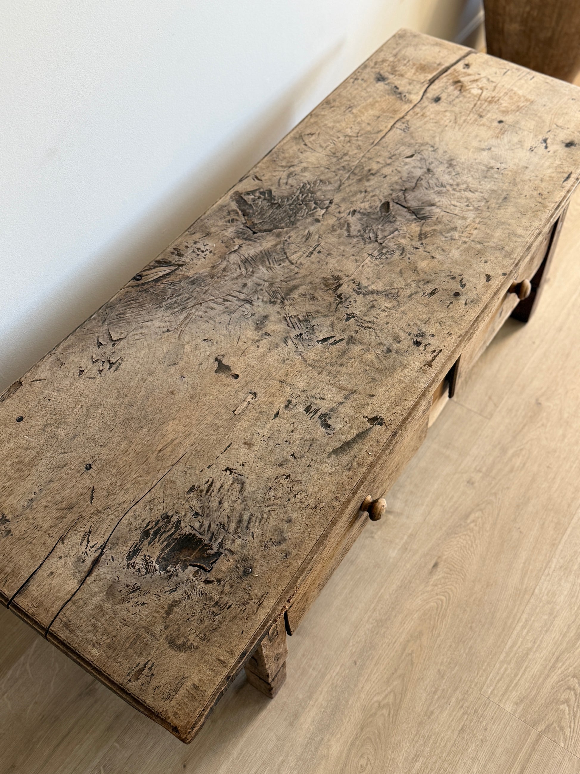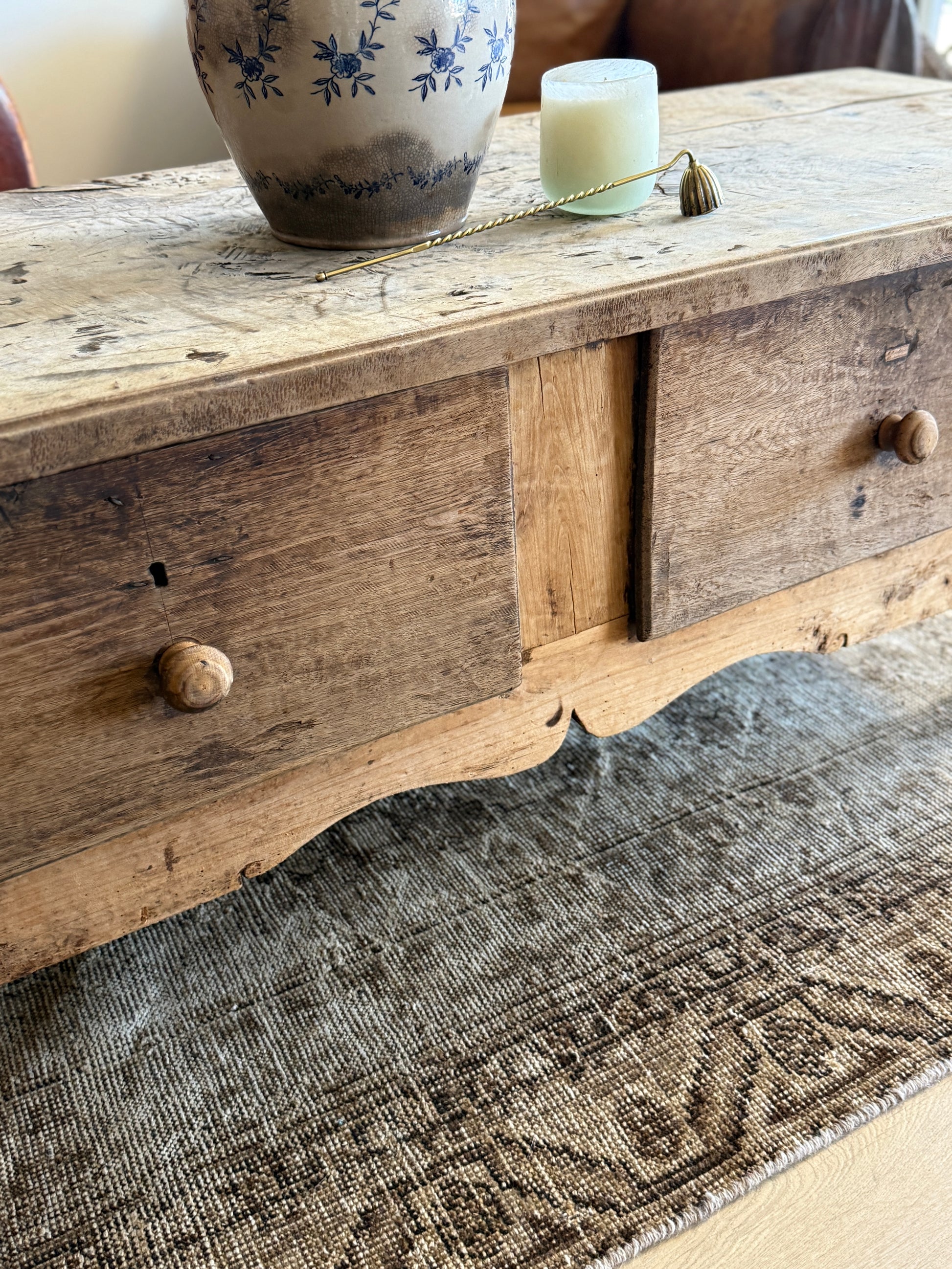 The coffee table of our dreams, this soulful 19th-century French table dating to the early 1800s is all about its stunning patina, warm wood tone, and beautifully timeworn surface. Crafted in solid fruitwood and worn smooth from generations of everyday use, it features two deep drawers with original turned wood pulls and a softly scalloped apron that adds just the right amount of character. The low, sturdy form makes it perfect for anchoring a living room, while the generous top offers a beautiful stage for books, pottery, and collected objects. Sourced in France, this is the kind of piece that brings instant history and warmth to a space.