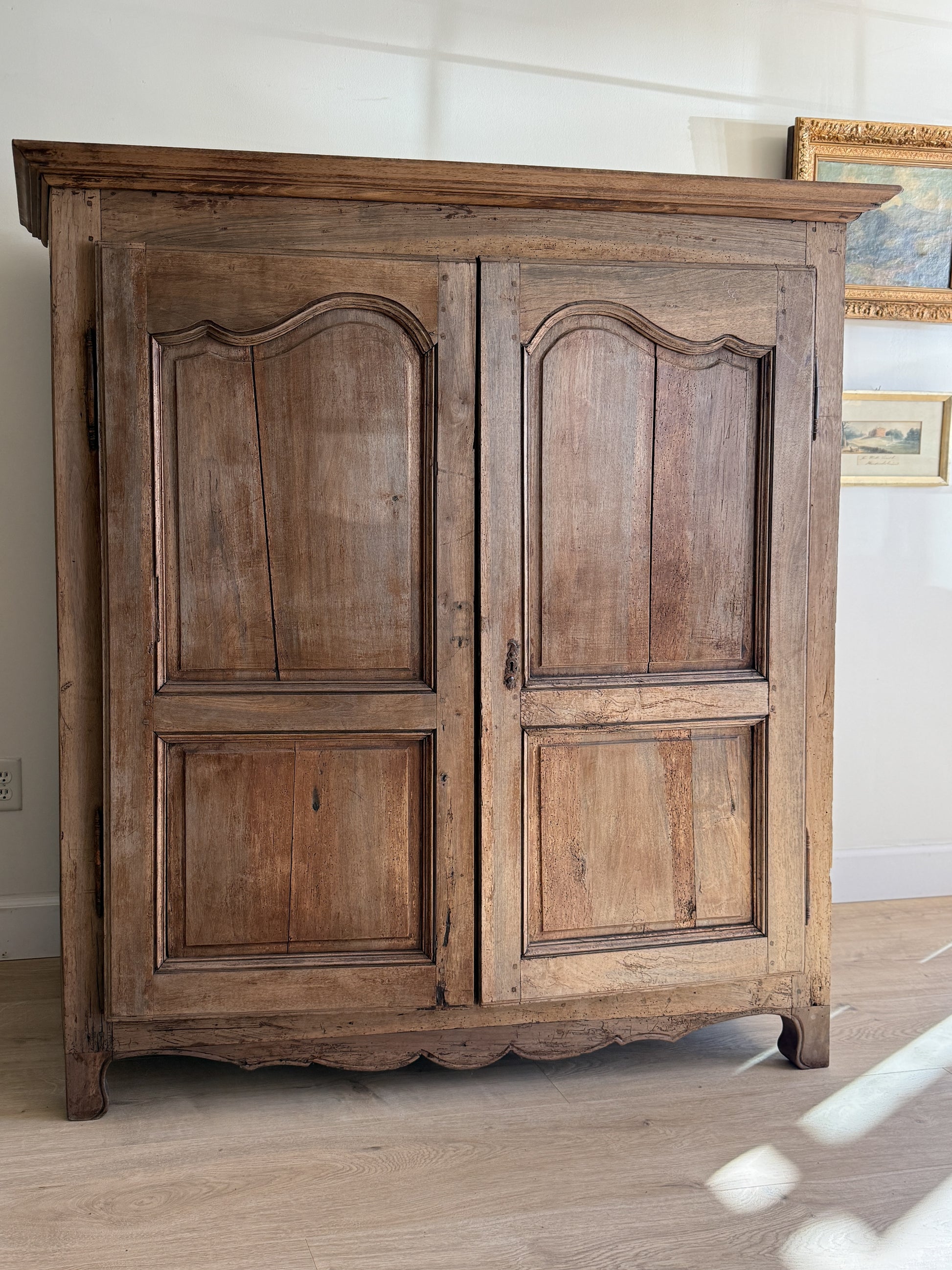 A striking 19th-century French walnut armoire, c.1880, with gracefully arched panel doors and a beautifully bleached finish that highlights the quiet grain and time-softened surface of the wood. Its generous proportions and scalloped apron give it a stately yet approachable presence, while the interior reveals a delightfully patterned red-and-white floral lining—likely added in the early 20th century—that lends both charm and a sense of history. Originally made for storing linens or garments, this armoire now offers ample storage with a touch of rustic French character, perfect for a bedroom, entryway, or as a focal point in a living space.