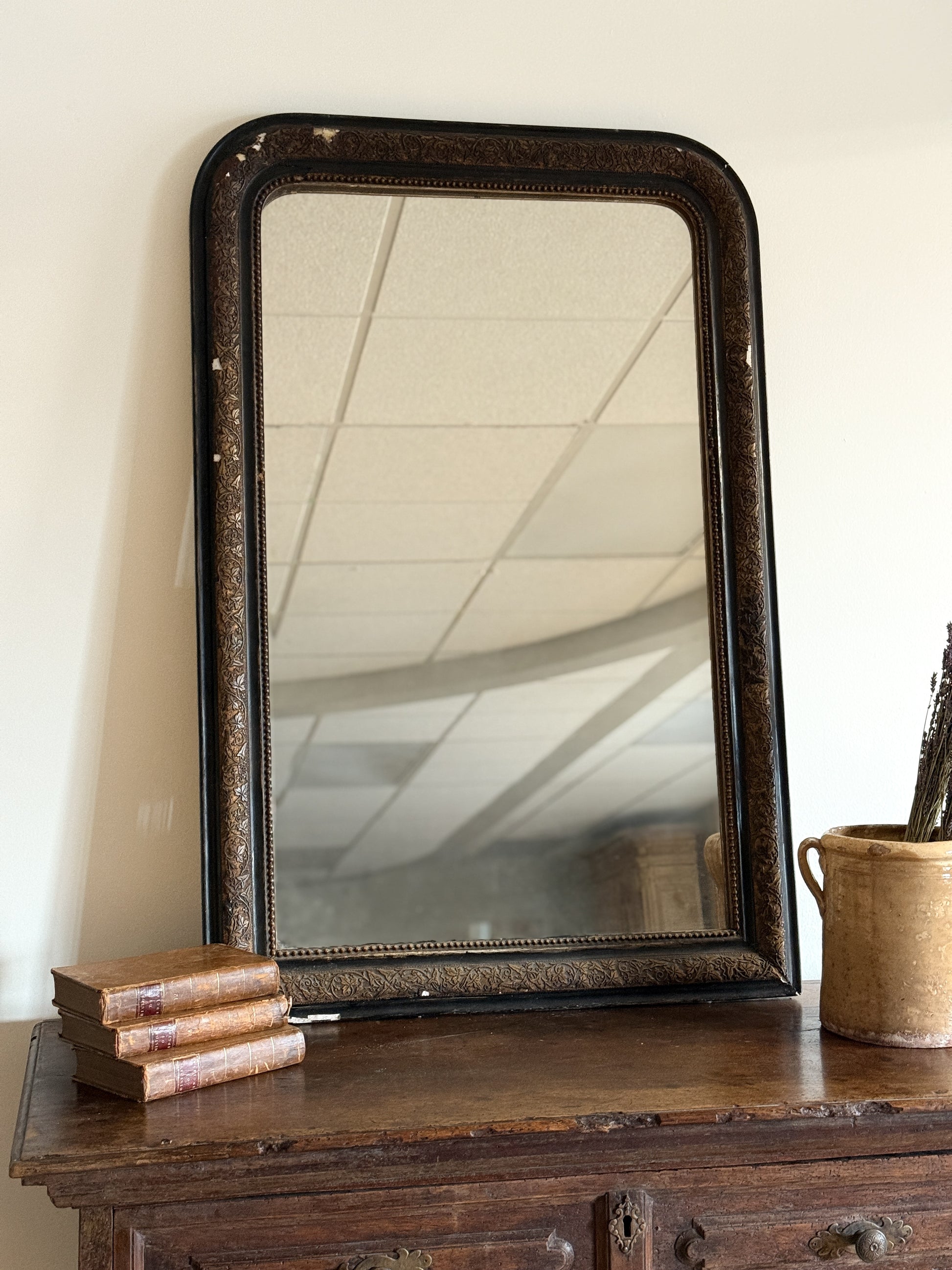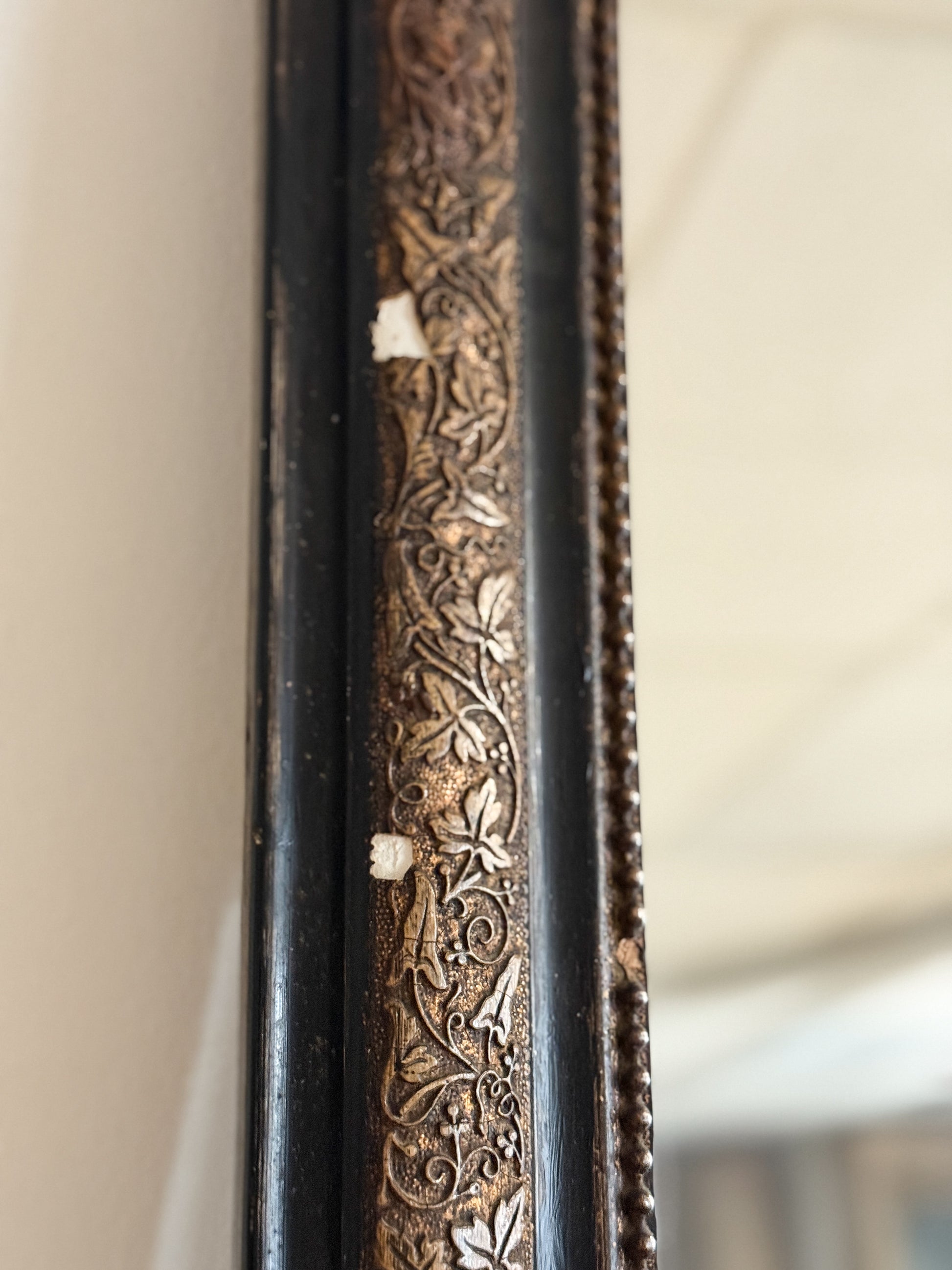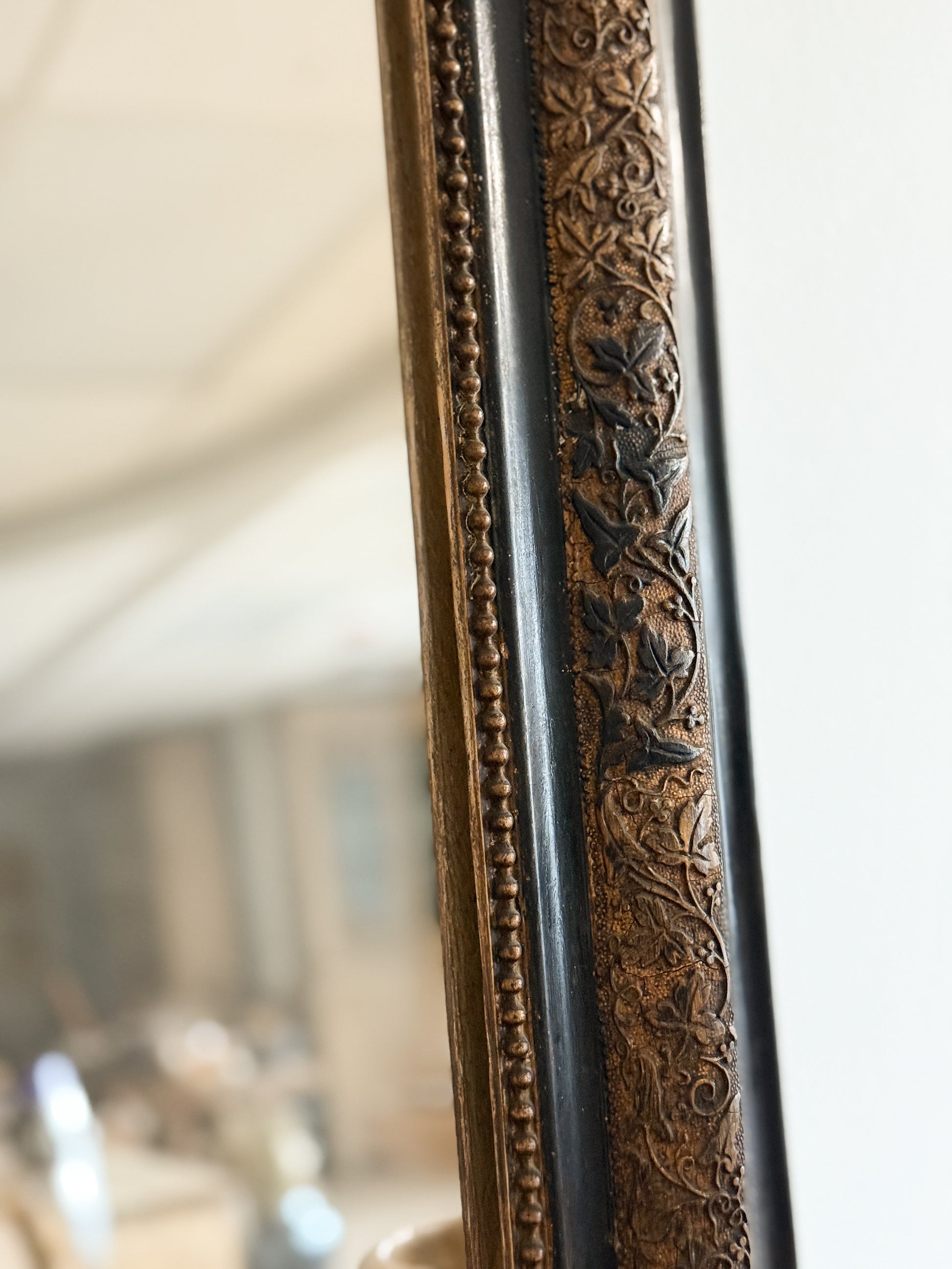 Sourced from a French château salon, this striking mirror witnessed decades of evening preparations where nobility checked their appearance before grand soirées. The deep black frame carries intricate gilt molding that still catches light beautifully, while hand-applied gold leaf shows the gentle wear of authentic age. Substantial and commanding, this piece is now ready to add authentic French character to modern bathrooms, hallways, or any space that appreciates the real thing over reproductions.