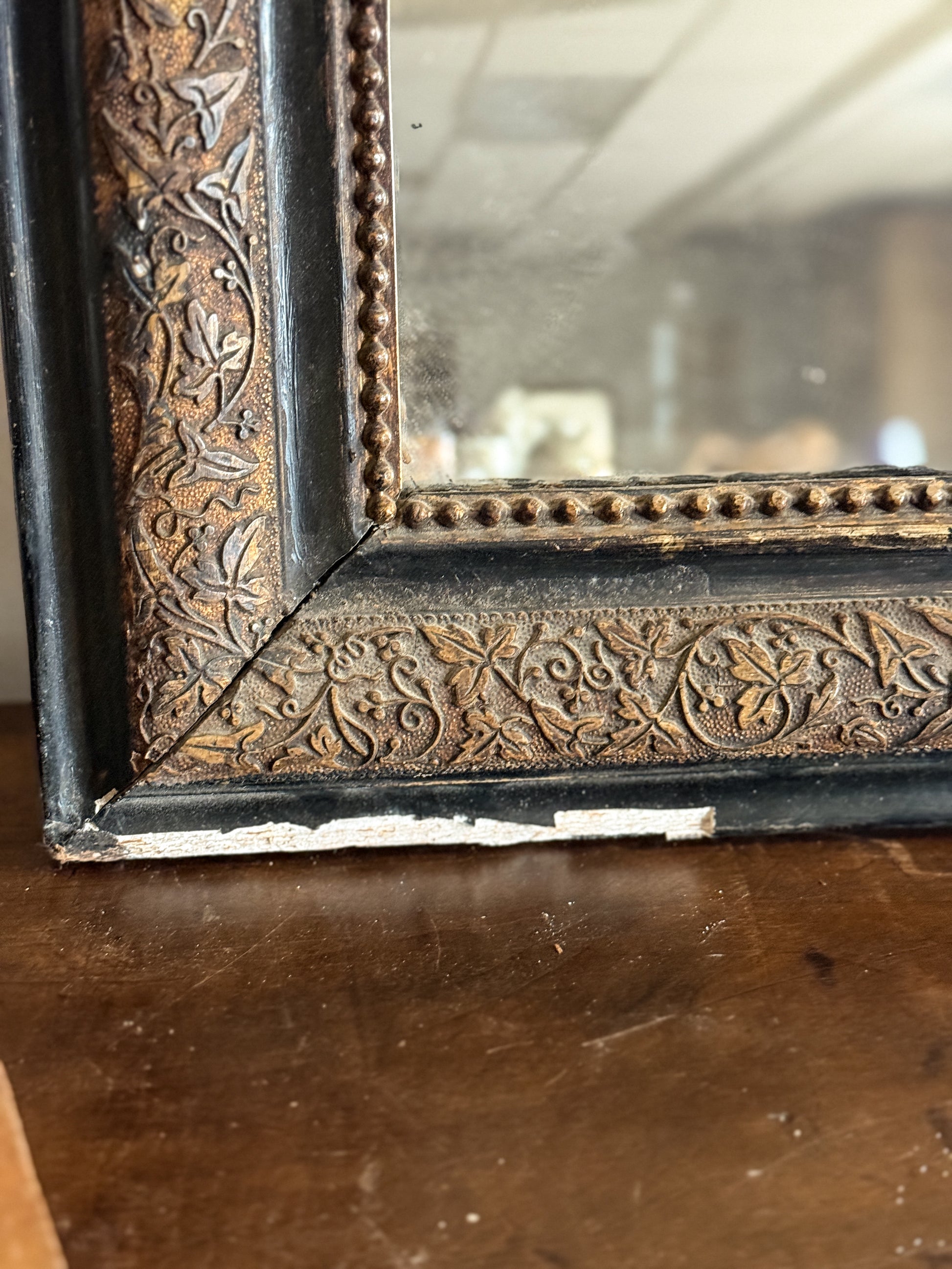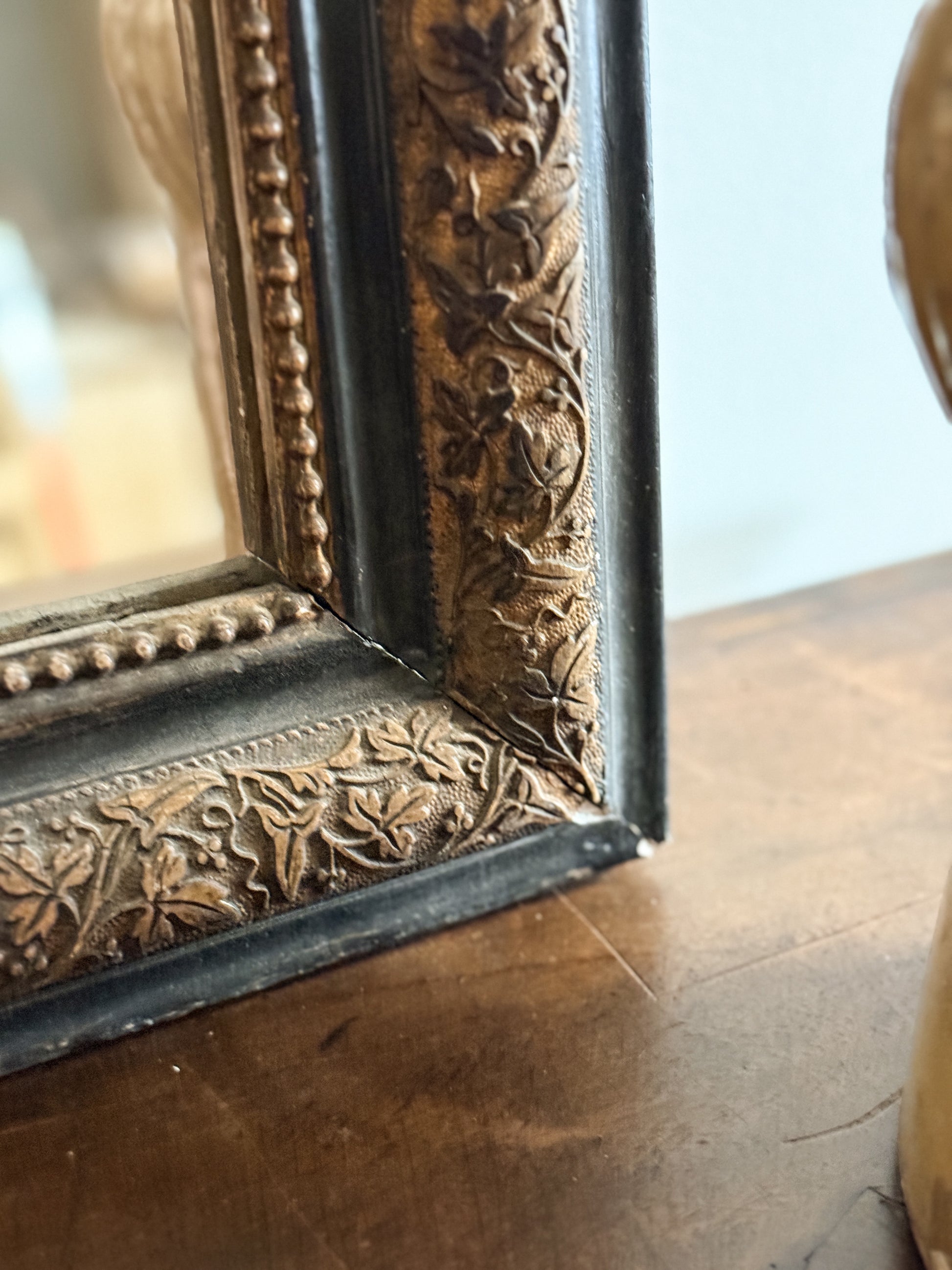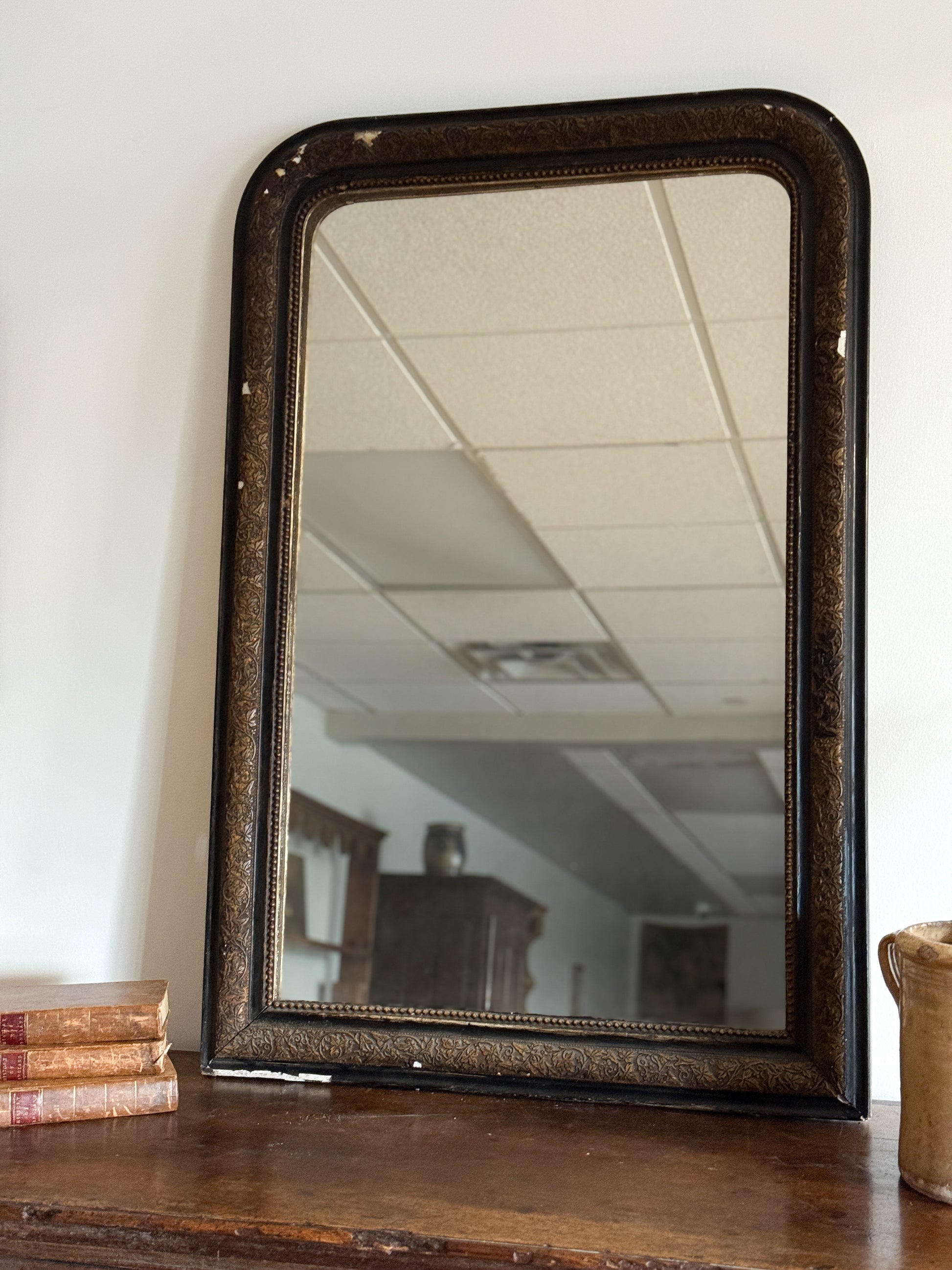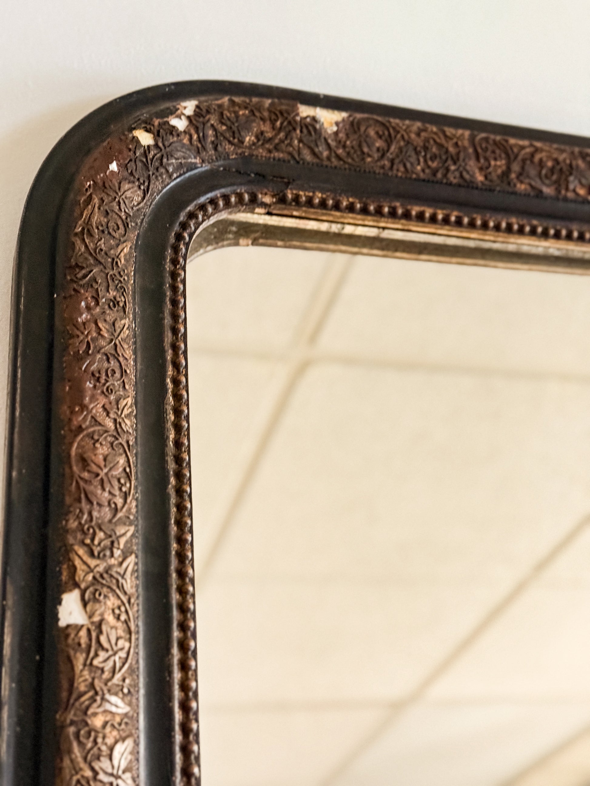 Sourced from a French château salon, this striking mirror witnessed decades of evening preparations where nobility checked their appearance before grand soirées. The deep black frame carries intricate gilt molding that still catches light beautifully, while hand-applied gold leaf shows the gentle wear of authentic age. Substantial and commanding, this piece is now ready to add authentic French character to modern bathrooms, hallways, or any space that appreciates the real thing over reproductions.