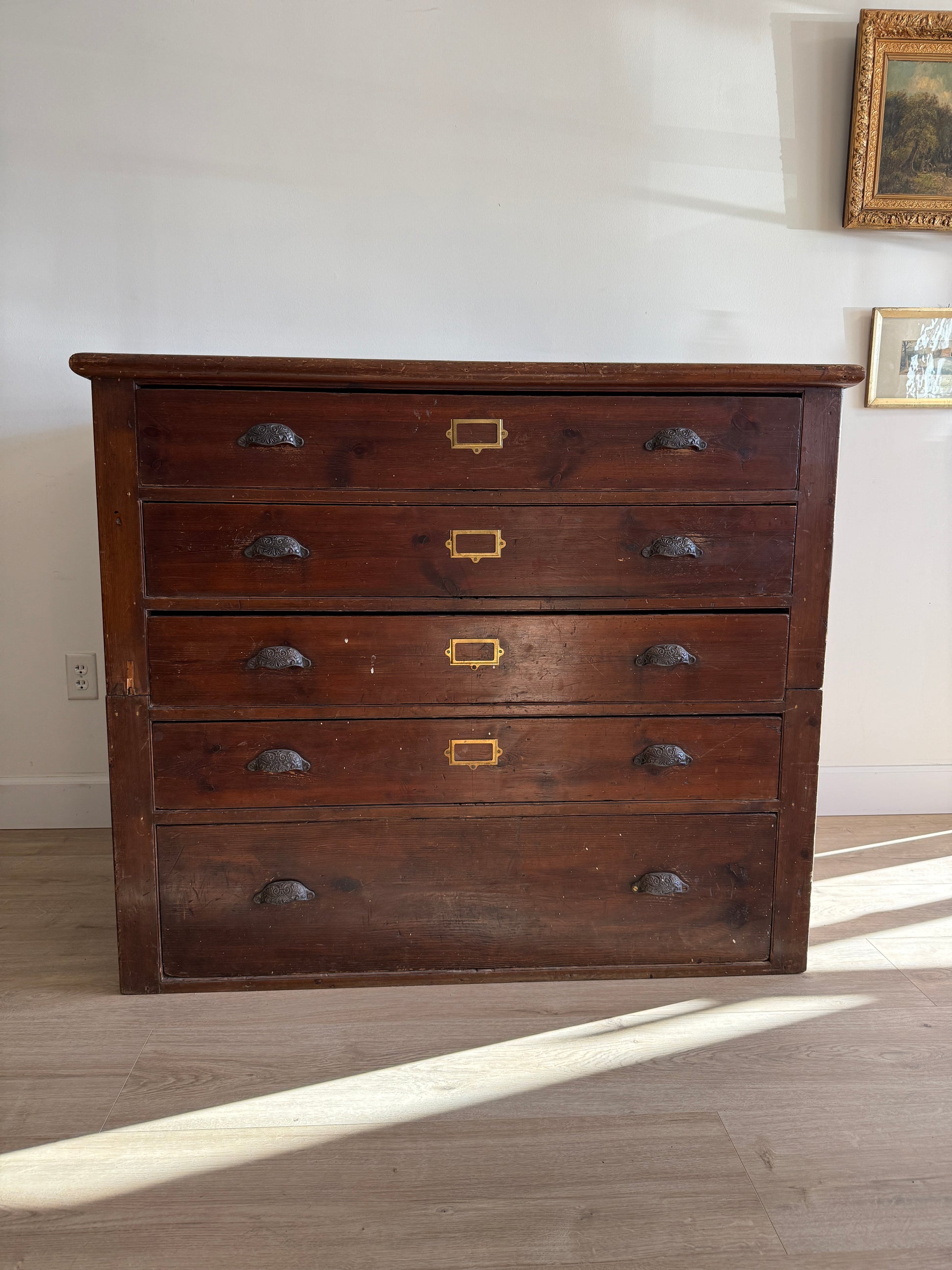 A substantial antique English filing cabinet, later adapted into a generous chest of drawers. Crafted from richly grained pine with a deep, time-worn finish, its four oversized drawers speak to its original purpose of storing ledgers and documents in a professional setting. The drawers retain their handsome cast iron cup pulls and brass card holders, details that hint at its practical past. Now, with its impressive scale and depth, the cabinet offers remarkable storage, making it equally suited for use as a statement dresser, sideboard, or linen chest in today’s home.