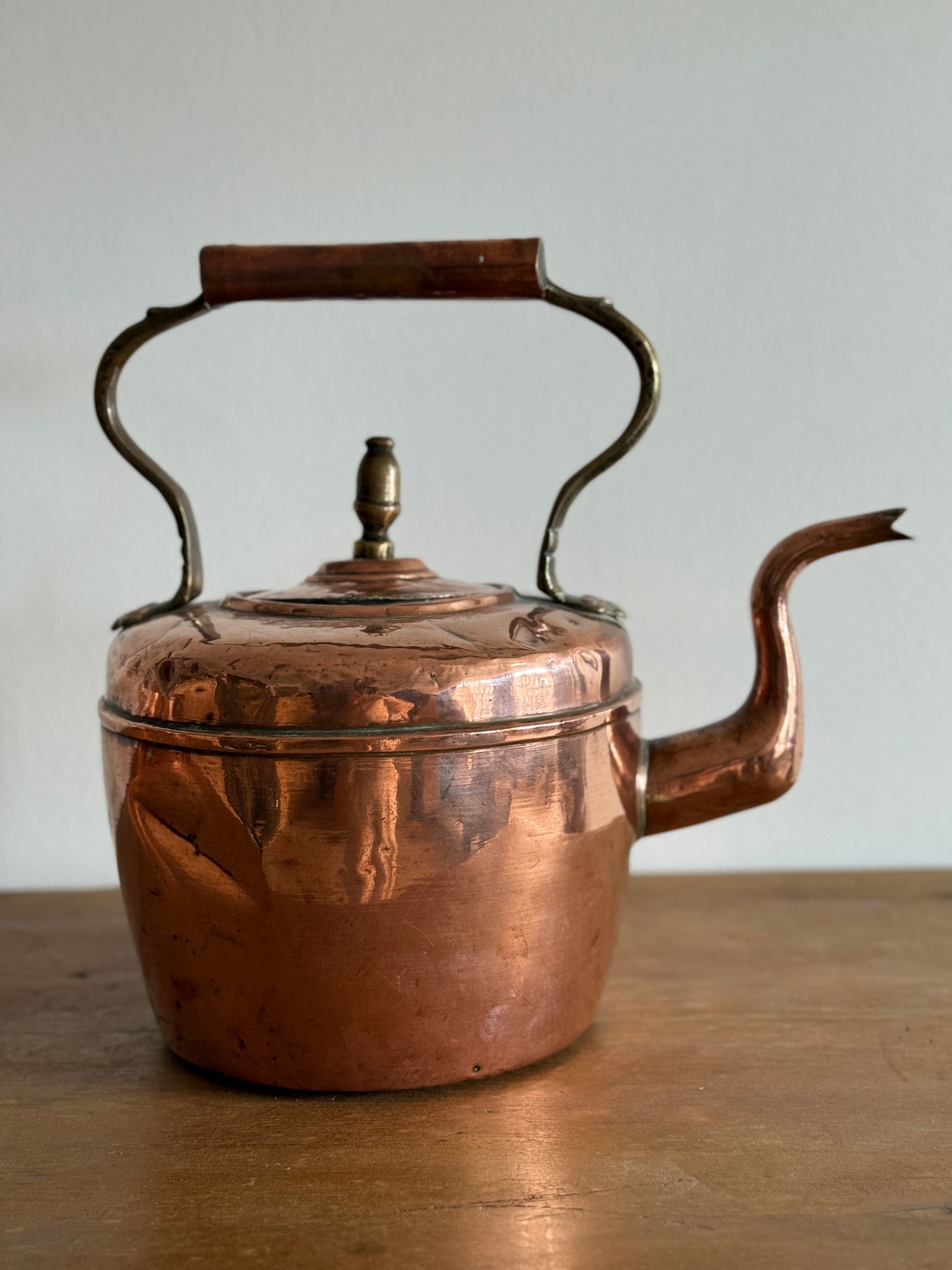 This late 19th-century English copper kettle marries utility and elegance, with a hand-raised body, domed lid topped by a brass finial, and gracefully arched handle. Its rich patina and subtle tool marks reflect decades of use, embodying the enduring charm of well-crafted domestic wares.