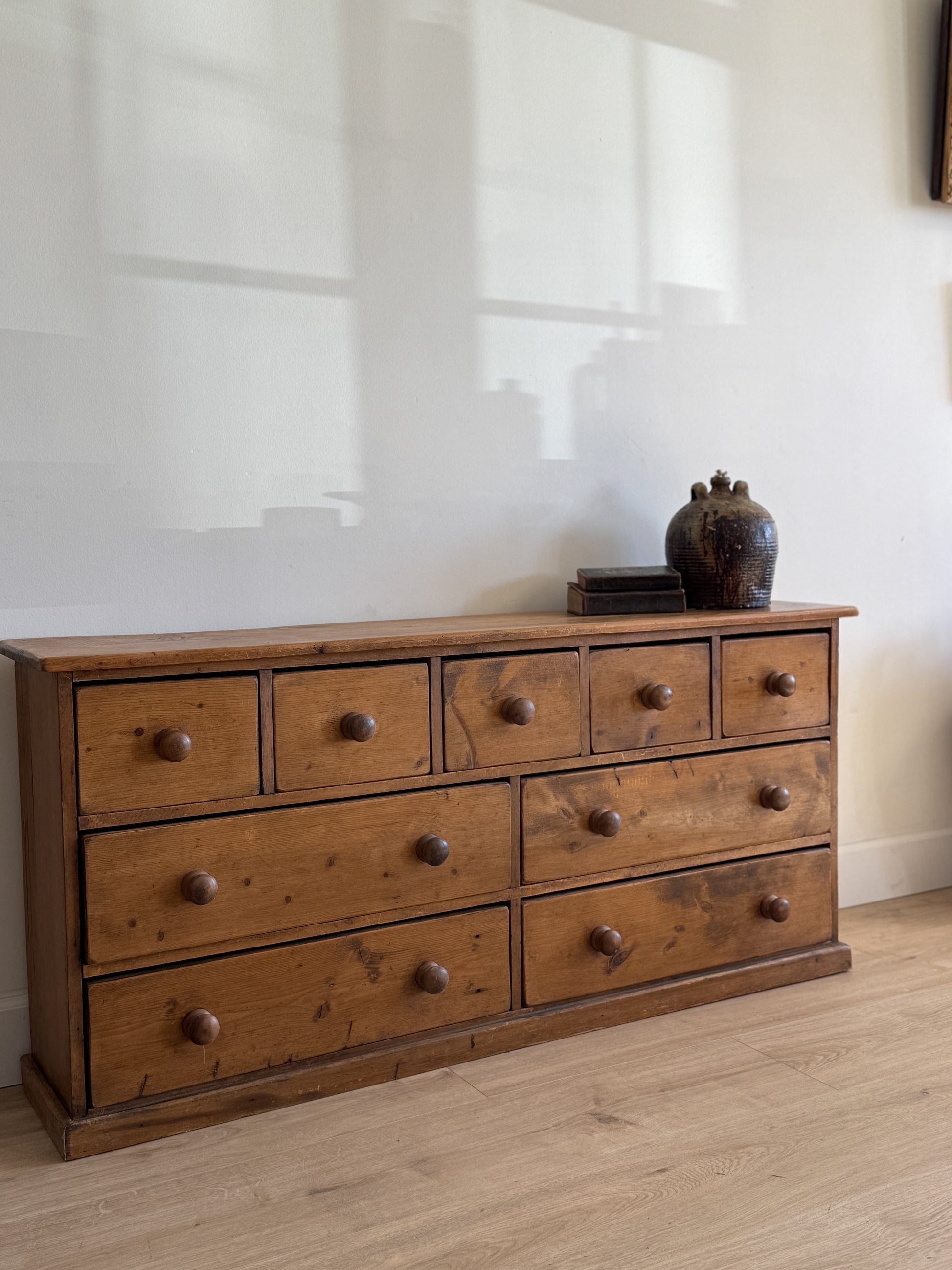 This antique English pine bank of drawers is a beautifully practical piece, built with a long, low profile and a generous run of nine drawers that make it as functional as it is visually grounding. The pine has mellowed to a warm, warm tone over time, with knots, grain shifts, and small marks that point to its workshop or farmhouse origins. Turned wooden knobs keep the look simple and true to its period, while the sturdy plinth base gives it a settled presence. Its substantial length and shallow depth make it especially versatile—perfect as a low sideboard, an entry bench with storage, or a streamlined piece for a mid-room or hallway where you want utility without bulk. Rich in texture and balanced in proportion, it brings the easy, utilitarian charm of English country furniture to any space.