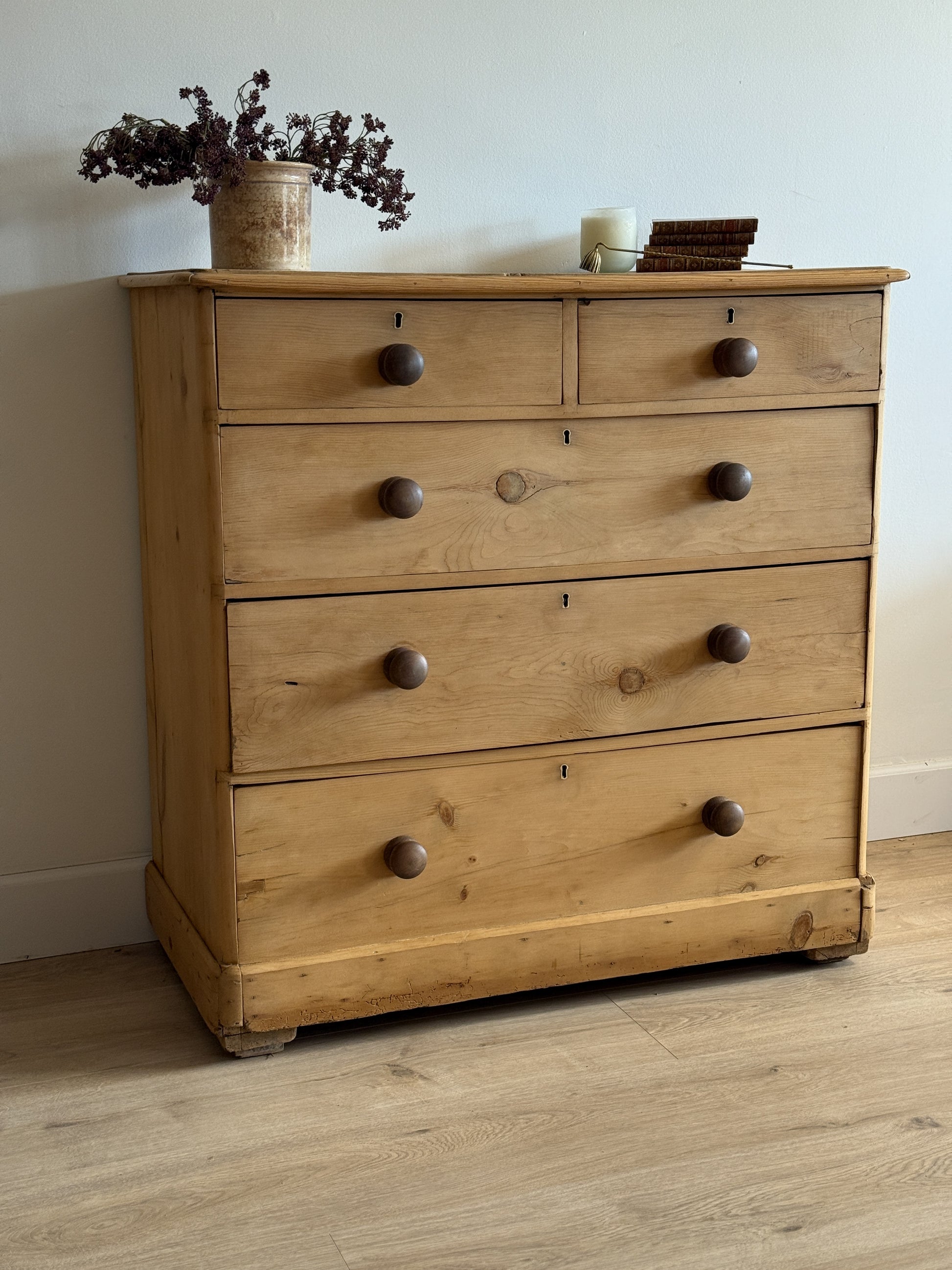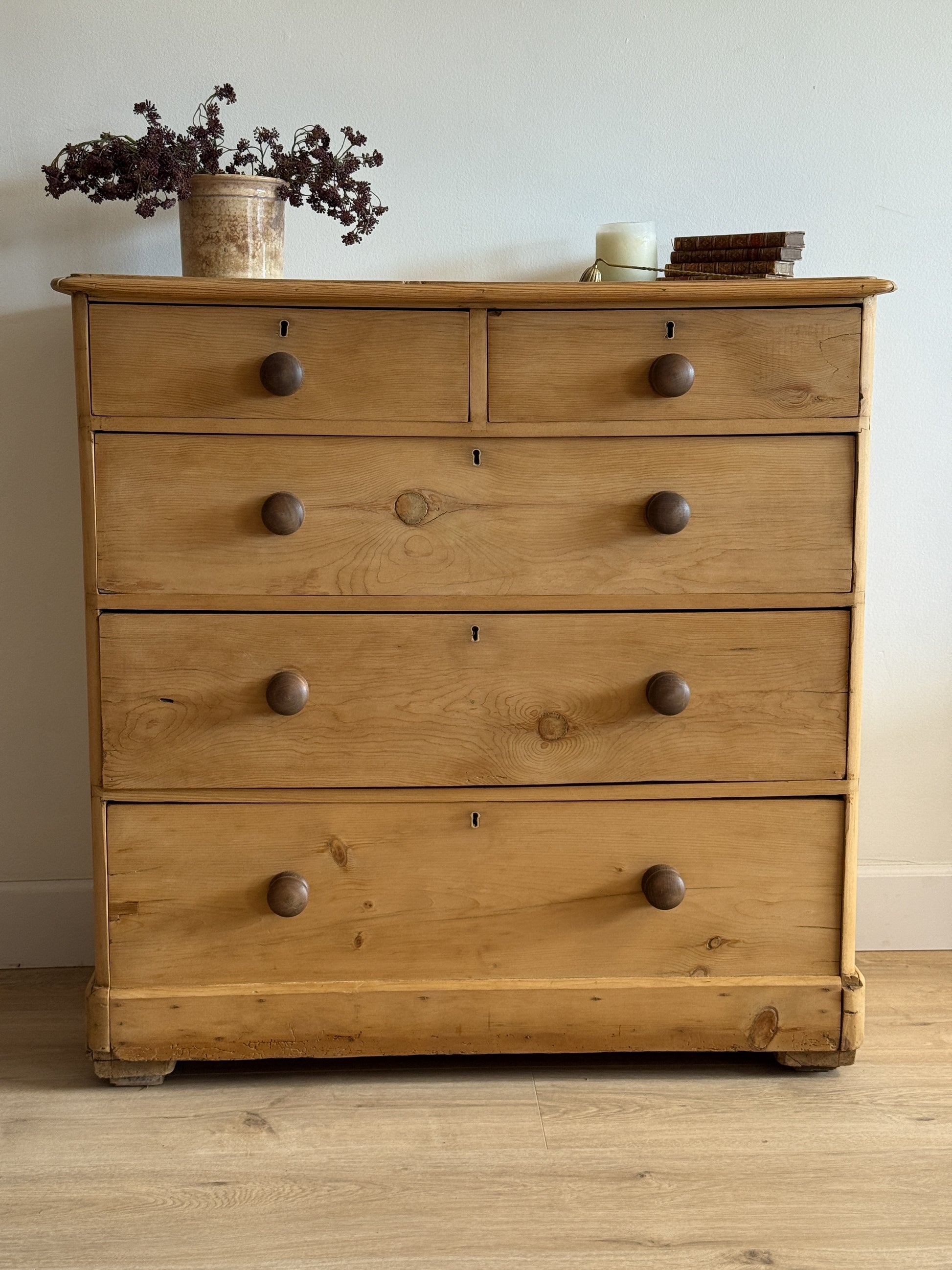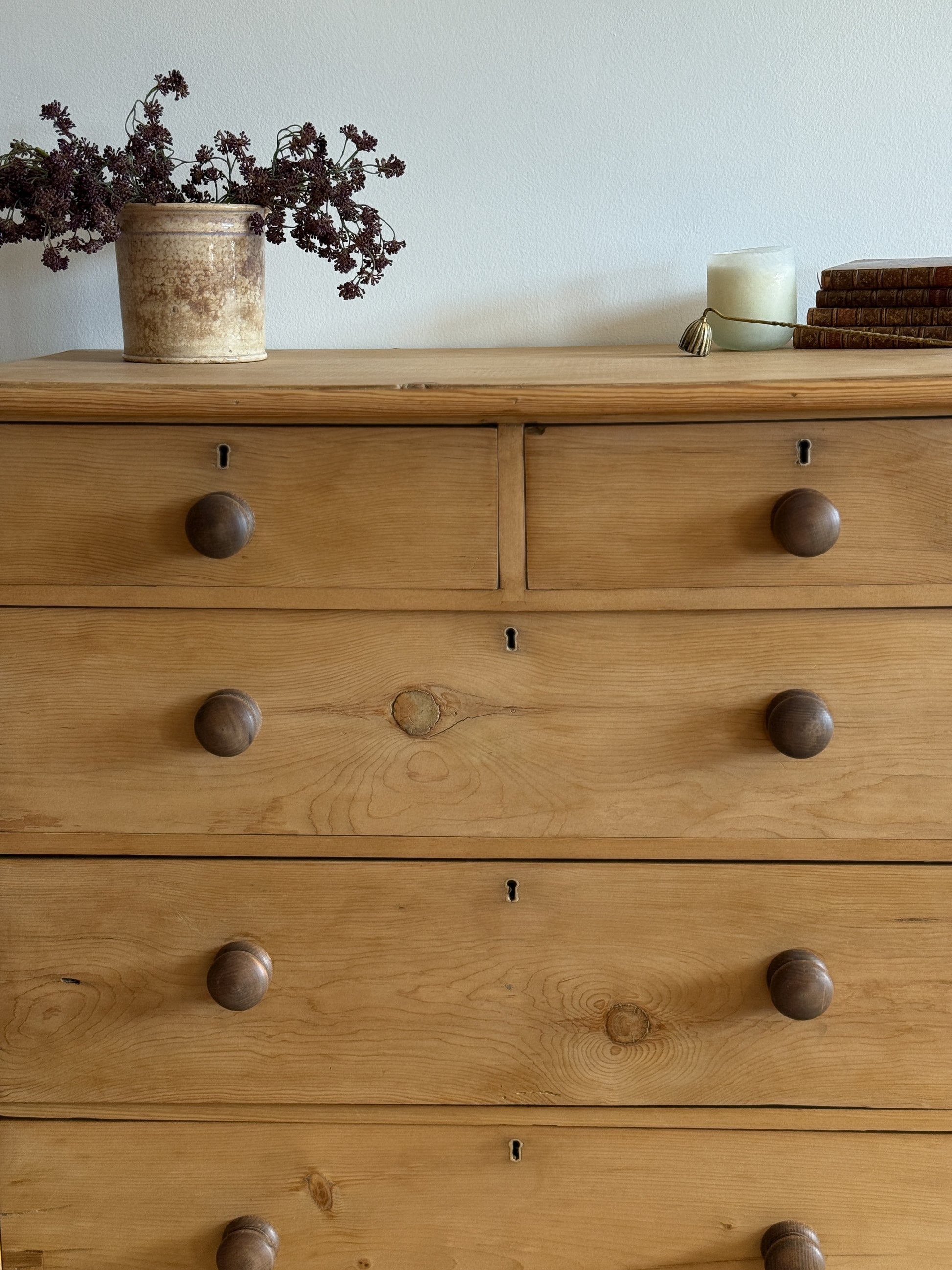 Found in an English farmhouse, this sturdy pine chest provided reliable bedroom storage for generations, its two-over-three configuration offering ample space for clothing and household linens. Each drawer features original turned knobs and keyholes, while the pine displays beautiful natural grain patterns that have aged to soft honey tones through decades of use, with traditional construction methods evident in the solid planked sides and careful joinery of country cabinetmakers.