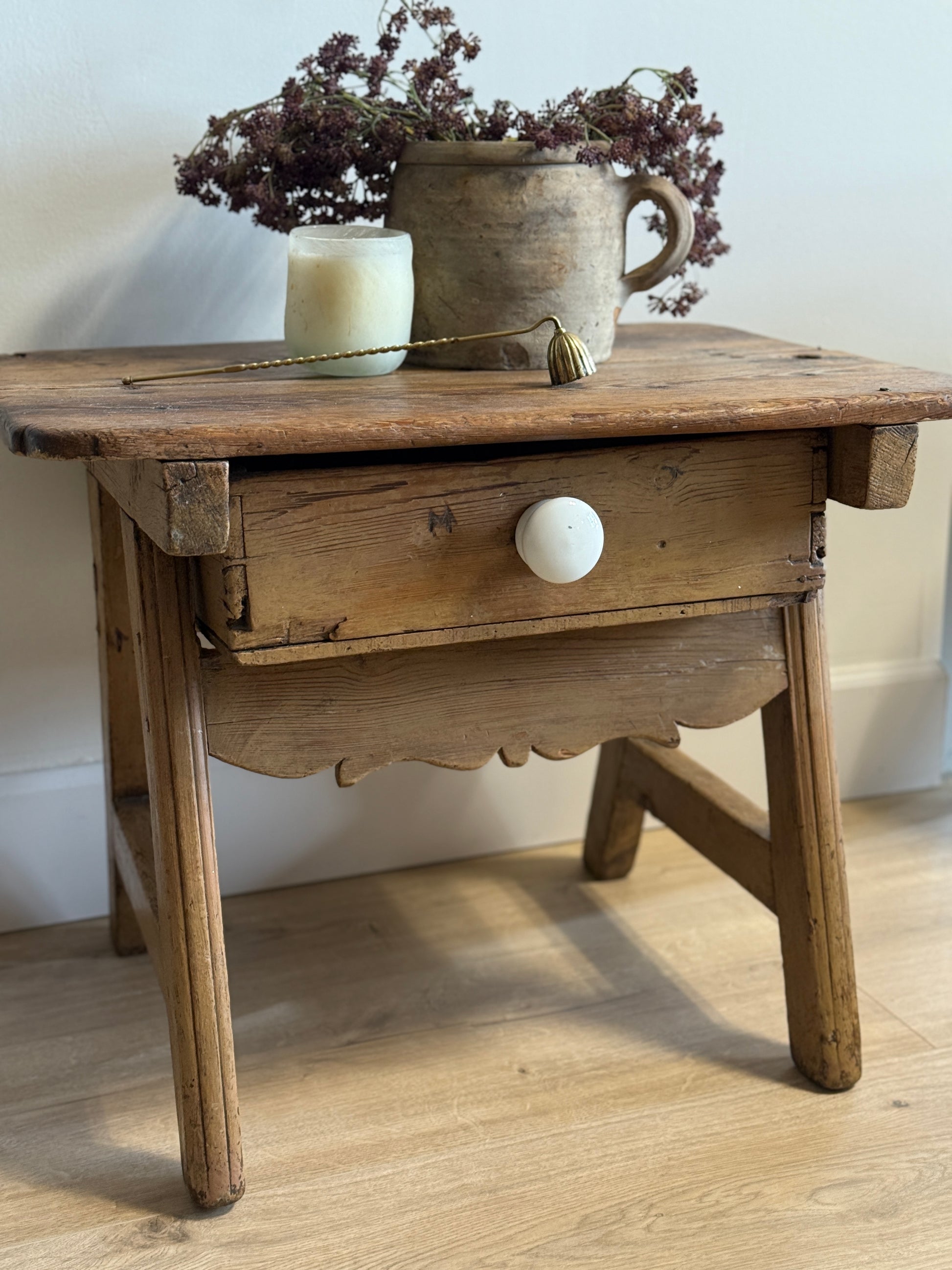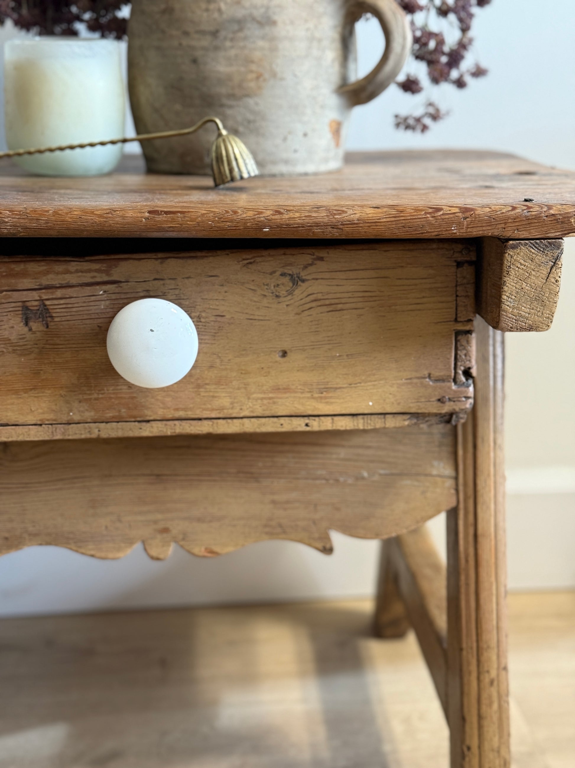 An early 19th-century French pine side table with all the rustic charm of provincial craftsmanship. The well-worn top shows the marks of long use, softened to a beautiful patina, while a single drawer with its simple porcelain knob provides just enough function. The scalloped apron adds a gentle decorative touch, balancing the straightforward form. Its smaller scale makes it an easy piece to tuck beside a chair, use as a bedside, or even as a stand-alone accent where a bit of French countryside character is desired. A humble yet soulful table that carries the quiet grace of everyday life in rural France.