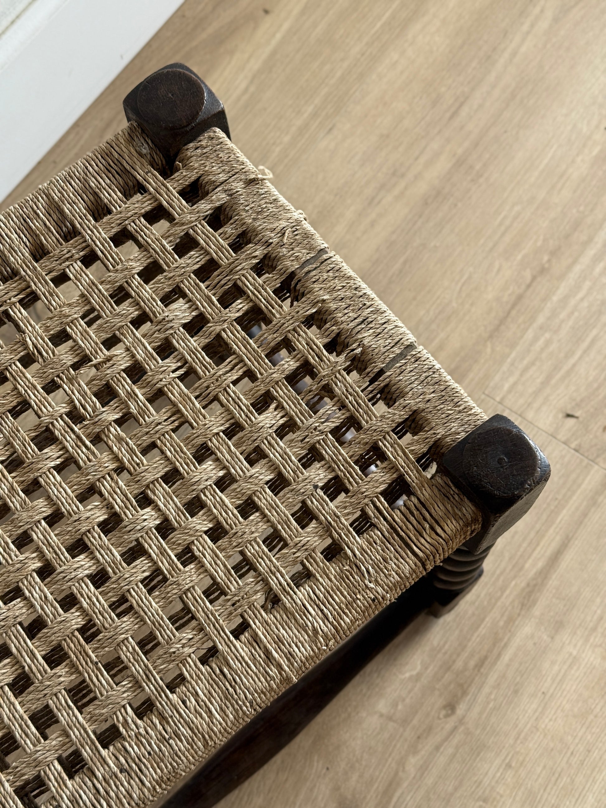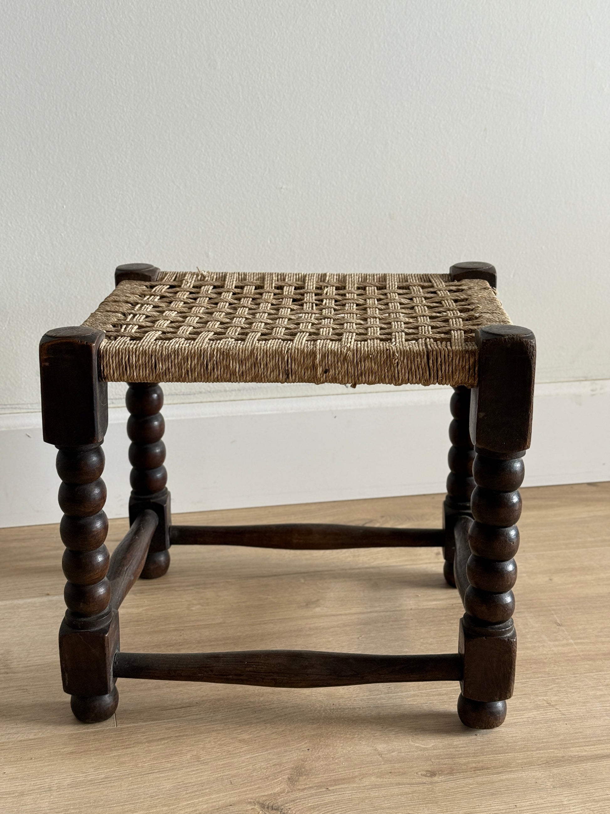 This English rush-seated stool features a tightly woven square seat in natural fiber over a sturdy oak frame. The turned legs display classic bobbin detailing and are reinforced with cross-stretchers at two levels. The rich mahogany finish has developed a lustrous patina with age, creating an attractive piece of traditional country furniture with excellent structural integrity.