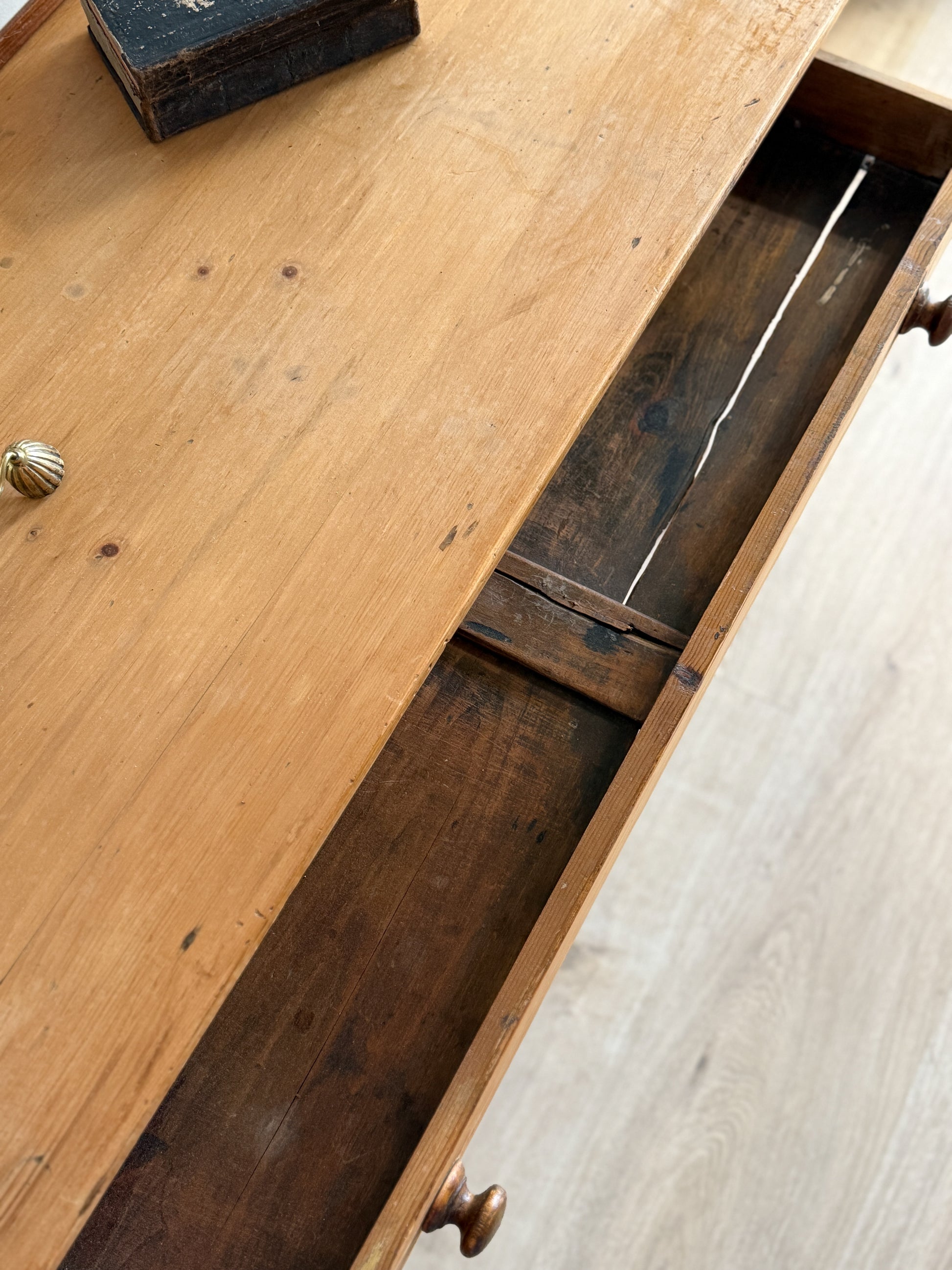 This 19th-century English pine table carries the quiet charm of country craftsmanship. Its simple form—straight lines softened by hand-turned legs—reflects a piece made for daily use, whether as a writing desk, a kitchen worktable, or a welcoming hall console. The single wide drawer glides smoothly, fitted with its original wooden knobs, and the surface shows the warm honeyed tones and subtle wear that only time can create. Honest, functional, and full of character, it brings an inviting, understated presence to any room.