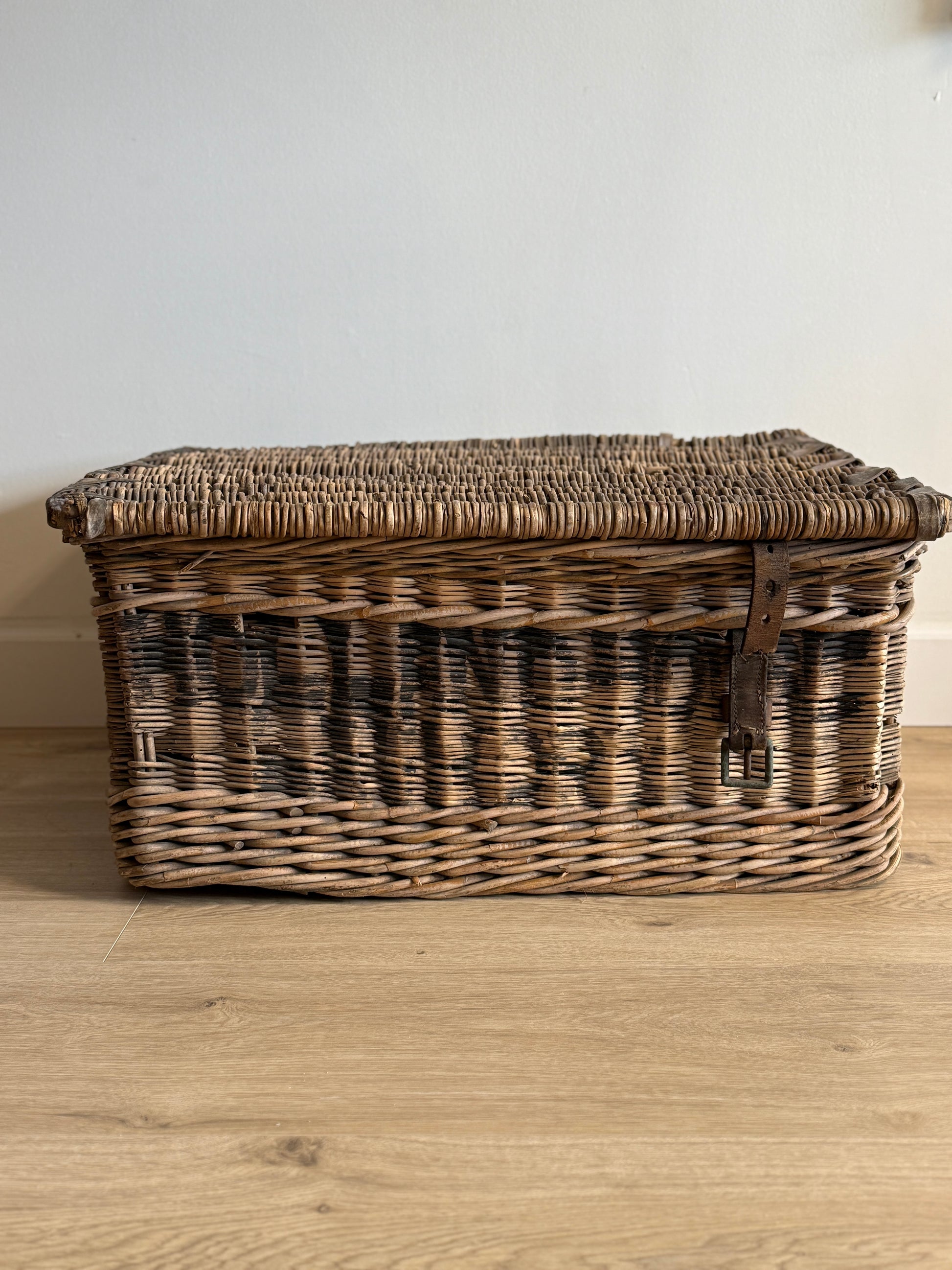 An antique English wicker trunk, sturdily woven with a time-softened surface and secured by a leather strap closure. What makes this piece particularly unique is the woven leather reinforcement along the rim—a detail rarely found on baskets of this type, speaking to both its craftsmanship and intended durability. Historically, baskets like this served as indispensable carriers in English households and markets through the 19th and early 20th centuries, holding laundry, linens, produce, or provisions bound for travel. The willow has aged beautifully, with rich tonal variations from years of handling and use, while the leather accents add both strength and character. A piece that bridges utility and history, it remains just as practical today for storing throws, firewood, or everyday essentials, while offering a distinctive presence in any room.