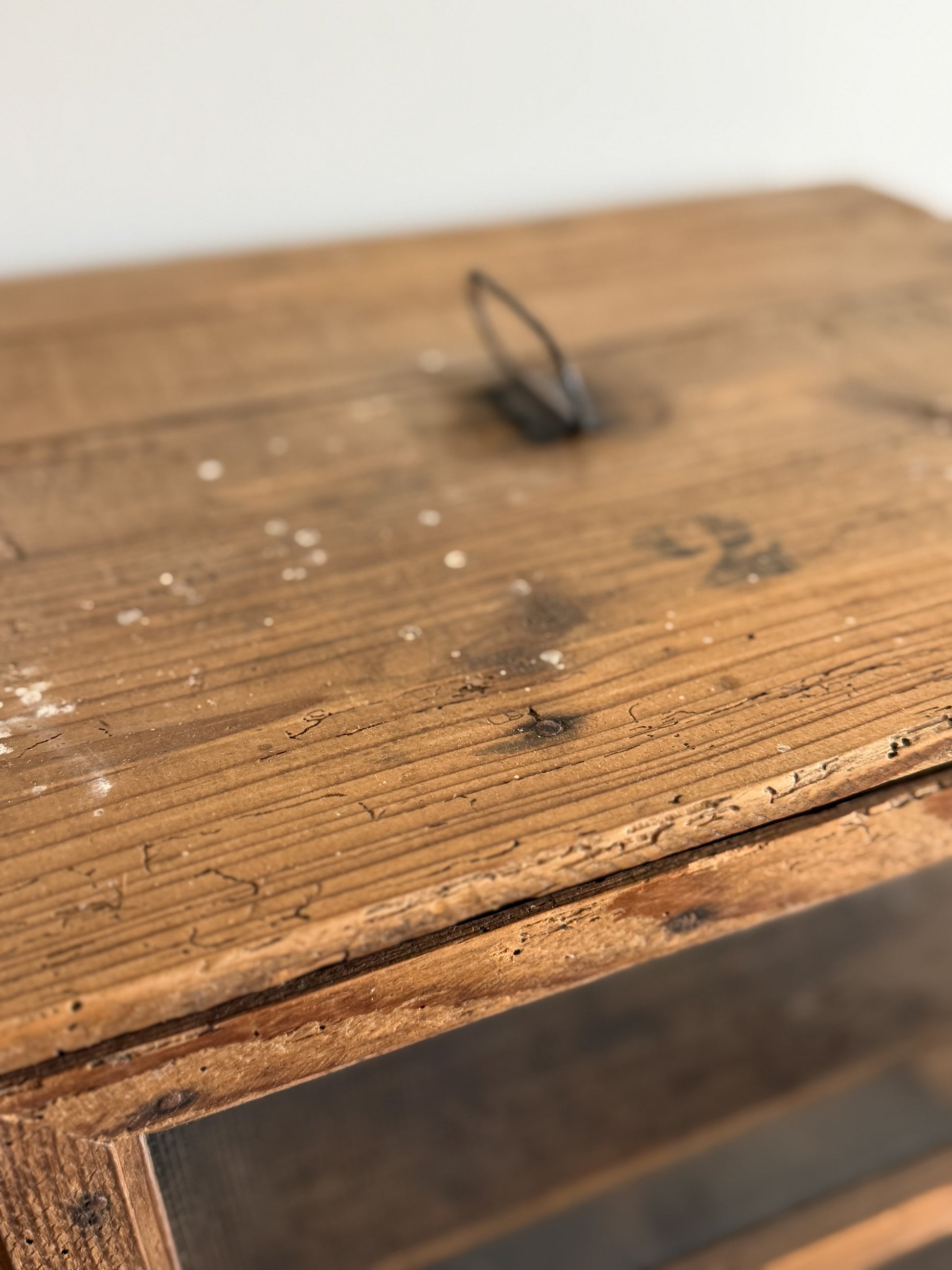 This petite antique French food safe, crafted from timeworn pine, carries the quiet simplicity of rural 19th-century life. Once used to store meat, baked goods, or cheese, it retains its original wire mesh panels—designed to keep food cool and protected—now lending it a beautifully rustic transparency. The joinery remains tight, with traces of old hand-forged hardware and the soft, uneven grain that only age can create. Its small scale makes it an easy fit atop a counter, sideboard, or open shelving, where it brings a touch of farmhouse authenticity and the patina of use earned over generations. Found in southern France.