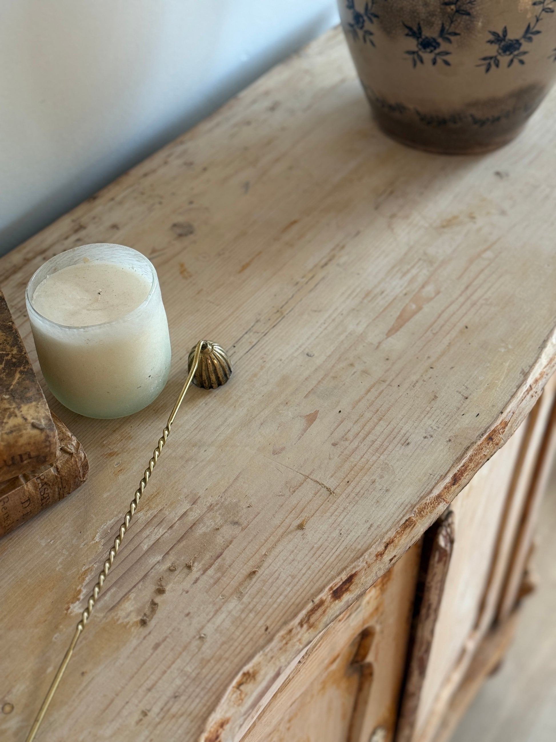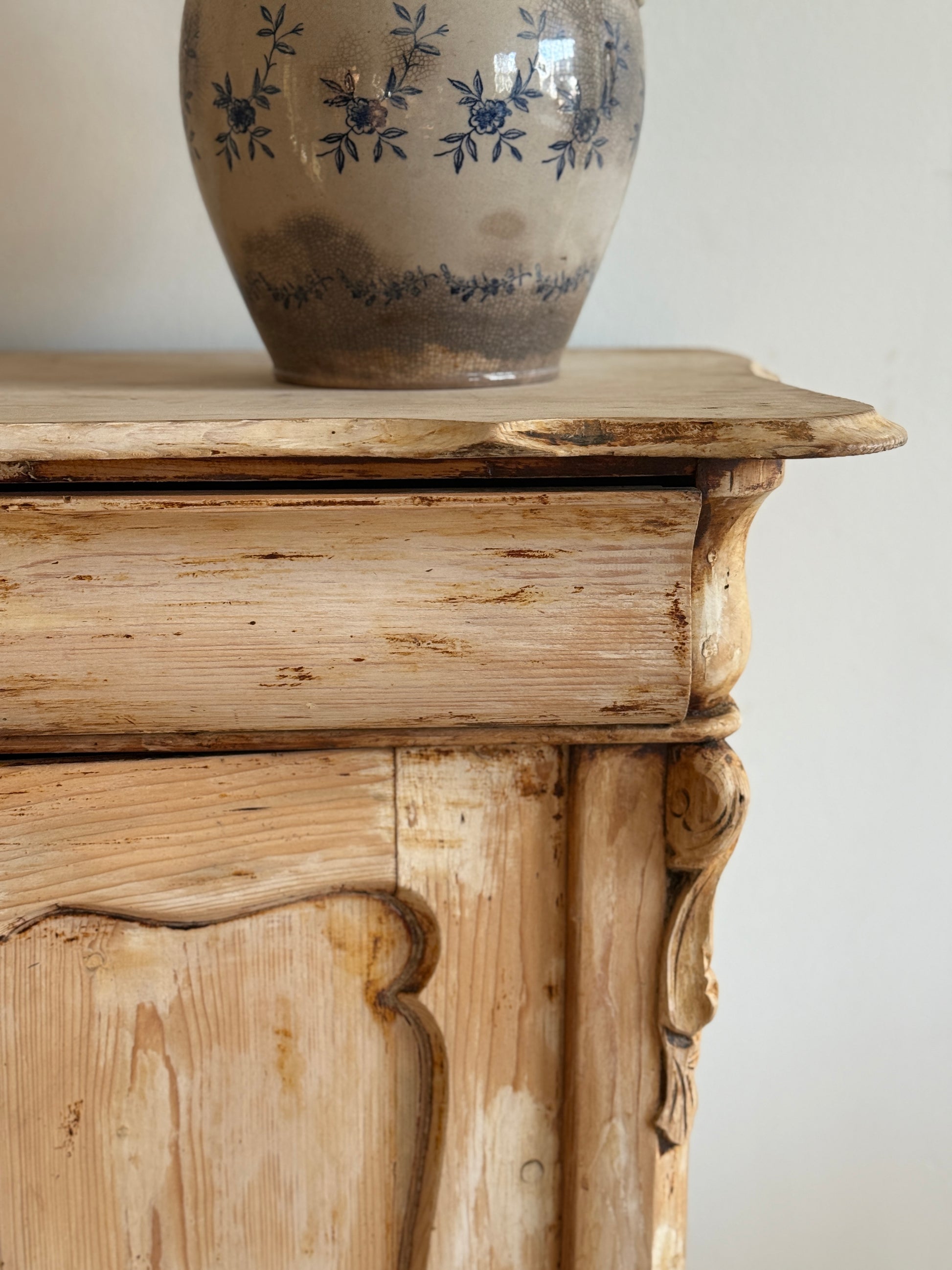 This antique French commode/sideboard is a beautifully worn piece, full of quiet detail and centuries of use. Crafted in solid wood with softly carved panel doors, it carries a pale, time-softened finish that highlights the natural grain, subtle tool marks, and areas of original wear earned over generations. The proportions are especially pleasing—substantial yet approachable—making it as suited to a dining space or entry as it is to a bedroom or kitchen. Inside, generous storage sits behind the paneled doors, while delicate carved accents along the corners and apron add just enough ornament without feeling formal. A soulful French piece that brings warmth, texture, and a lived-in elegance to any space.