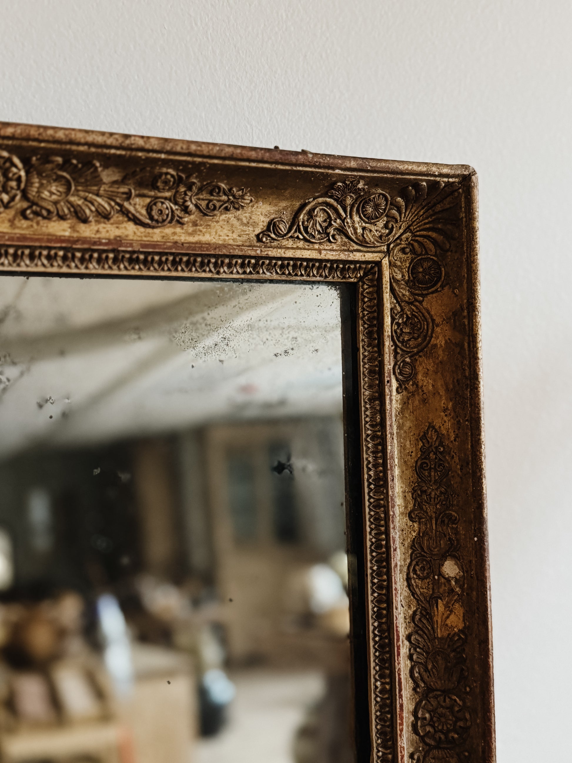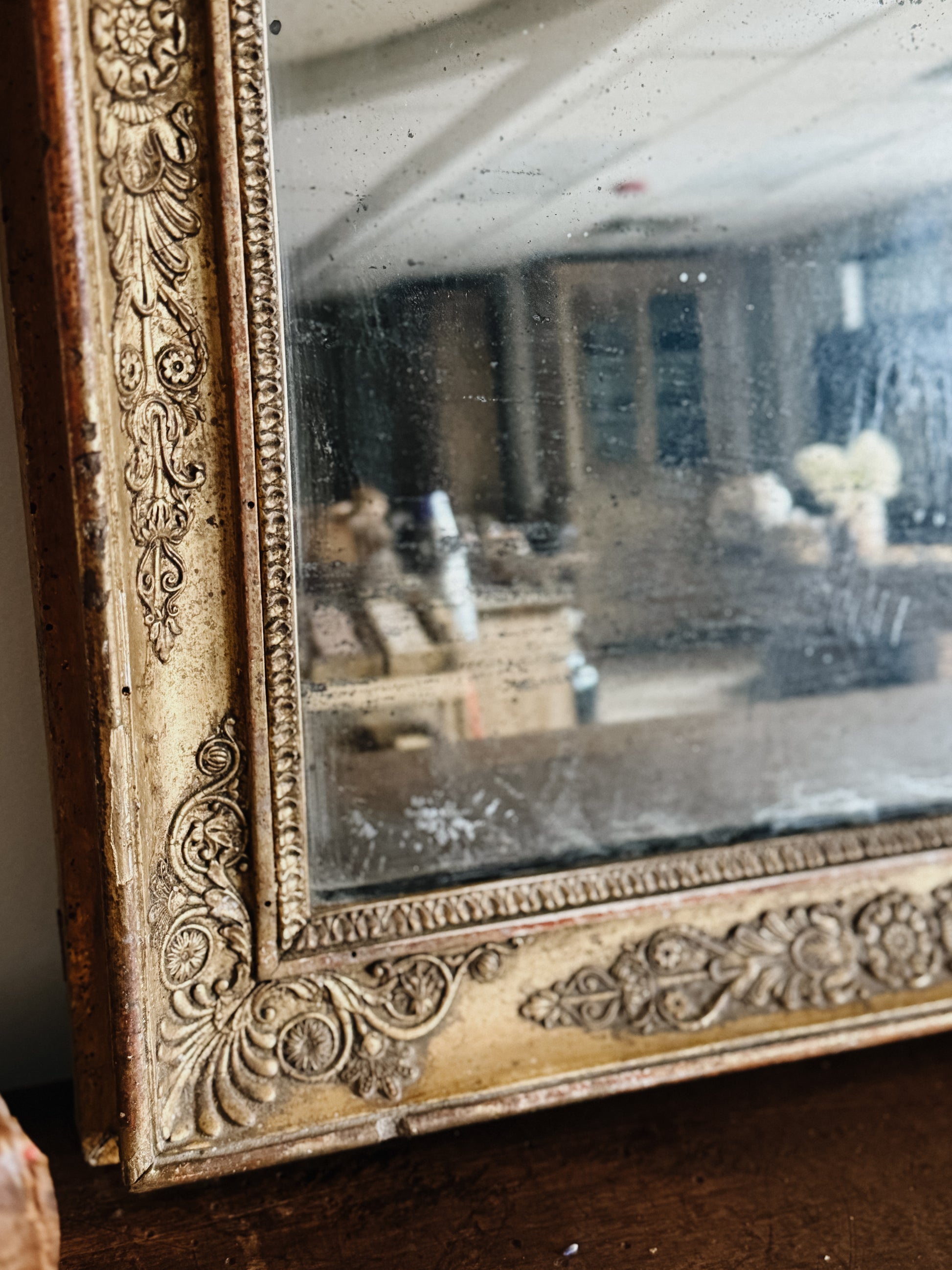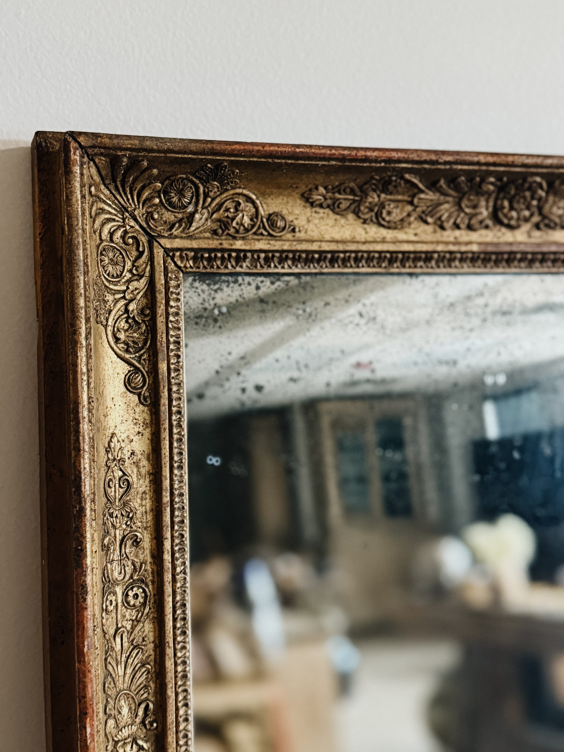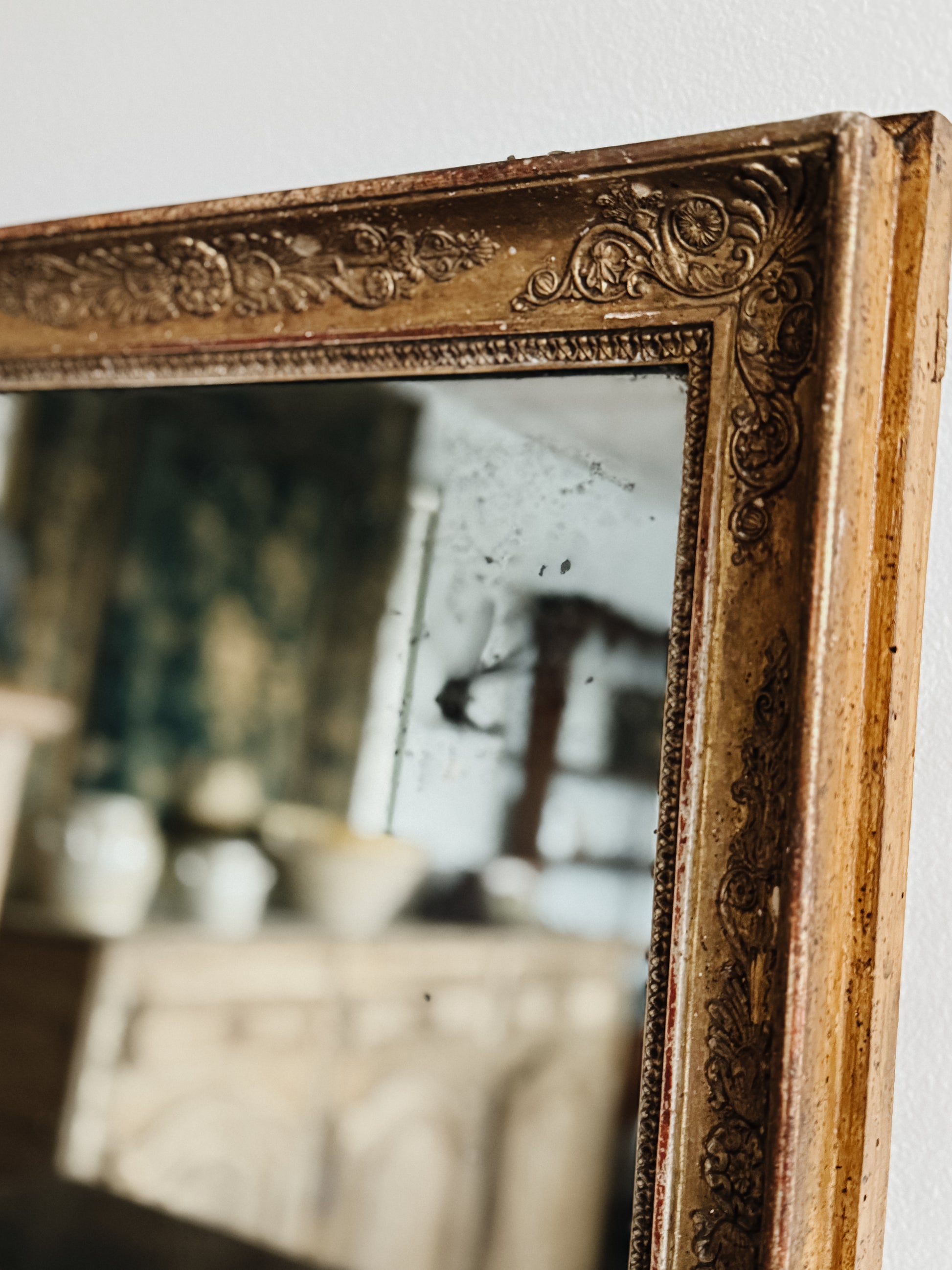 Sourced from a French estate, this ornate yet clean lined mirror graced a bedroom wall. Hand-carved florals and scrollwork cascade around the perimeter, each detail crisp despite many years of gentle wear. The gold leaf shows patina in the raised areas while deeper recesses retain their original brilliance. Original mercury glass bears the foxing that marks genuine period pieces. Substantial enough to command attention yet perfectly proportioned for intimate spaces.
