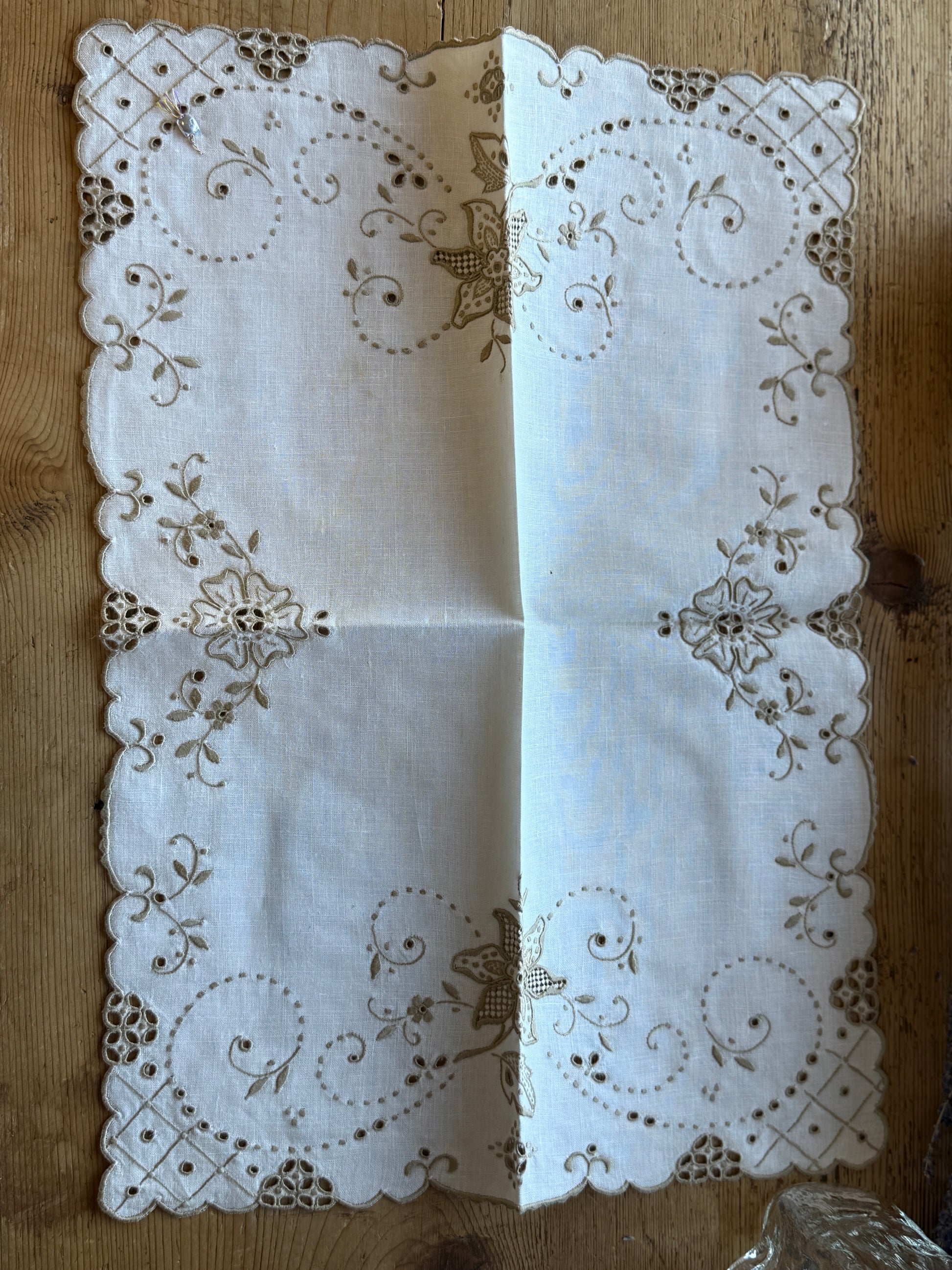 This 1920s Irish linen, still bearing its original seal, is a beautifully preserved example of early handwork—stitched in soft ecru with scrolling satin-stitch embroidery, tiny padded dots, and openwork lattice corners that frame the scalloped edges with quiet refinement. Its crisp, century-old linen drape and balanced floral motifs make it lovely displayed as a textile, but it would be equally striking repurposed as the front of a custom pillow, allowing the delicate embroidery to become the focal point once again.