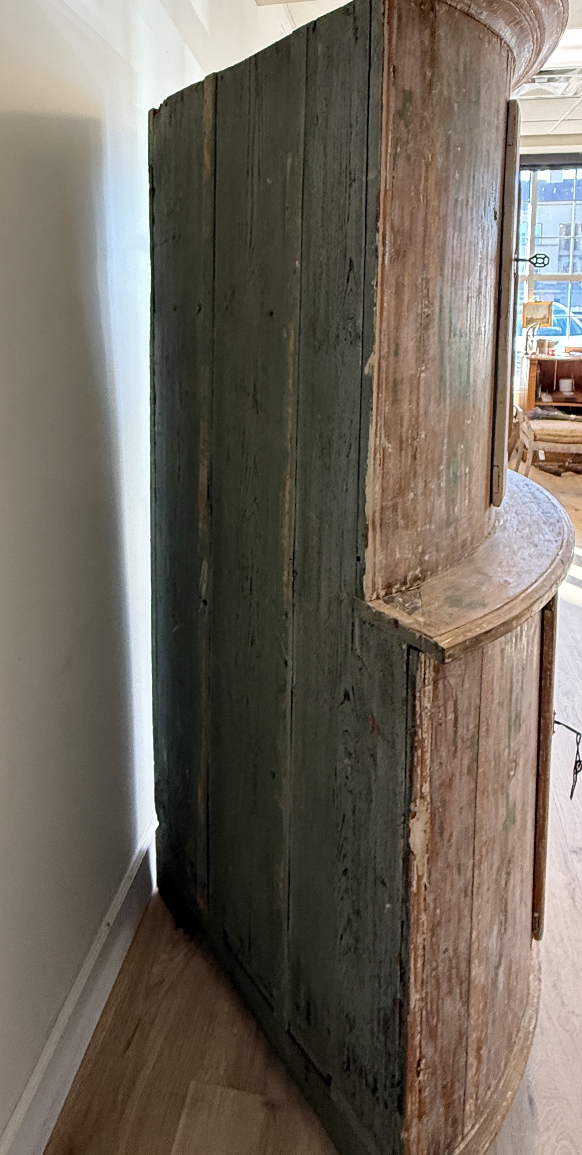 This antique Swedish corner cupboard is a striking study in form and age. Designed to nest into a corner, its rounded front and paneled doors create an architectural silhouette that feels both grounded and unexpected. The original painted surface has worn back over time to reveal a soft interplay of muted greens and warm wood tones, giving the piece a depth that can’t be replicated. Inside, the cupboard offers generous storage, making it as functional as it is visually compelling. A beautiful example of Scandinavian craftsmanship, this piece brings texture, history, and an unmistakable sense of place to any room it inhabits.