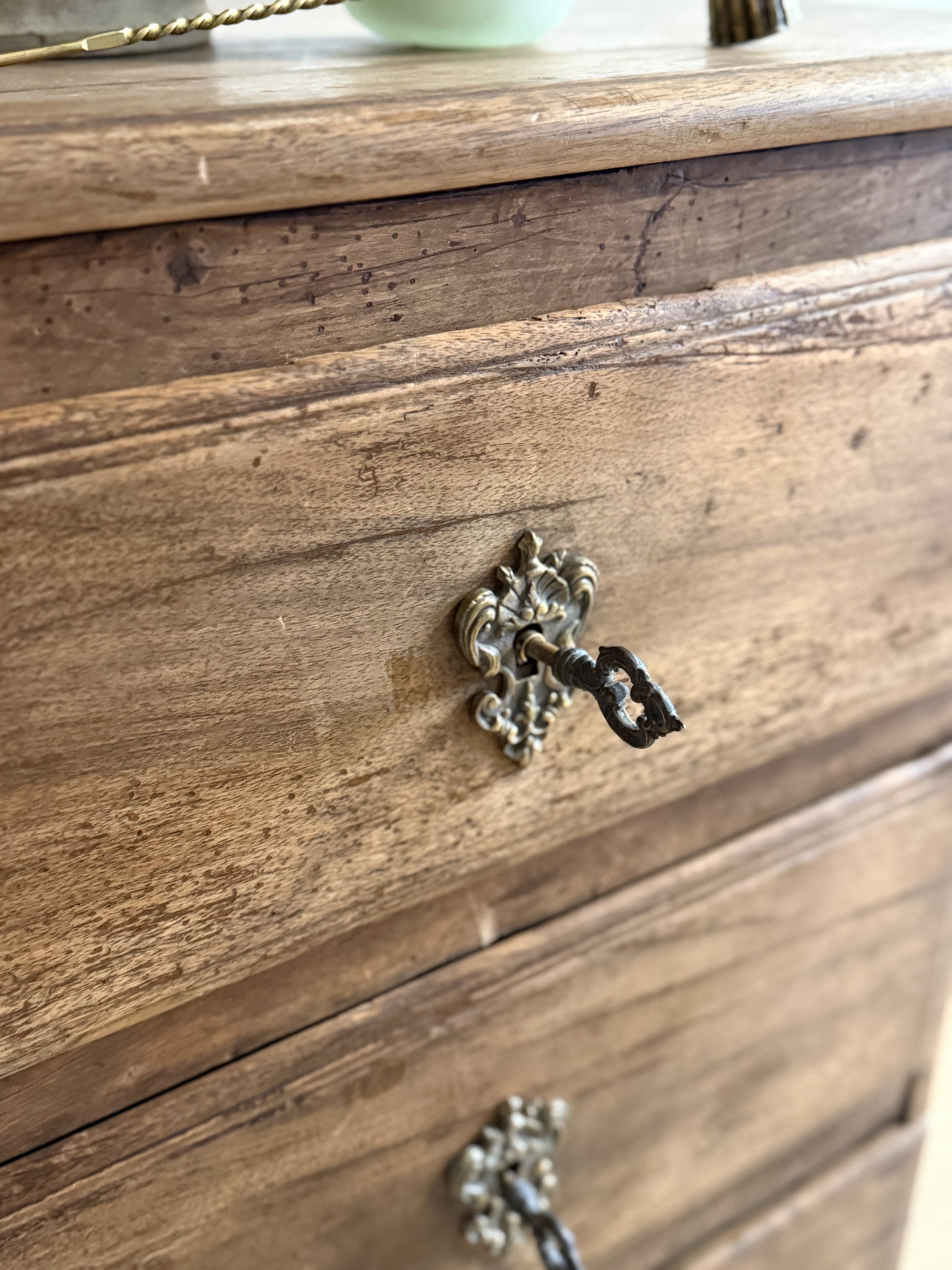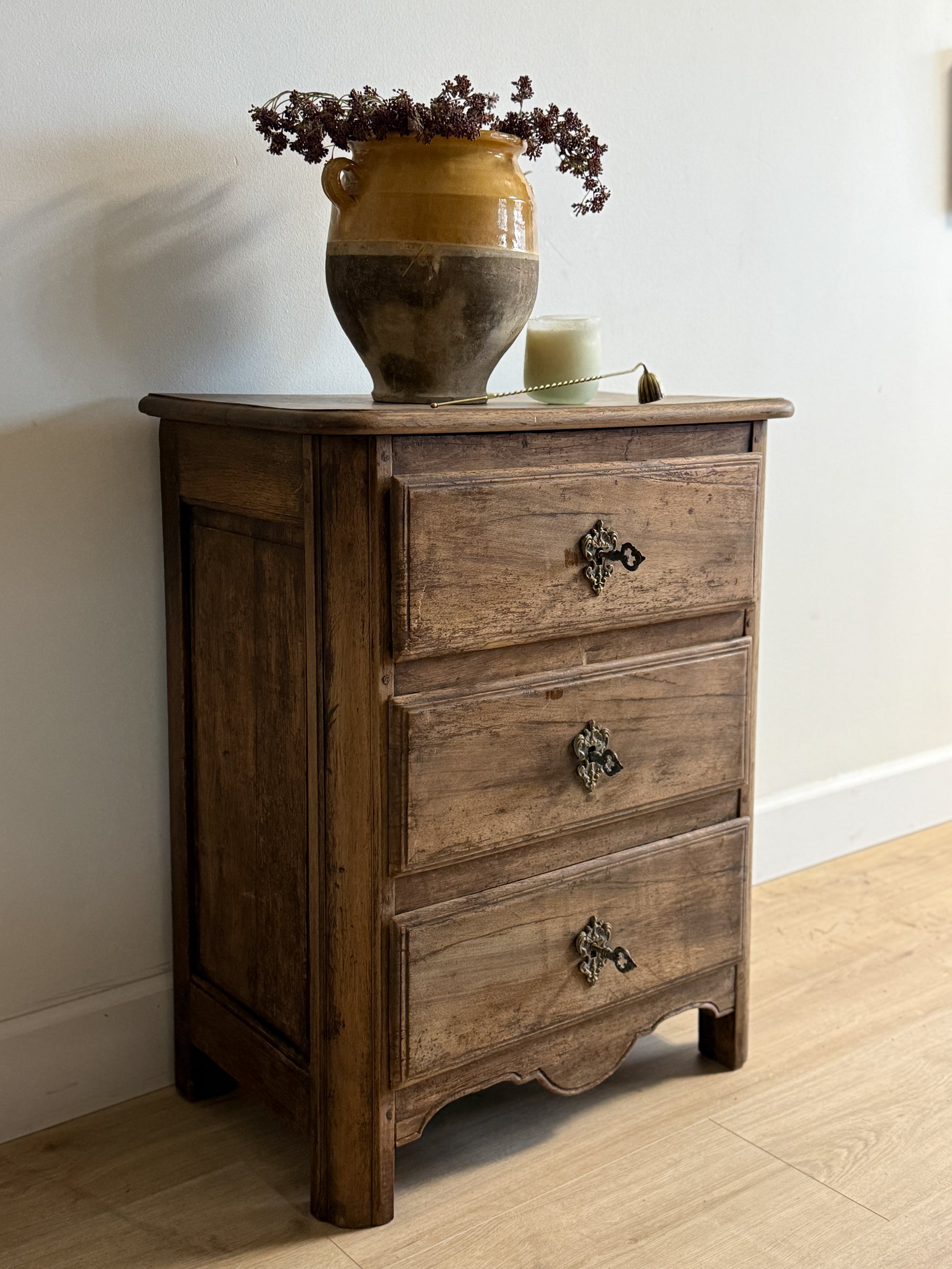An early 19th-century walnut commode with three graduated drawers, each framed in simple molding and fitted with its original brass escutcheons and key. The warm walnut surface bears a soft, time-polished sheen that highlights the beauty of the grain and craftsmanship. Its compact scale makes it a versatile piece — equally at home as a bedside chest, entry accent, or small storage cabinet — bringing understated French charm and balance to any space.