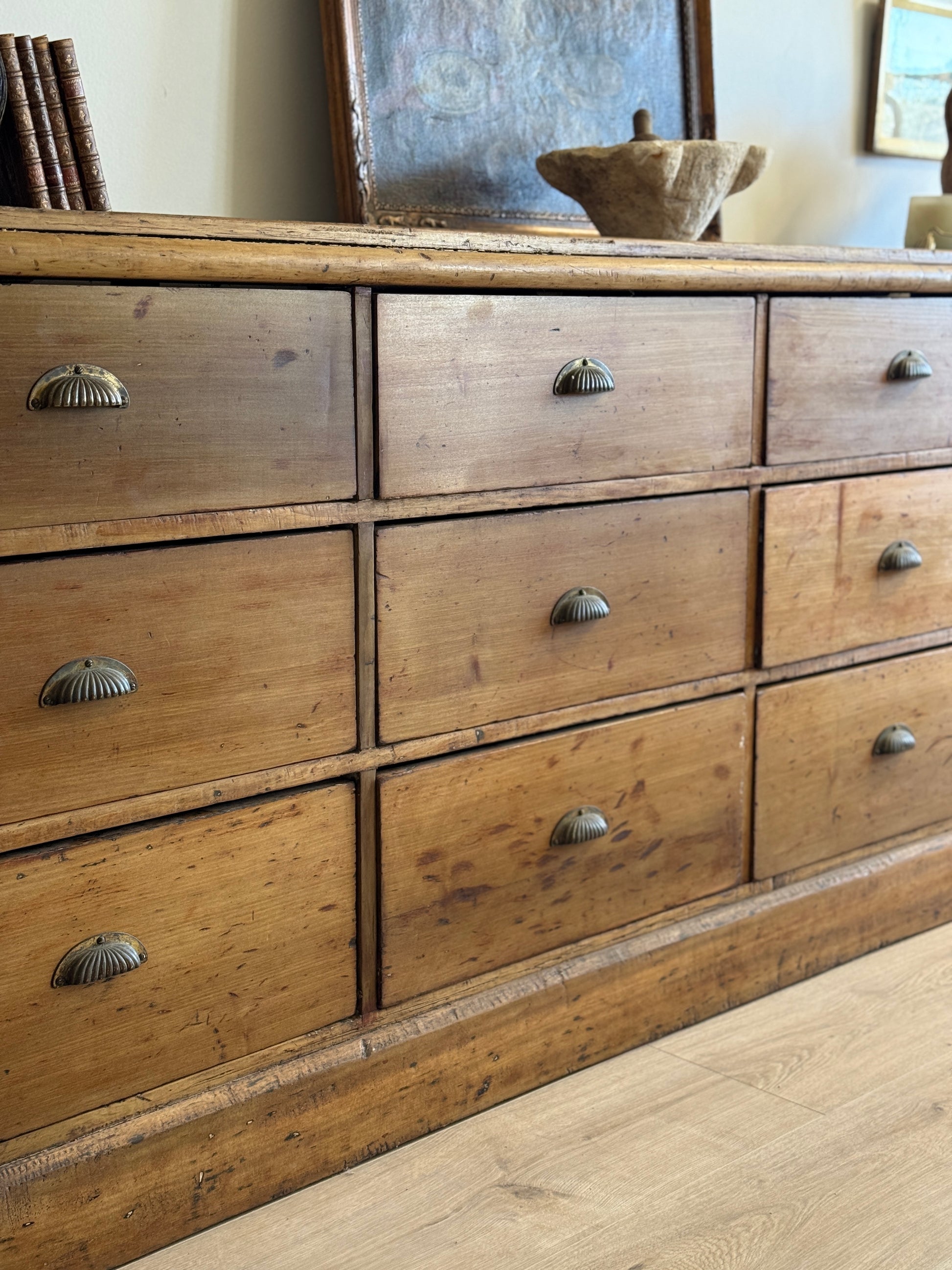 A rare antique English shop counter, c. late 19th century, discovered in a centuries-old shop where it was used for generations. Its twelve deep drawers are each fitted with original shell-form bin pulls, lending a distinctive detail against the warm, honeyed finish. The broad proportions and sturdy plinth base give it a grounded presence, while the surface shows the kind of honest wear only earned through decades of service. Both practical and striking, it offers remarkable storage and would be extraordinary repurposed as a kitchen island, sideboard, or statement counter.