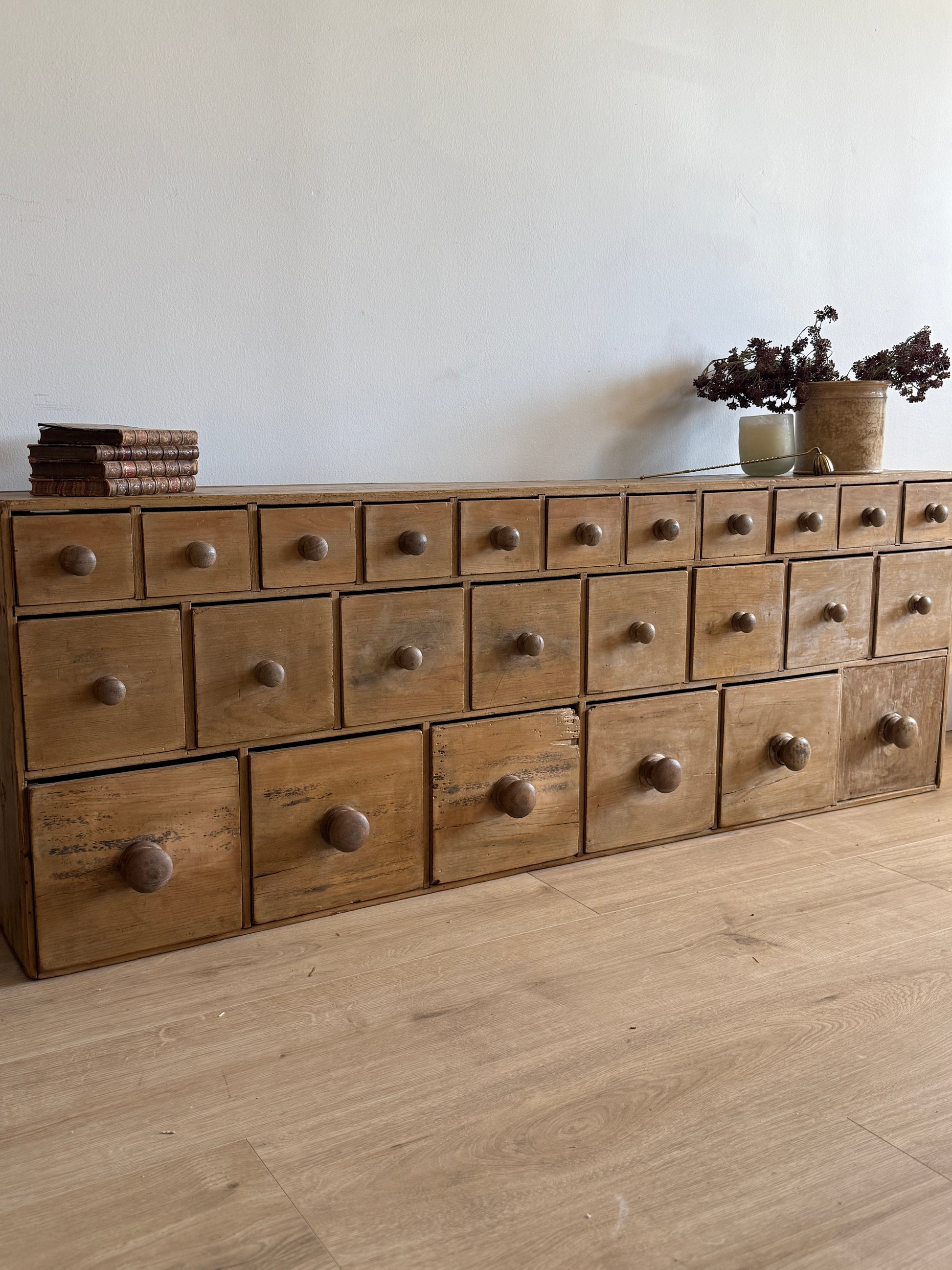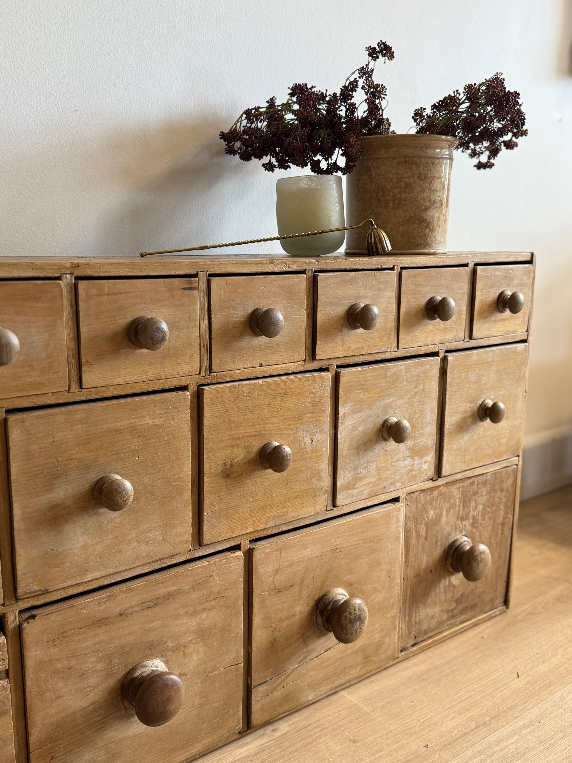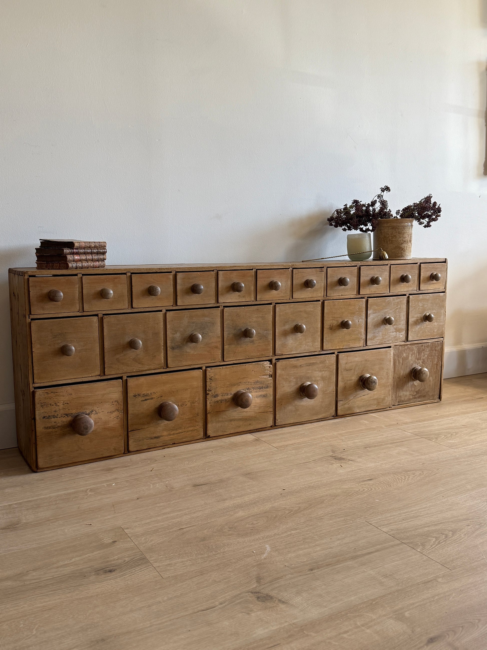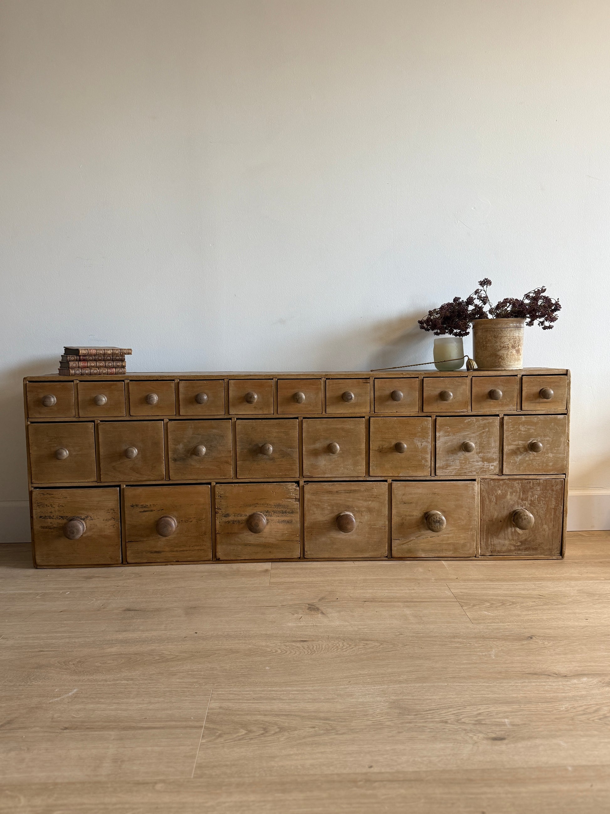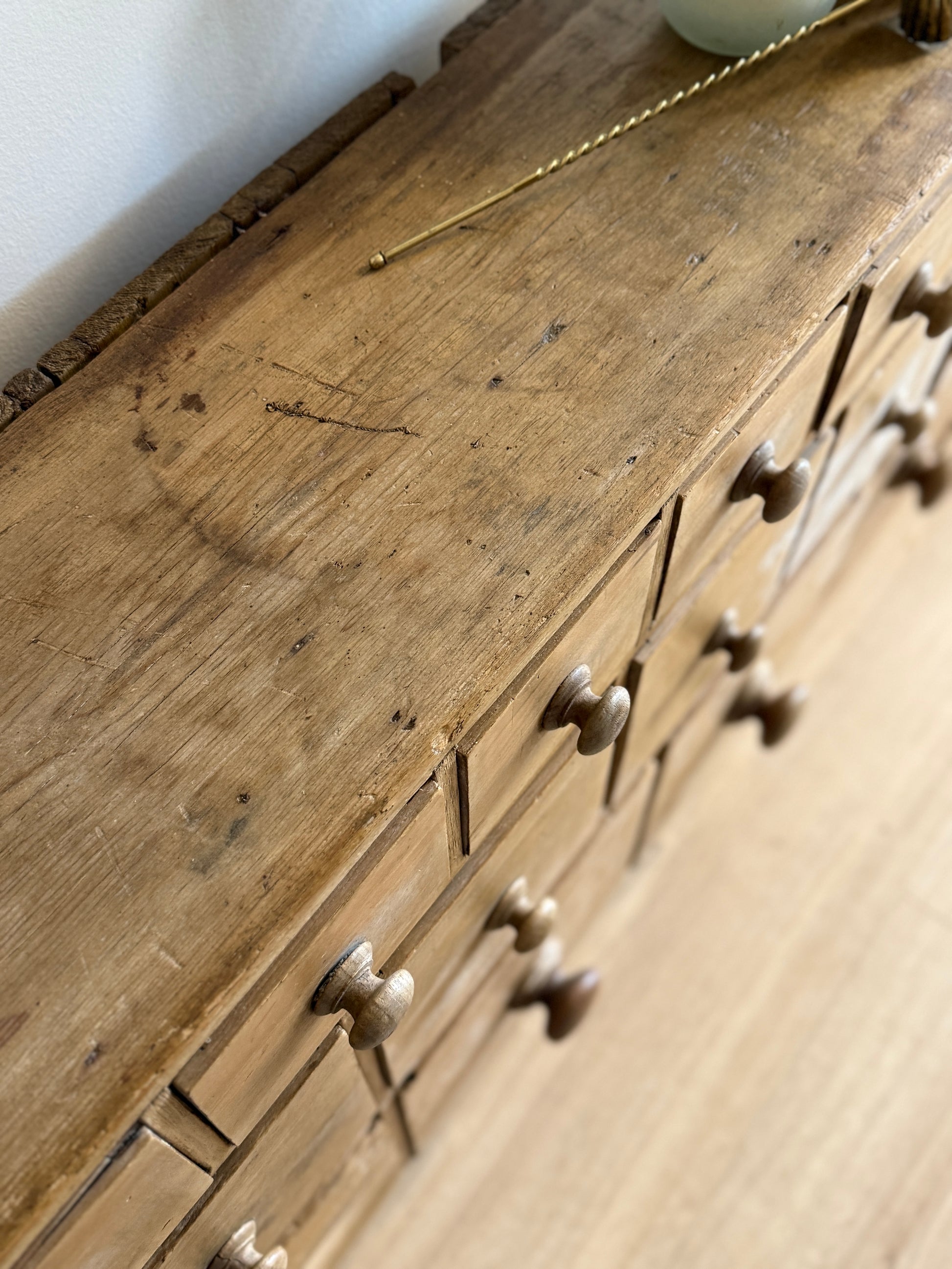 This beautiful and rare English apothecary cabinet features an extraordinary array of twenty-five individual drawers, each fitted with original turned wooden knobs that show decades of daily use. The weathered pine displays rich surface character and genuine wear marks that speak to its working history in a Victorian pharmacy or medical practice. The varied drawer sizes—from tiny compartments for precious remedies to larger spaces for bulk supplies—showcase the methodical organization that defined 19th-century apothecary work. Its impressive length and relatively shallow depth make it perfect for modern spaces where you need serious small-item storage without overwhelming the room. Originally designed to hold everything from tinctures to powders with meticulous English efficiency.