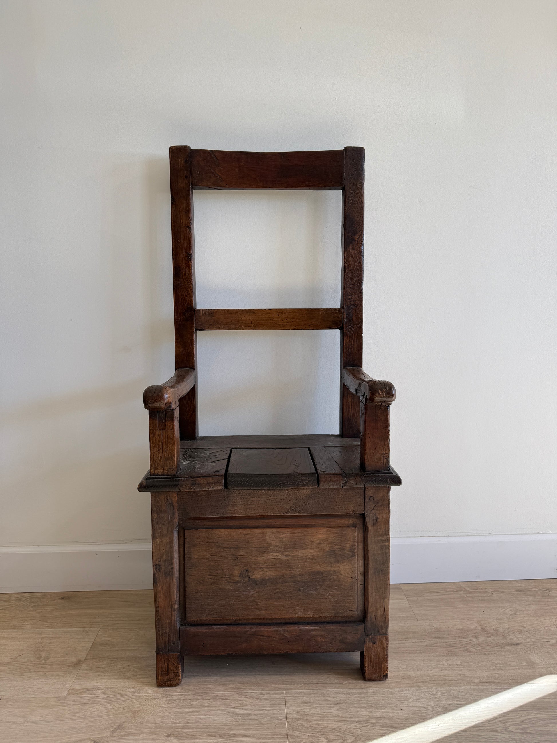 An early 18th-century oak salt box chair, its tall back and hinged seat concealing a deep compartment once used for storing essentials such as salt or flour, and in some households, more secretive contents. Tradition holds that the older women of the family would settle here by the hearth when the tax collector came calling, tucking away coins and papers beneath the seat to keep household savings from view. Equally at home holding provisions, cherished keepsakes, or even a well-worn Bible, this stout and timeworn form speaks to the ingenuity of domestic life in the period, where every piece was crafted to serve both comfort and quiet utility.