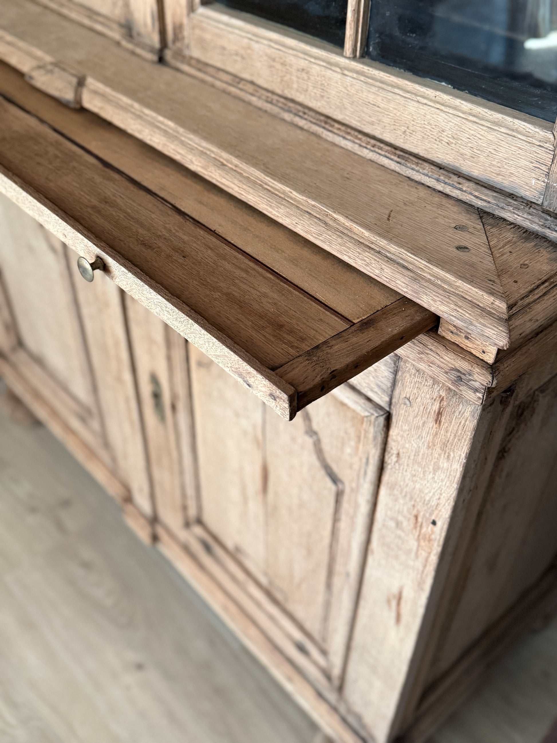 This incredibly striking and large early 19th century Dutch oak cabinet is a beautifully proportioned architectural piece, featuring an elegant arched cornice, original hand-blown glass panes, and a richly nuanced surface developed over time. The upper section opens to reveal interior scalloped shelving ideal for display, while a concealed pullout breadboard adds a wonderful layer of practicality and charm. Below, paneled cupboards offer generous closed storage, and the cabinet retains its original working key—an exceptional detail that speaks to its completeness. With its refined silhouette, warm tonal variation, and thoughtful craftsmanship throughout, this cabinet makes a striking statement in a kitchen, dining room, or living space, equally suited for showcasing ceramics, glassware, and collected objects.