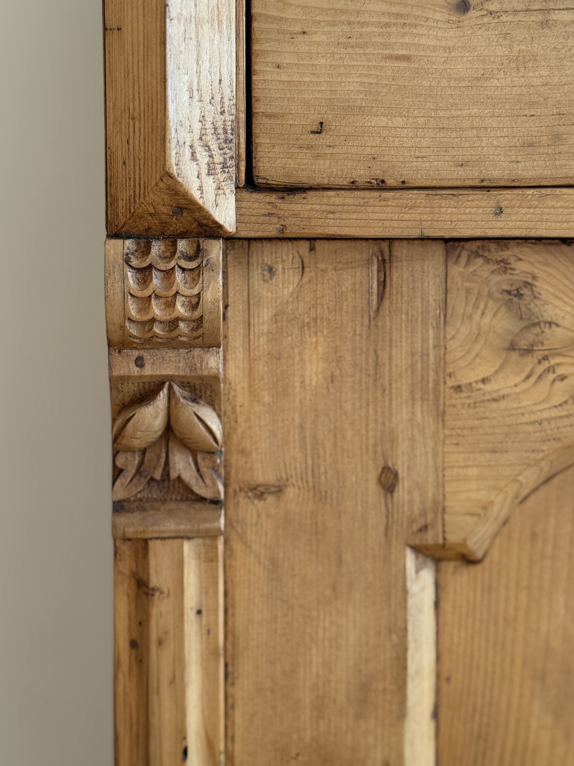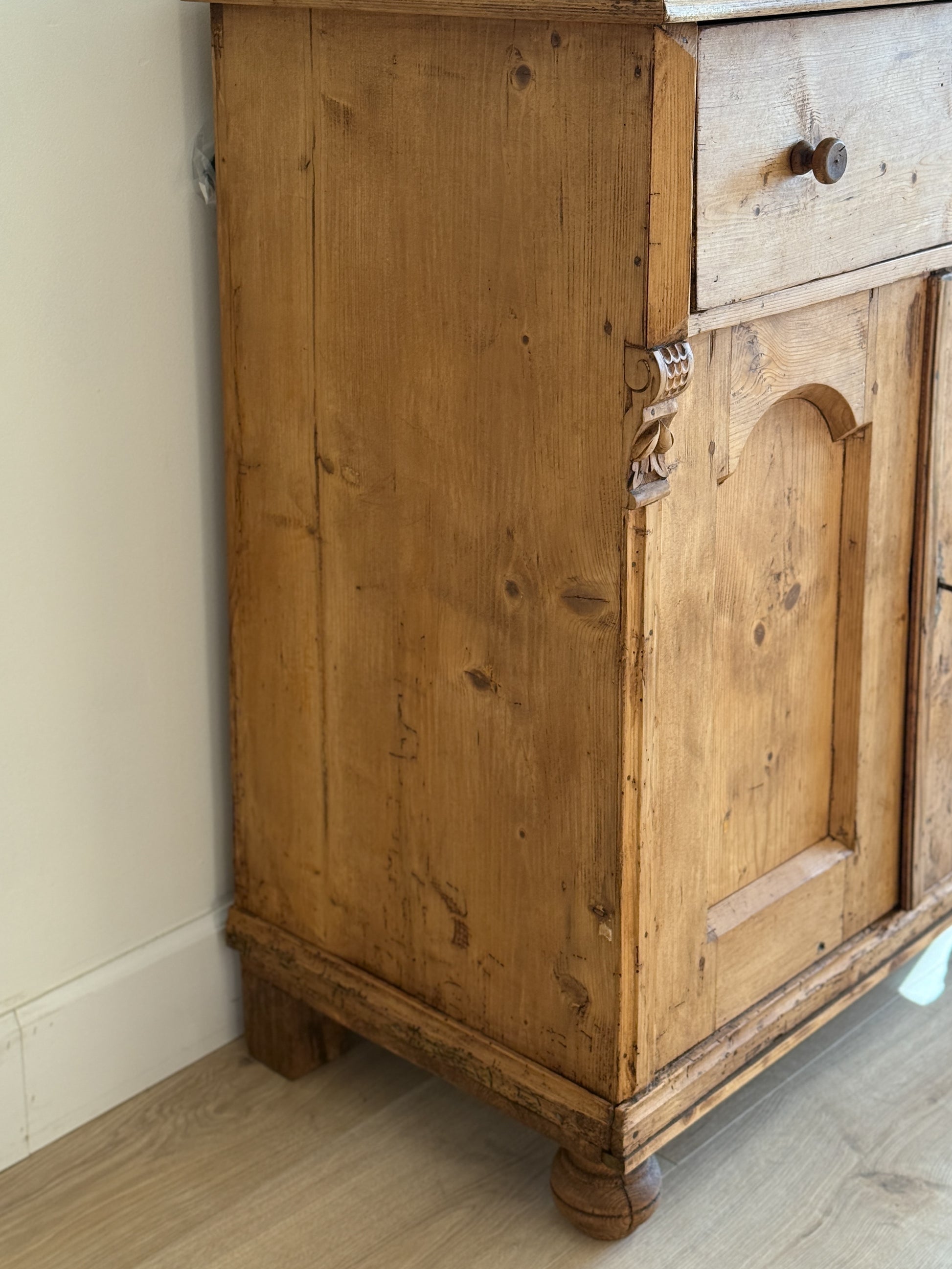 An antique European pine sideboard with a single deep drawer above a pair of paneled doors, set on well-turned feet. The warm, golden pine has mellowed beautifully with age, revealing knots, wear, and a rich surface that speaks to generations of use. Chunky exposed dovetails and hand carved details at the stiles lend a quiet decorative note without overwhelming the piece’s simple, functional form. Dating to the 19th century, this sideboard would have served in a modest home for storing tablewares or linens, and today brings the same charm and practicality to a dining room, entryway, or kitchen.