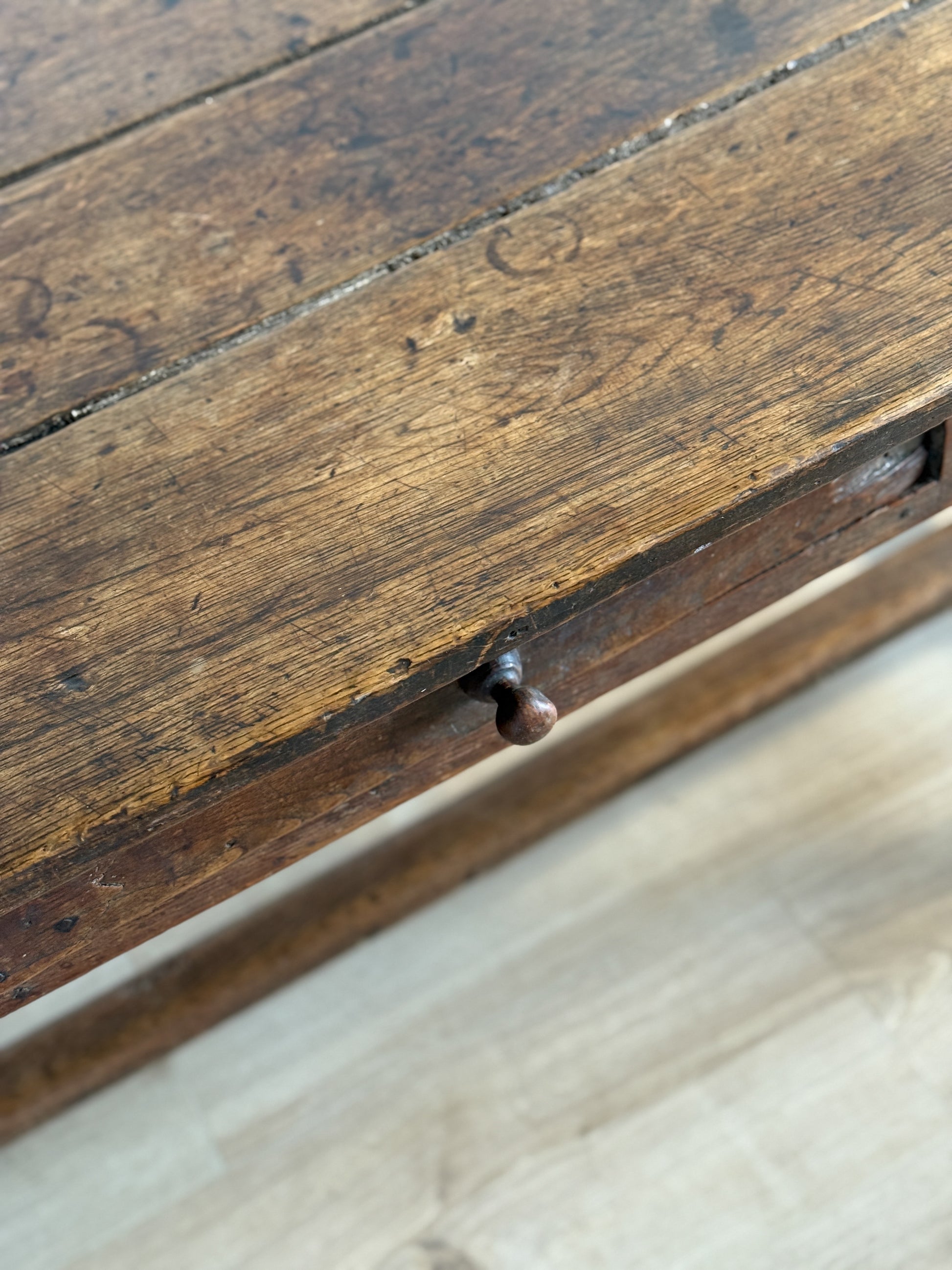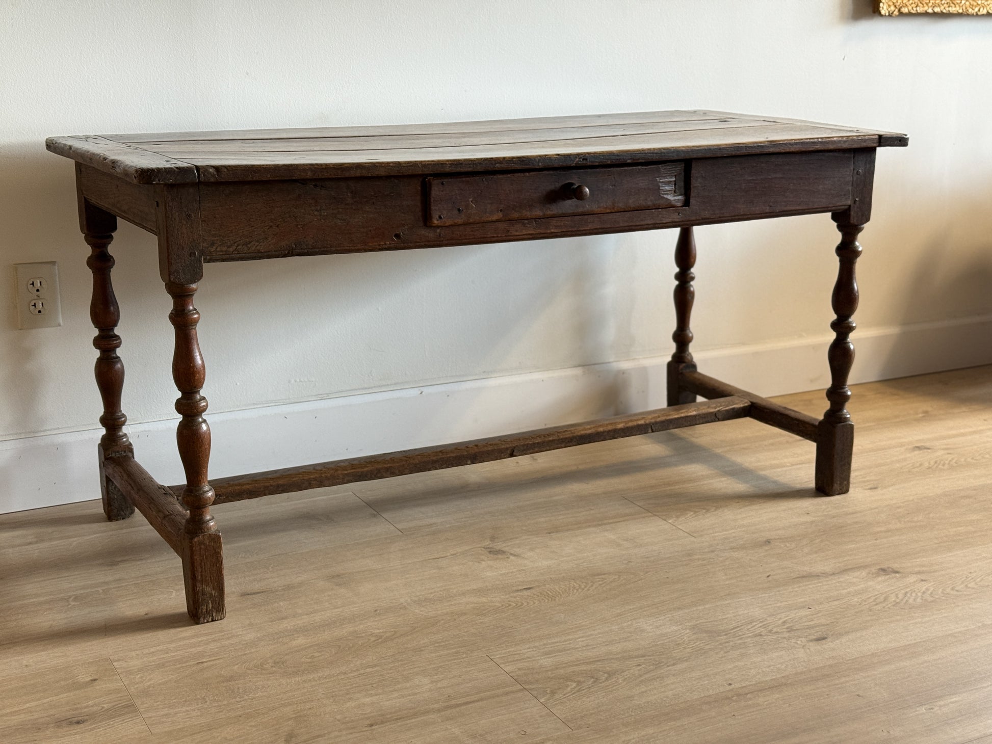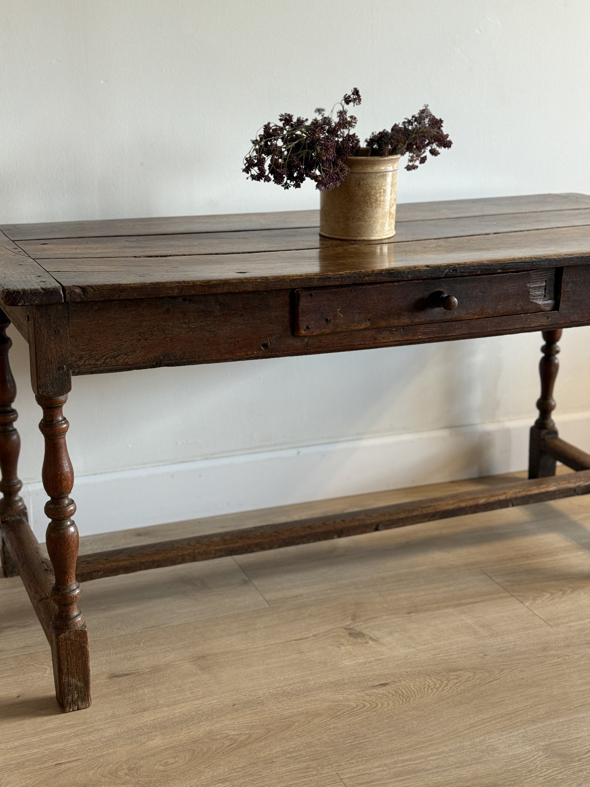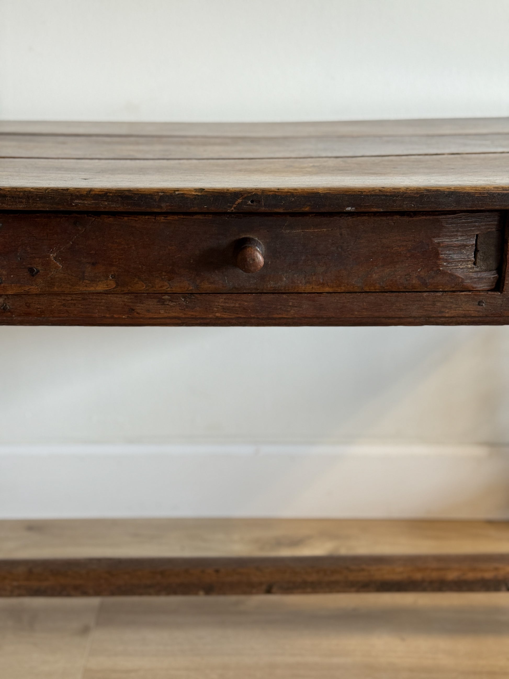 An early 19th century French oak serving table, richly patinated from generations of use. The single drawer, set with its original wooden knob, offers a practical touch to the straightforward form. Hand-turned legs and stretcher base provide both stability and a subtle decorative detail, while the well-worn top showcases the character of age-old craftsmanship. A versatile piece, equally at home in a dining space, entryway, or as a working surface in the kitchen.