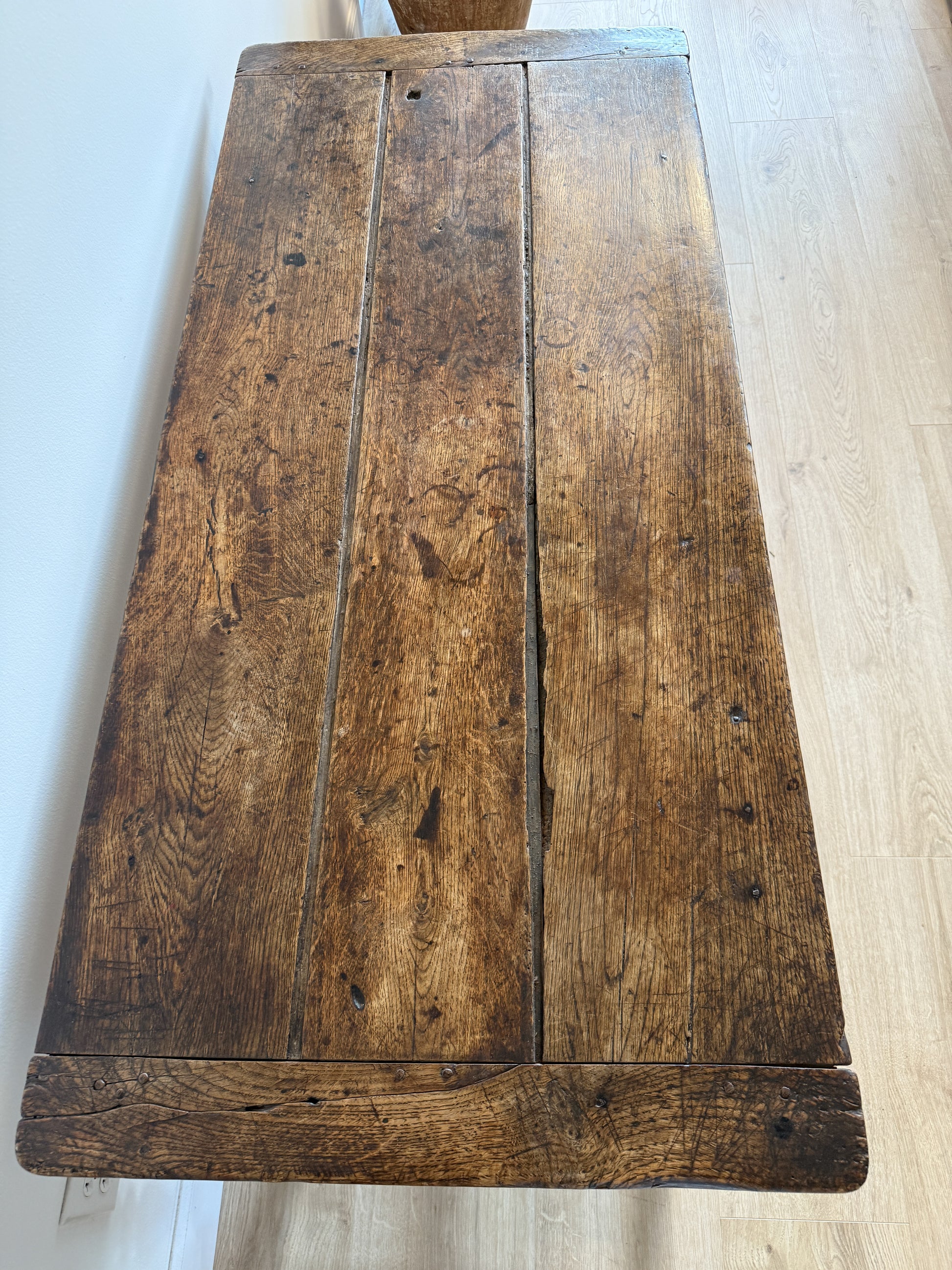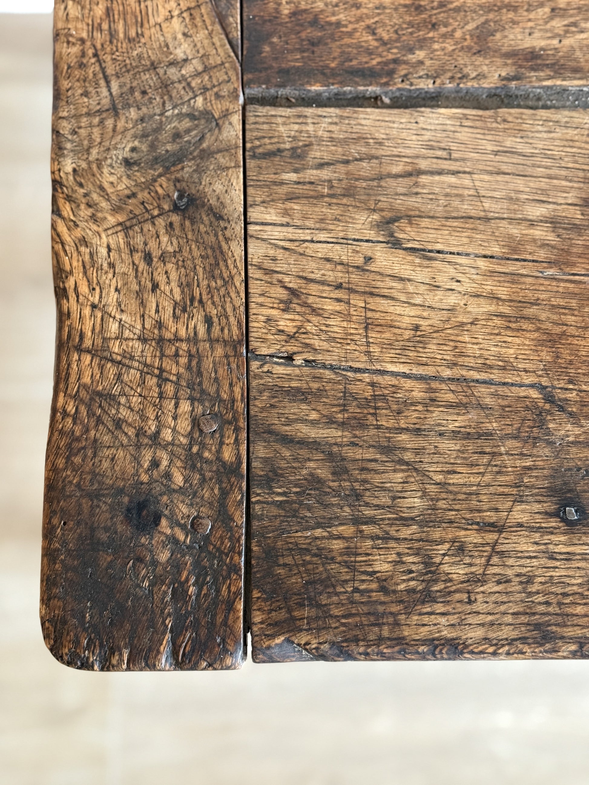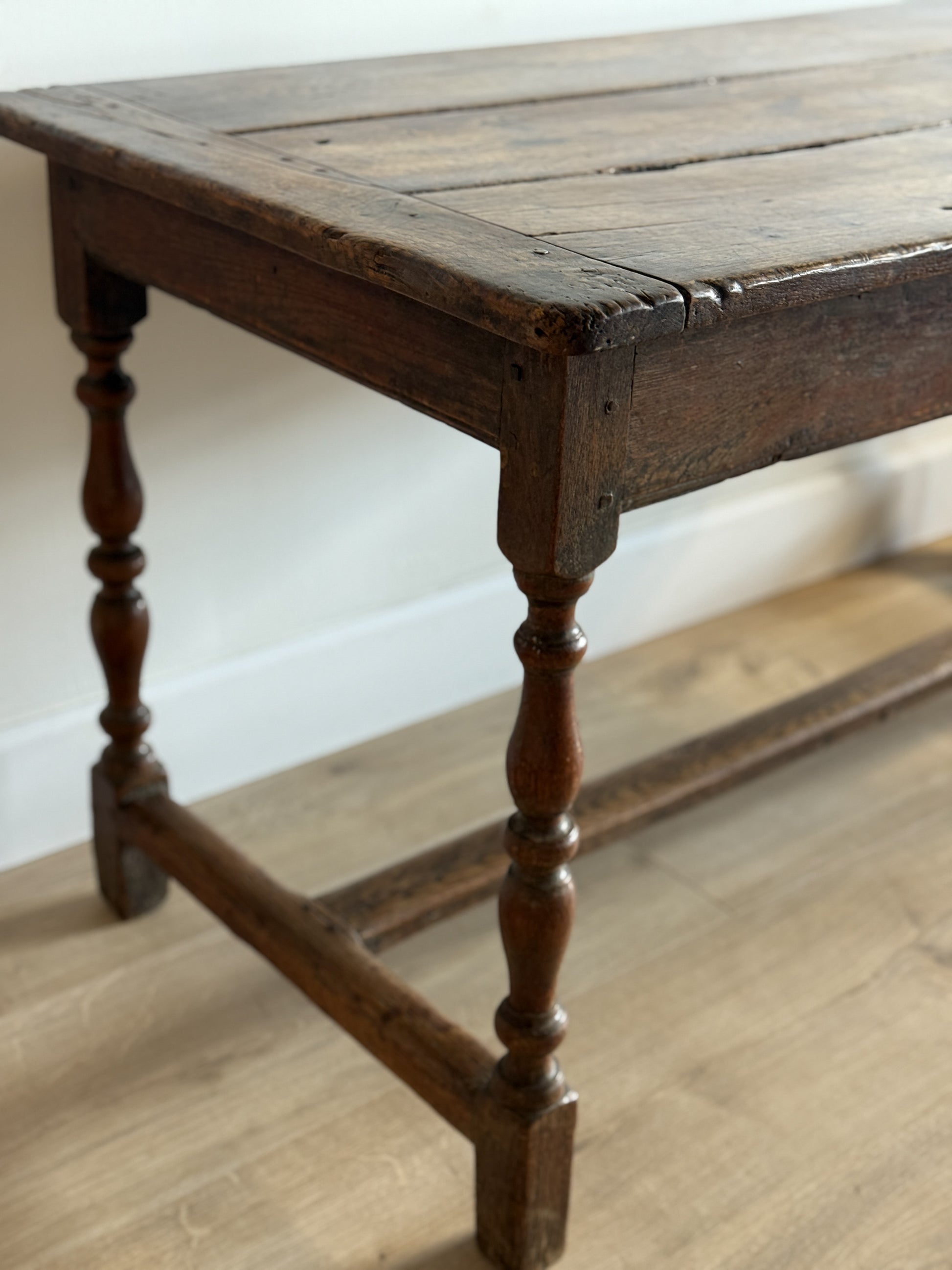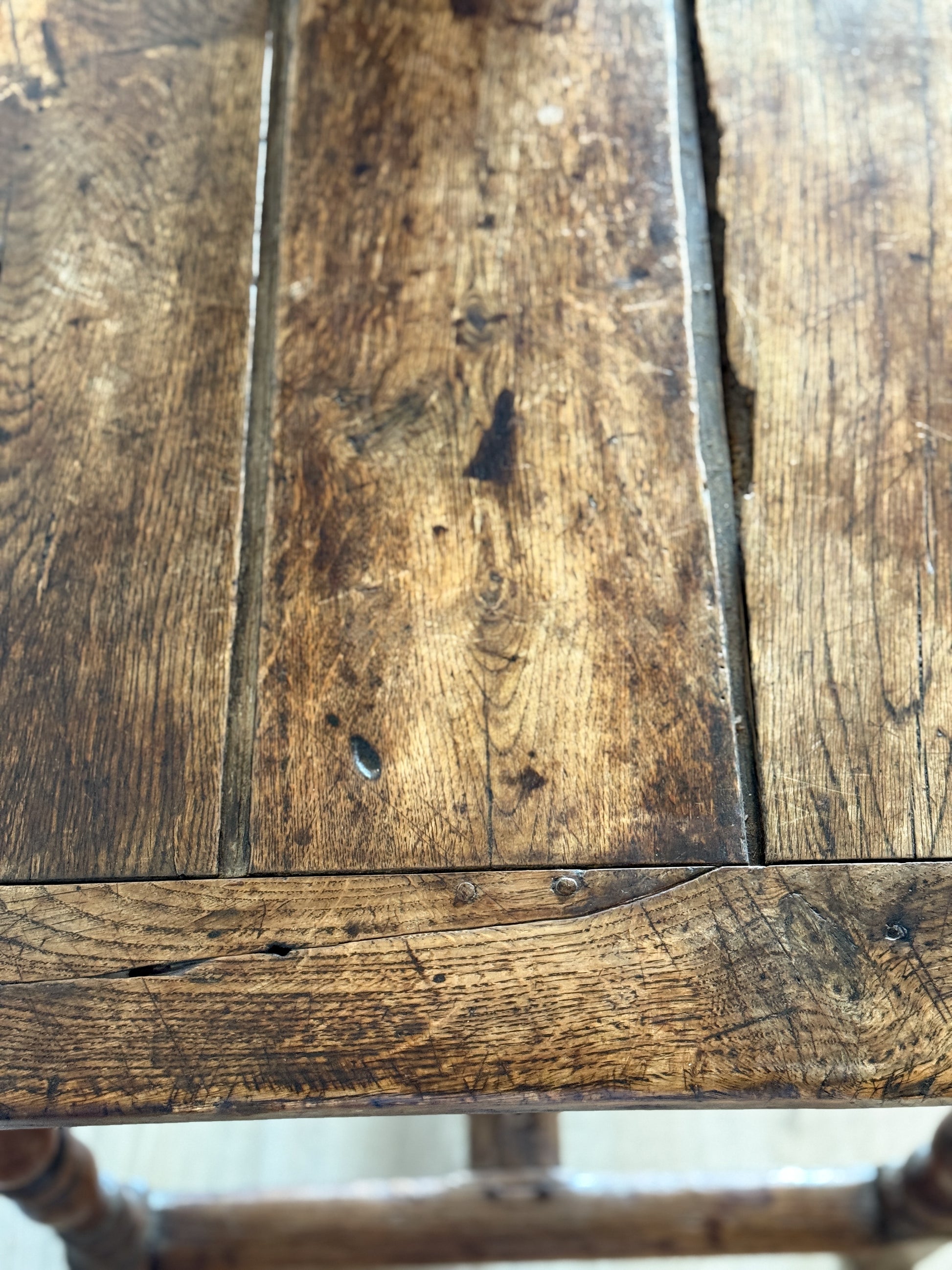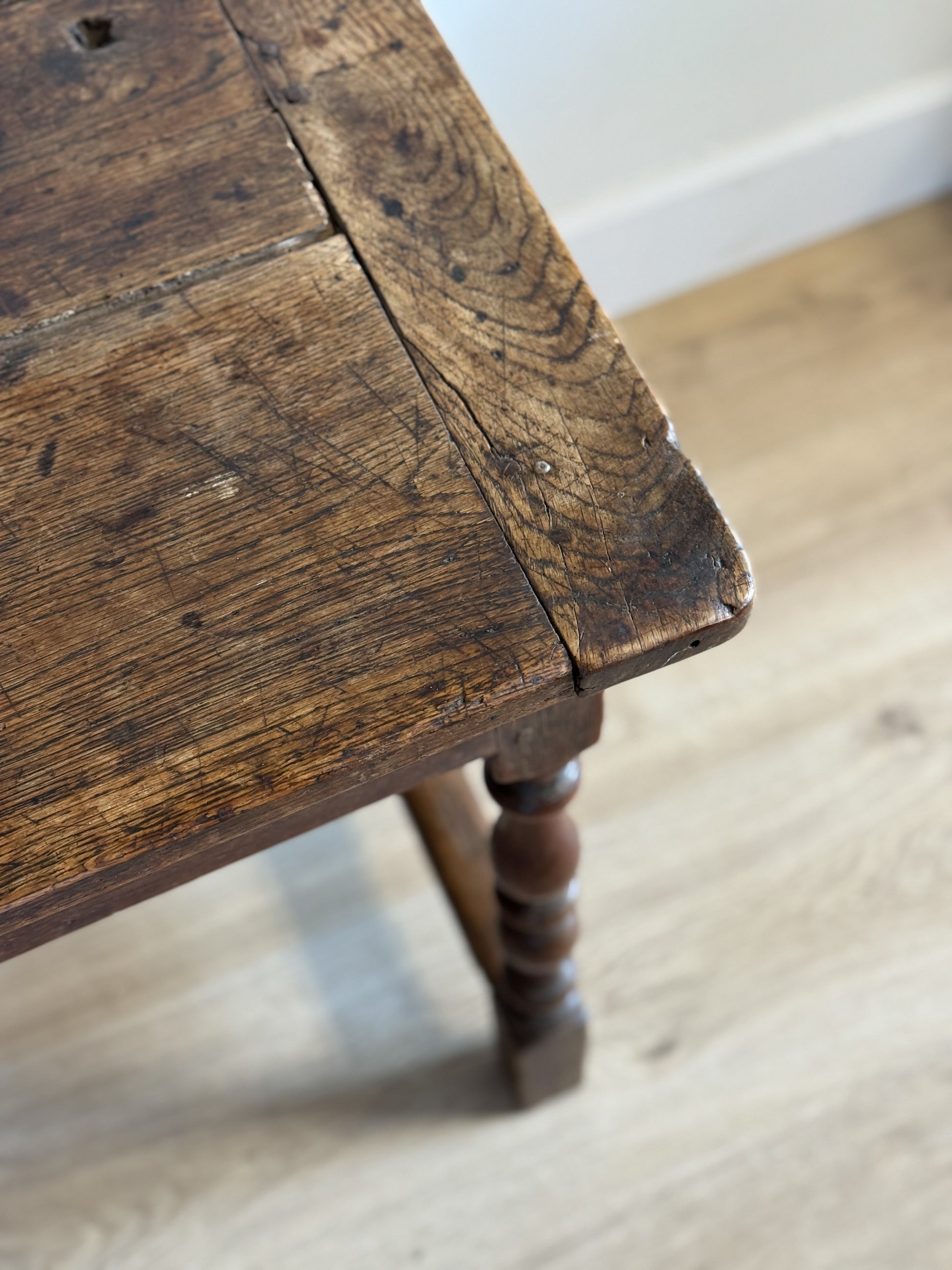 An early 19th century French oak serving table, richly patinated from generations of use. The single drawer, set with its original wooden knob, offers a practical touch to the straightforward form. Hand-turned legs and stretcher base provide both stability and a subtle decorative detail, while the well-worn top showcases the character of age-old craftsmanship. A versatile piece, equally at home in a dining space, entryway, or as a working surface in the kitchen.