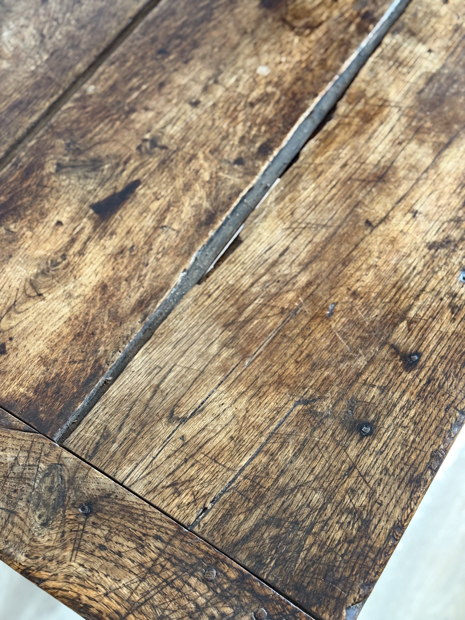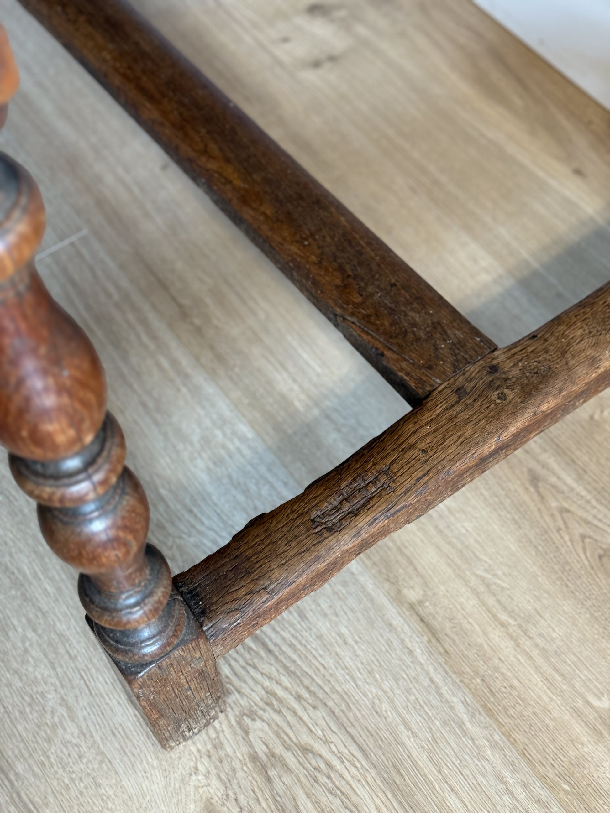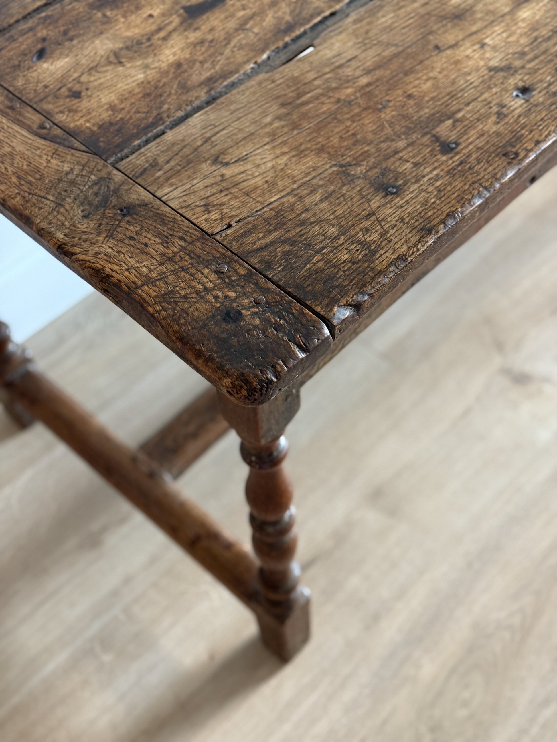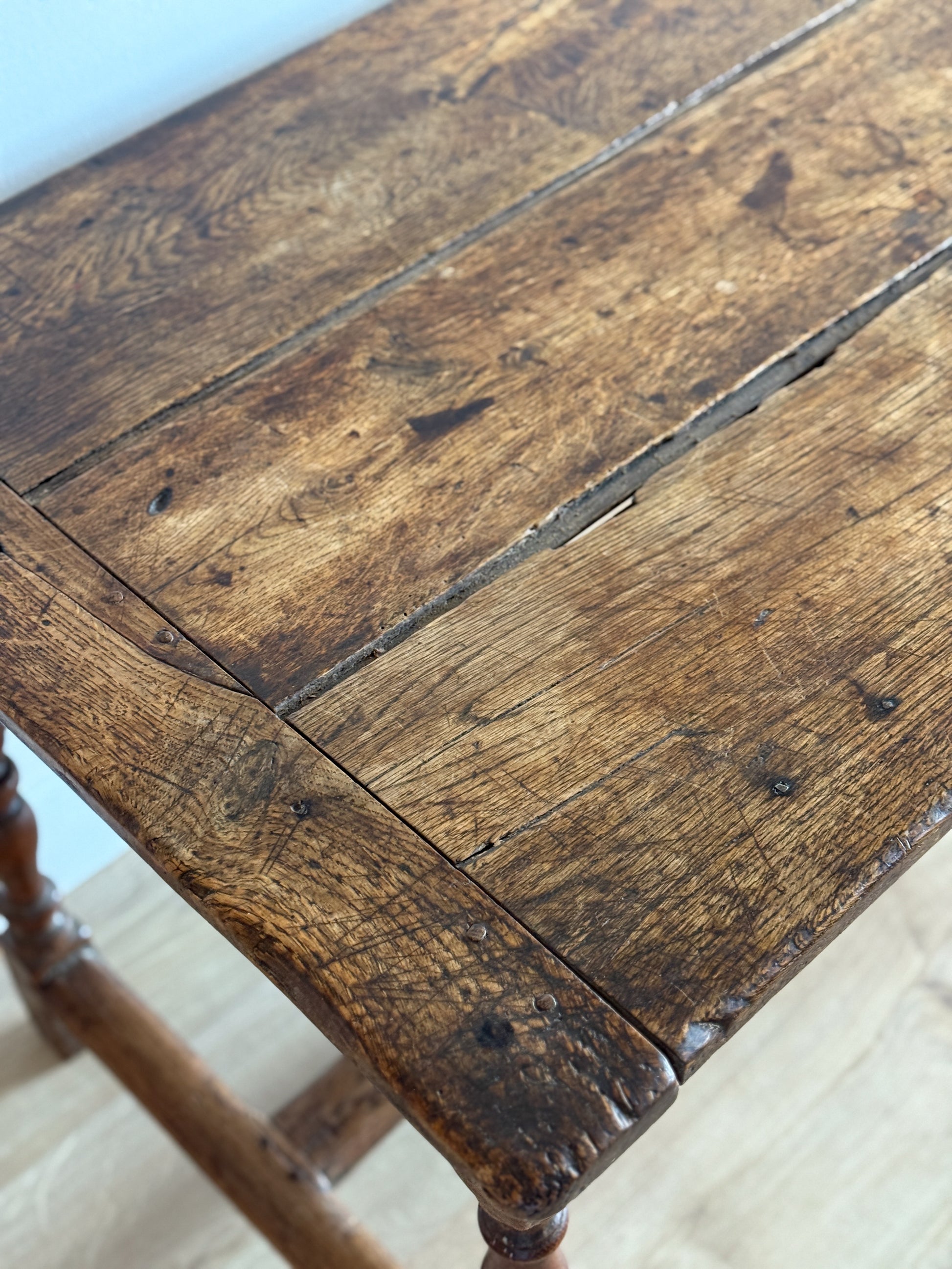 An early 19th century French oak serving table, richly patinated from generations of use. The single drawer, set with its original wooden knob, offers a practical touch to the straightforward form. Hand-turned legs and stretcher base provide both stability and a subtle decorative detail, while the well-worn top showcases the character of age-old craftsmanship. A versatile piece, equally at home in a dining space, entryway, or as a working surface in the kitchen.