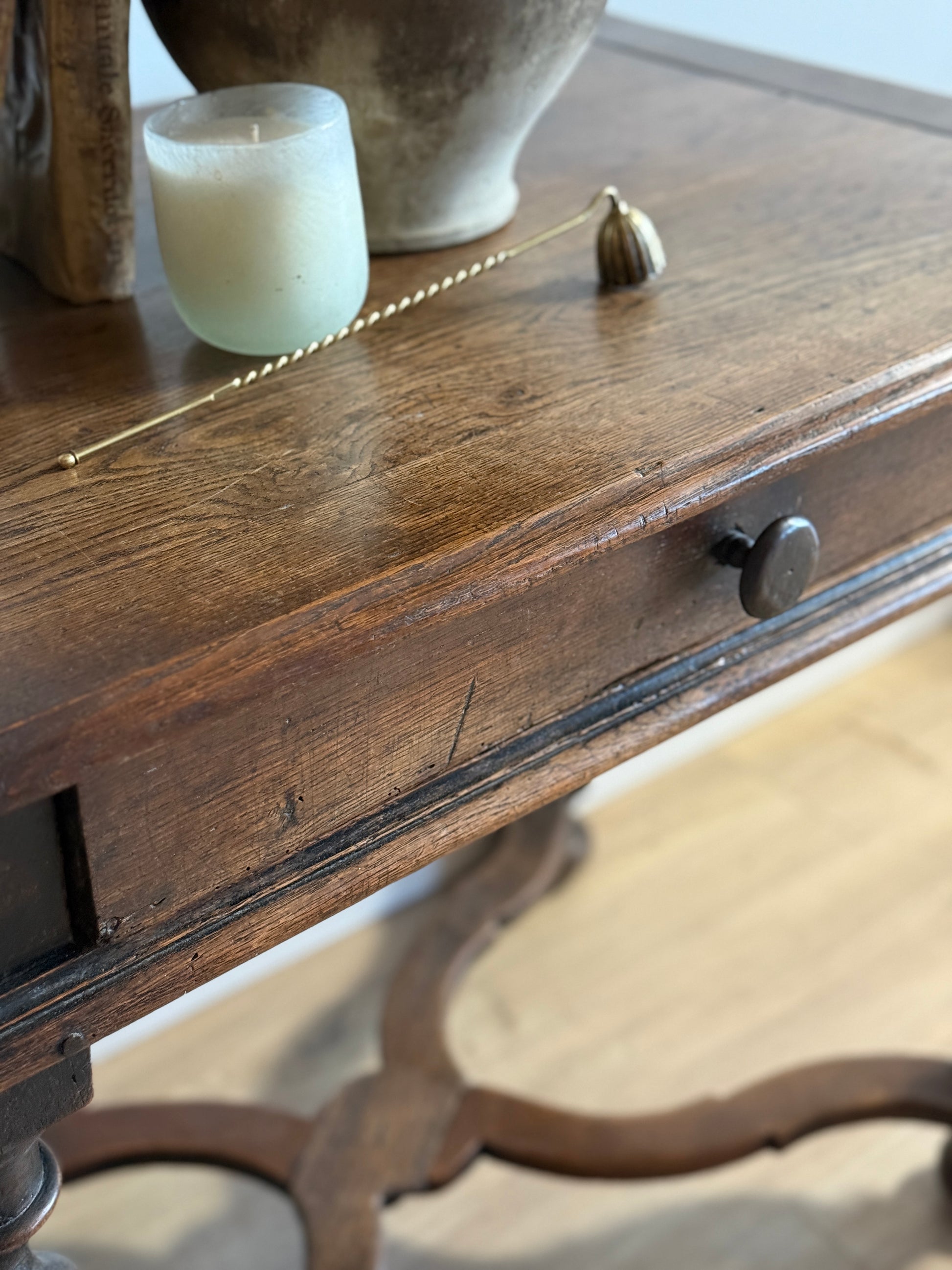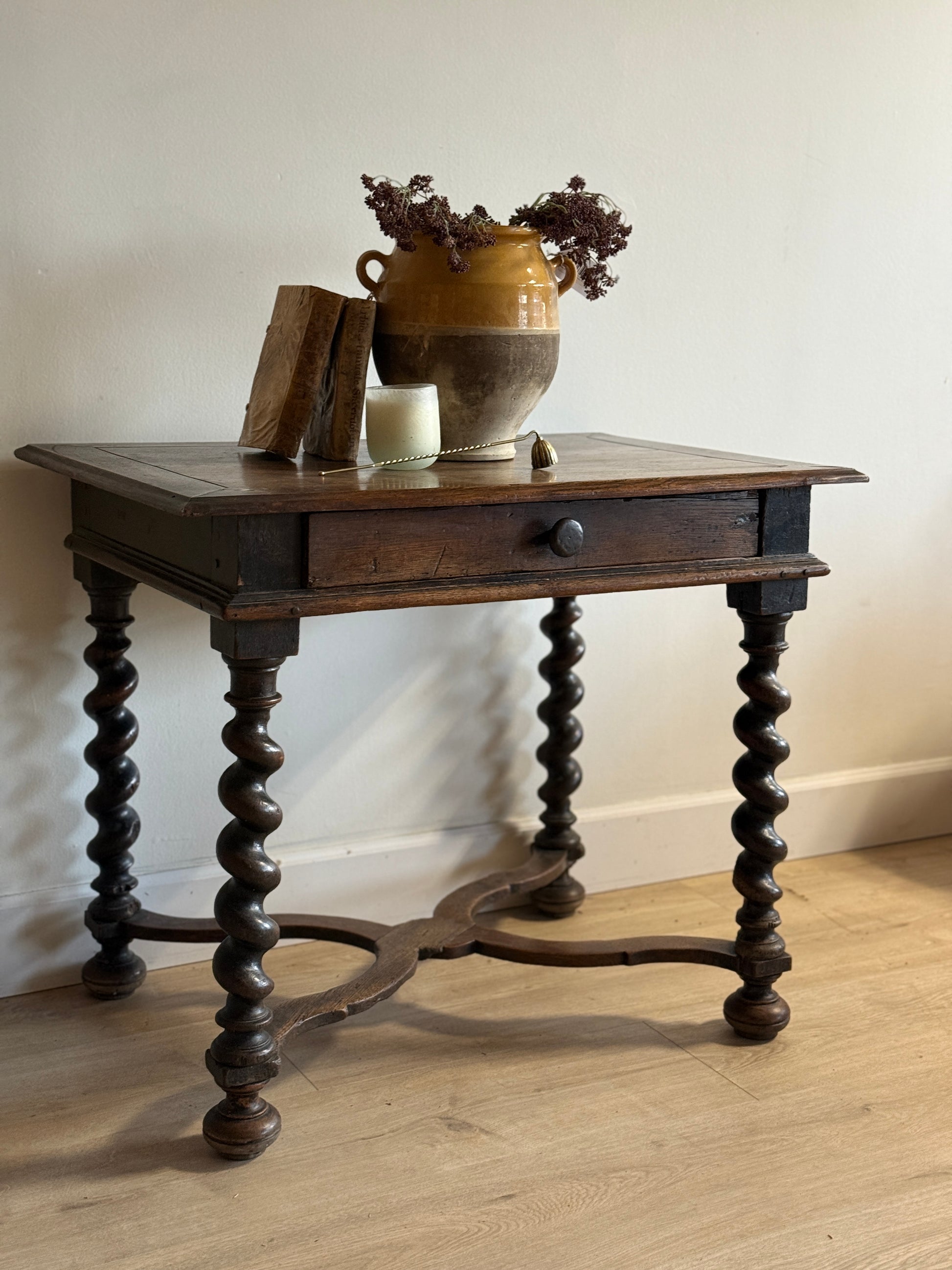 This late 17th-century French oak table is defined by its confident proportions and beautifully turned barley twist legs, joined by a sculptural stretcher that gives the piece both strength and visual weight. The single drawer, fitted with its original wood pull, adds a subtle functional detail without interrupting the table’s strong silhouette. The oak surface shows centuries of use—softened edges, tonal variation, and a depth of color that can only come from age and handling. Elegant yet grounded, this table works effortlessly as a center table, writing desk, or refined accent, bringing an unmistakable sense of history and craftsmanship into the space.