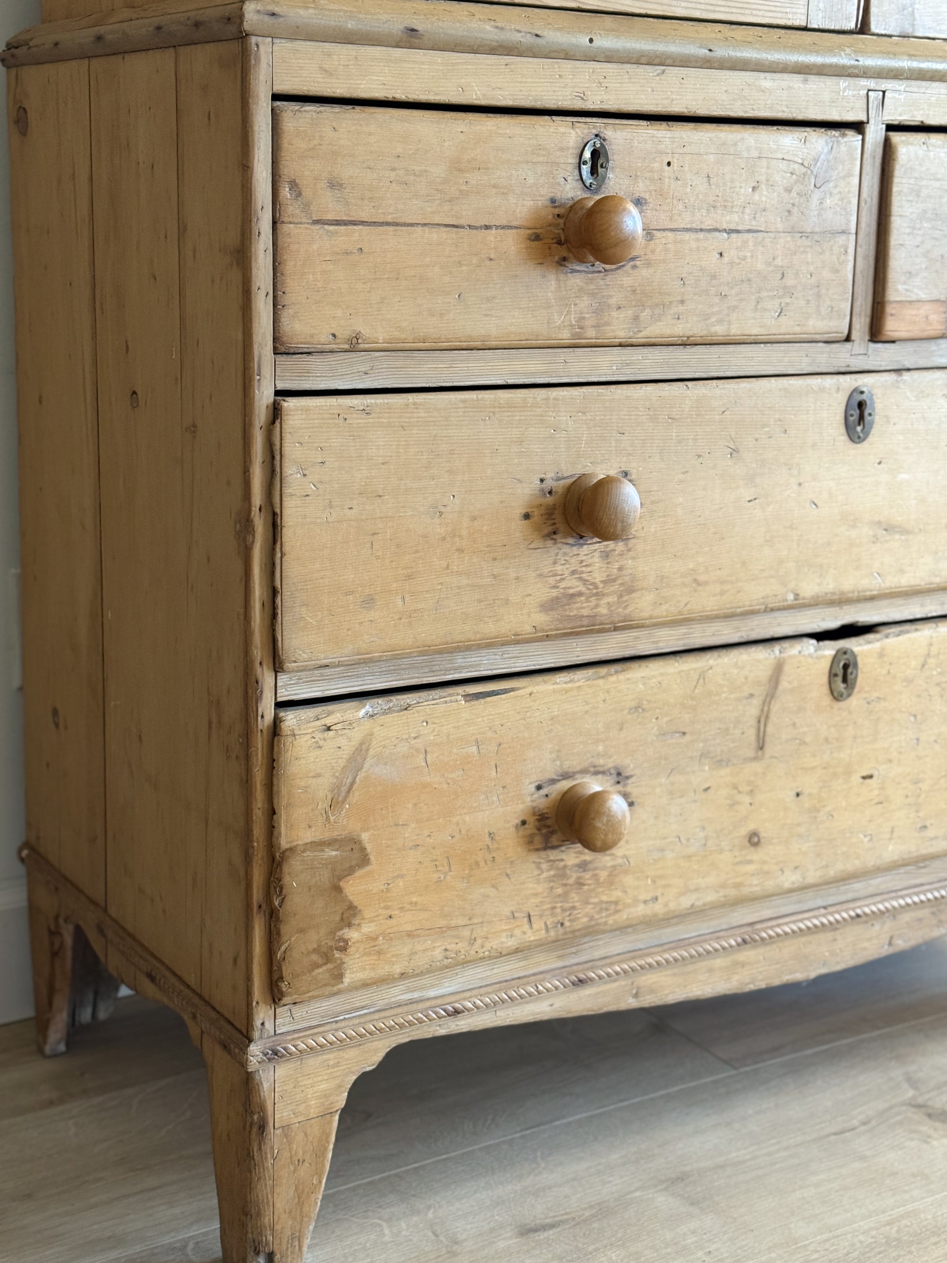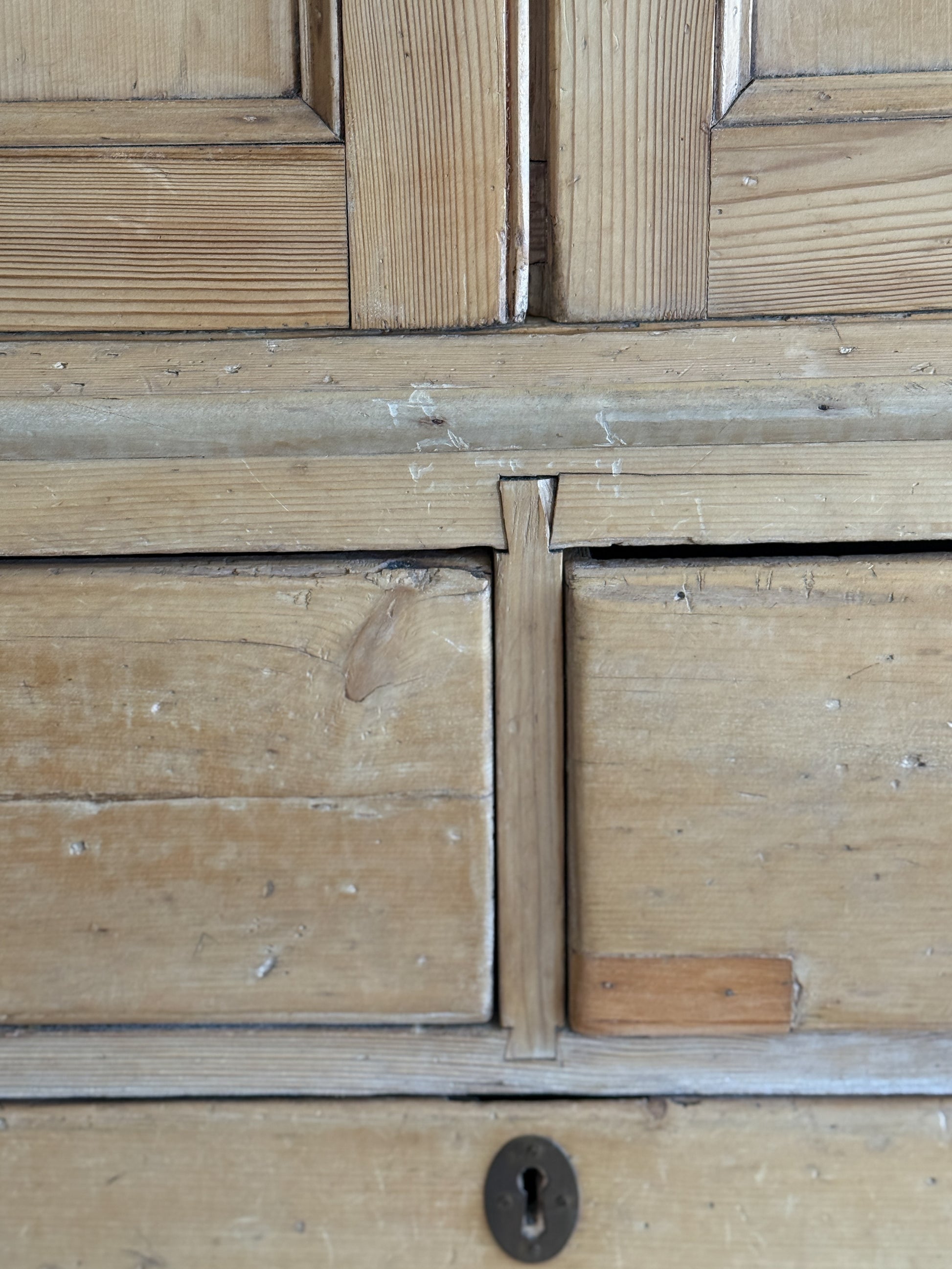 A 19th-century English pine linen press with a warm, honeyed surface and the marks of long use, this piece combines a paneled two-door cabinet with interior shelving over four drawers—two short above two long—each with original turned pulls. The simple lines, corniced top, and shaped apron on bracket feet give it a graceful presence, while its generous storage makes it as practical in a bedroom or hallway as it is in a dining room.
