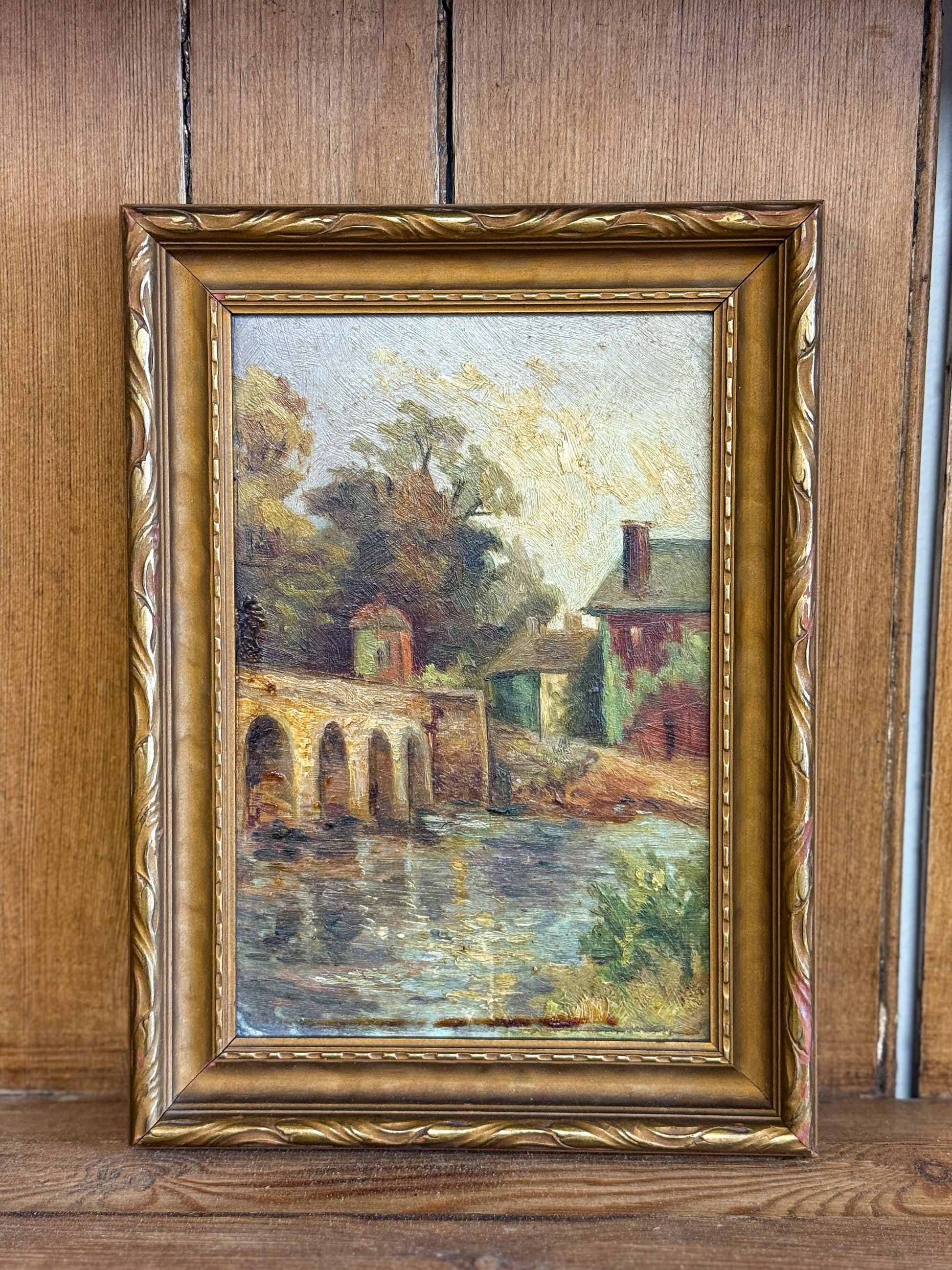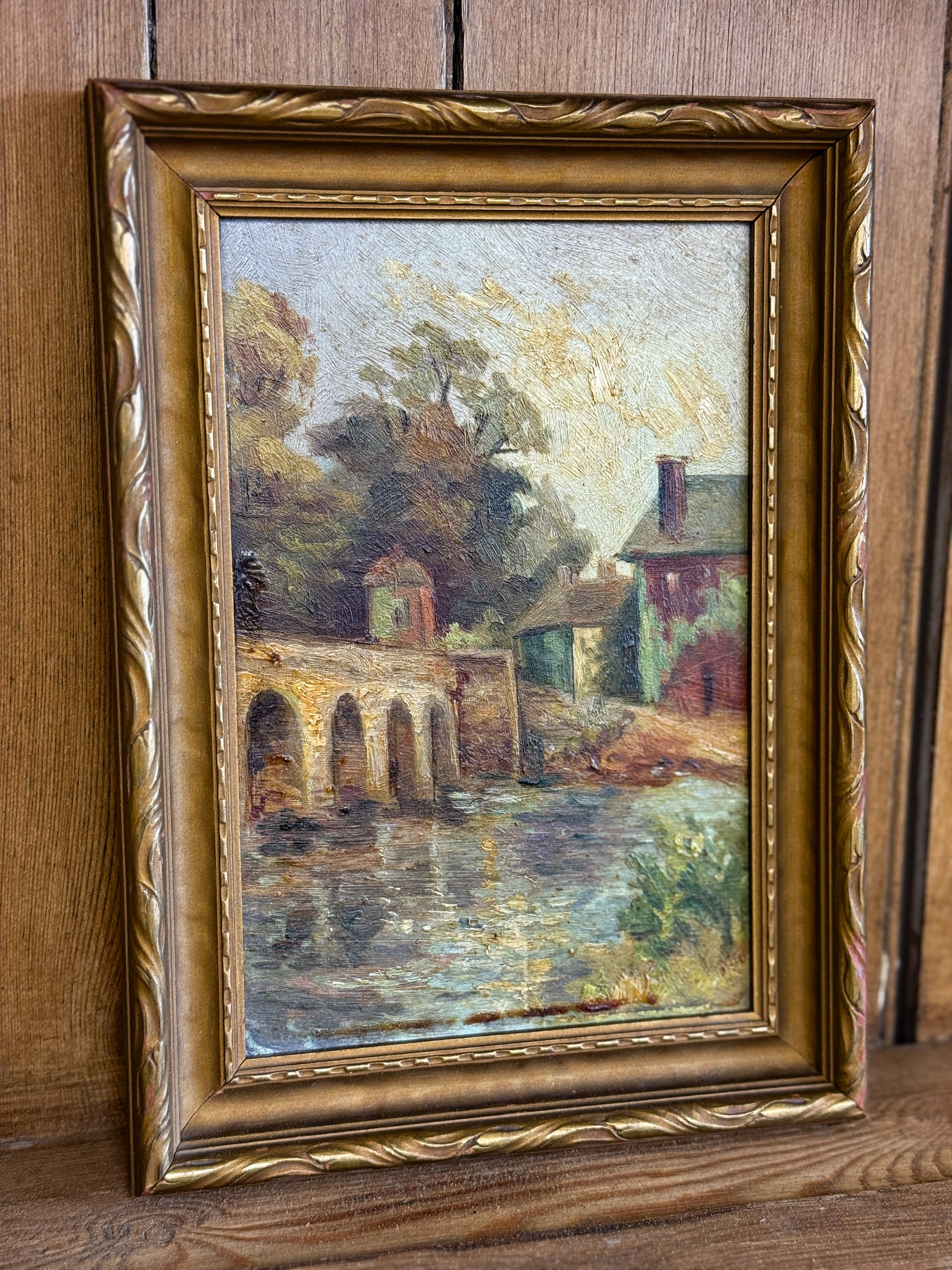 This charming oil painting depicts a picturesque European village scene with a historic stone bridge arching over a tranquil river, flanked by rustic cottages with terracotta roofs amid lush foliage. Executed in warm impressionistic tones of golden yellows, burnt oranges, and sage greens with visible brushwork typical of late 19th or early 20th century plein air style, the luminous composition captures either dawn or dusk light. The elegant gilded frame with rope-twist detailing perfectly complements this nostalgic countryside landscape that would appeal to collectors of traditional European art.