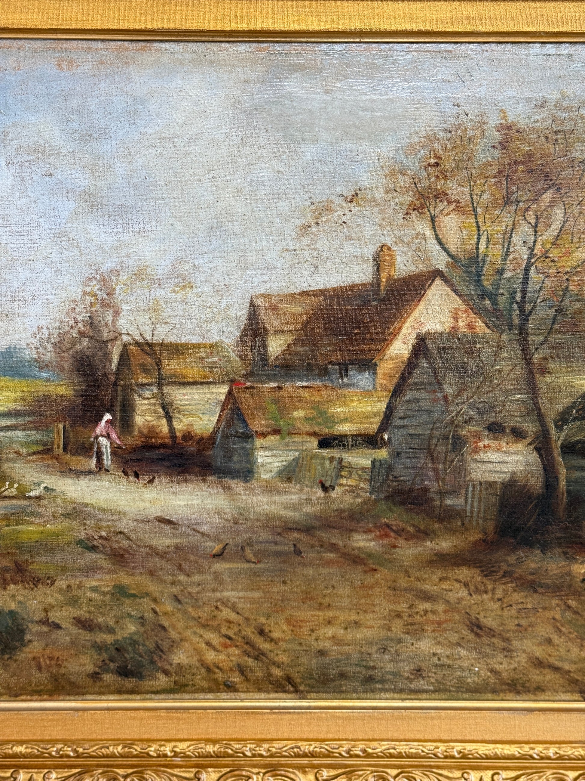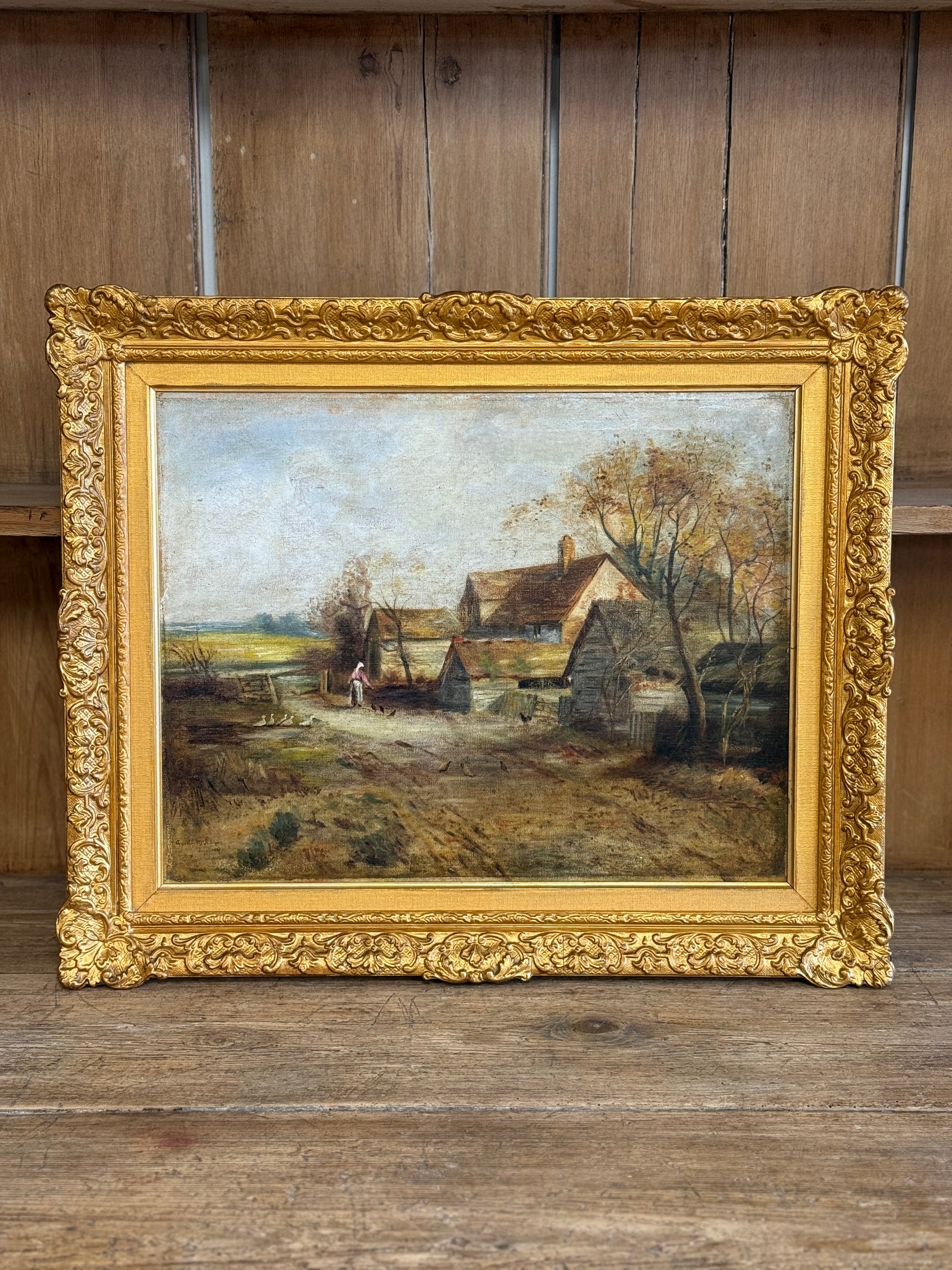 An antique oil painting signed by Annabel McKilligan, June 1920. This charming rural landscape painting depicts a peaceful countryside scene with rustic farm buildings, including a main house with a steep roof and smaller outbuildings connected by a dirt path. The composition features bare trees suggesting an autumn setting, with a woman feeding her chickens, ducks following along. Painted in a muted palette of earth tones—browns, ochres, and soft greens—with an overcast sky, the work employs loose, naturalistic brushwork typical of early 20th-century rural genre paintings. The piece is presented in an elaborate gilt frame with ornate baroque-style decorative molding.