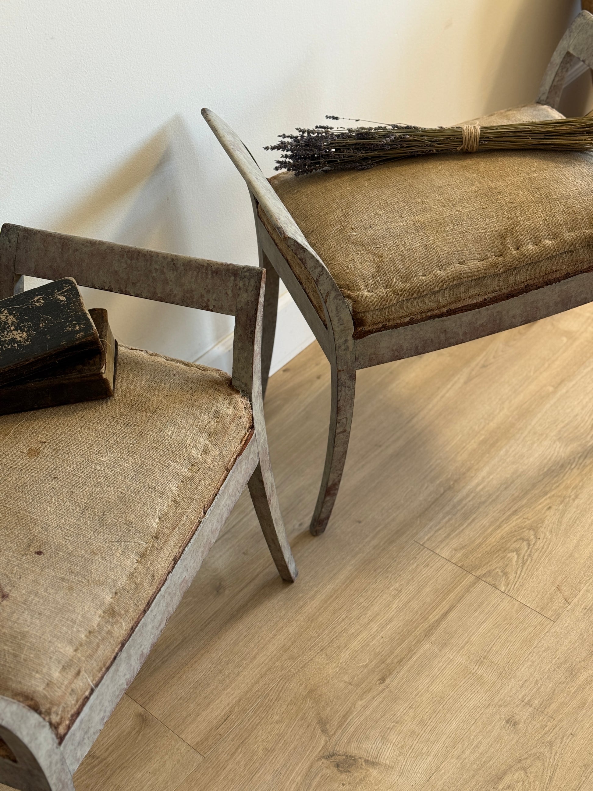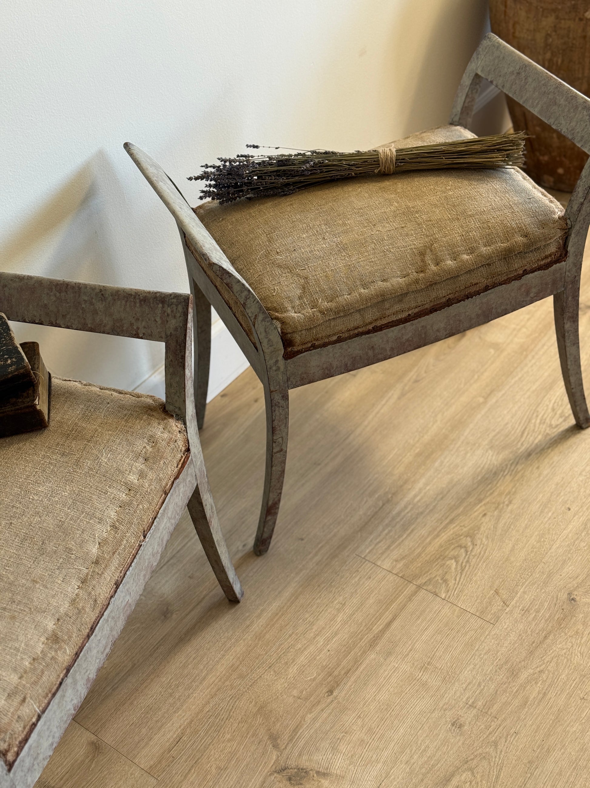 A rare and beautifully sculptural pair of antique Swedish tabourets dating to circa 1850, each with gracefully curved wooden frames and a softly arched silhouette that feels both refined and architectural. The original painted finish has aged into a richly layered patina, paired with the original upholstered seats in a rustic linen that only adds to their character. Equally striking flanking a console, at the foot of a bed, or styled as accent seating in a dressing room or bath, these are the kind of pieces that instantly elevate a space.