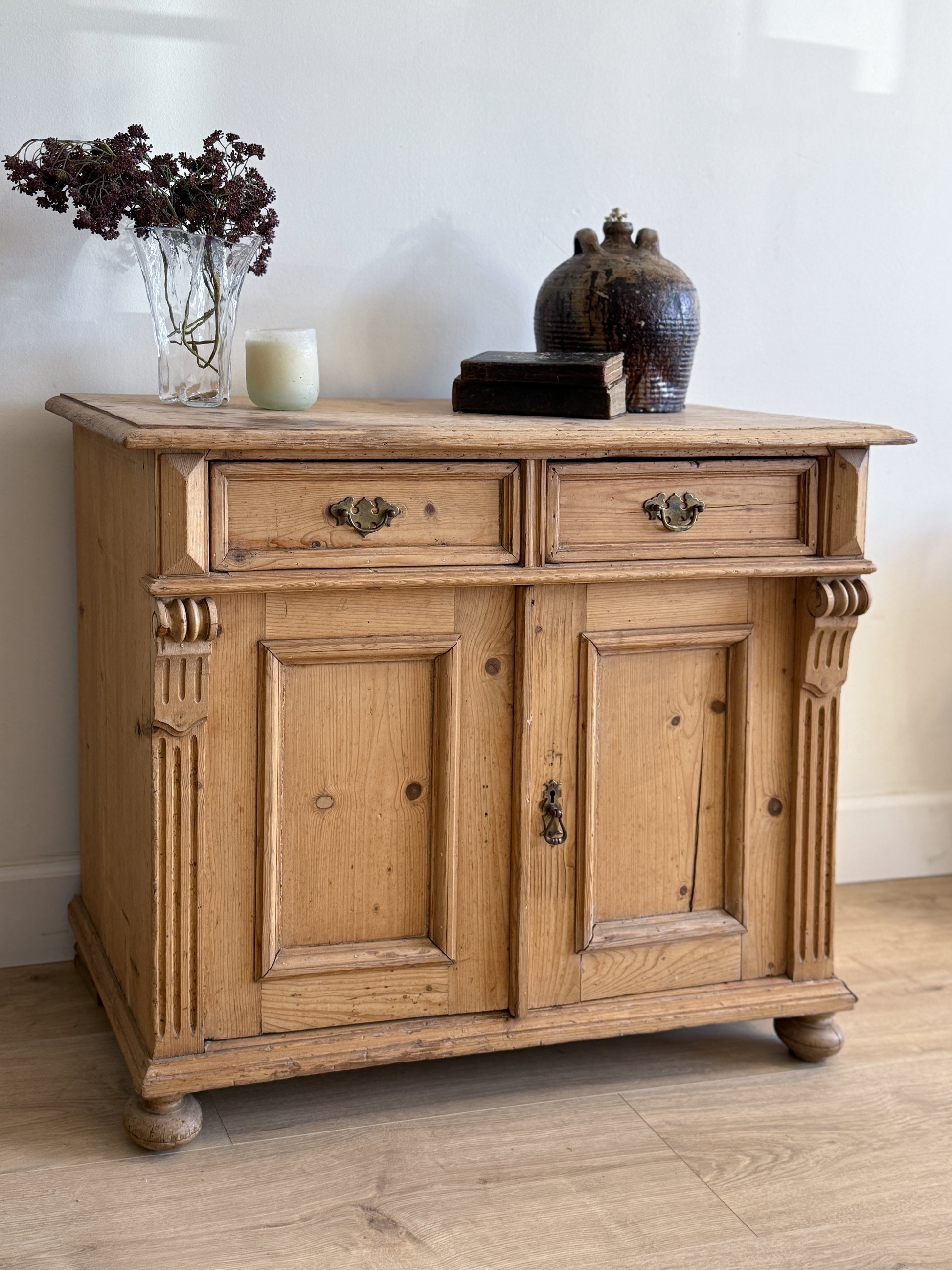 A late-19th-century English pine sideboard with carved fluted corners, small scroll corbels, and molded drawer and door fronts—all softened by decades of use and a naturally mellowed finish. The top carries the darker, timeworn patches that come from everyday life, while the original brass pulls add a subtle decorative note without feeling fussy. With two upper drawers and a roomy cabinet below, it offers generous storage in a compact footprint. Sourced in England, it’s a versatile piece that settles easily into kitchens, dining rooms, or living spaces.