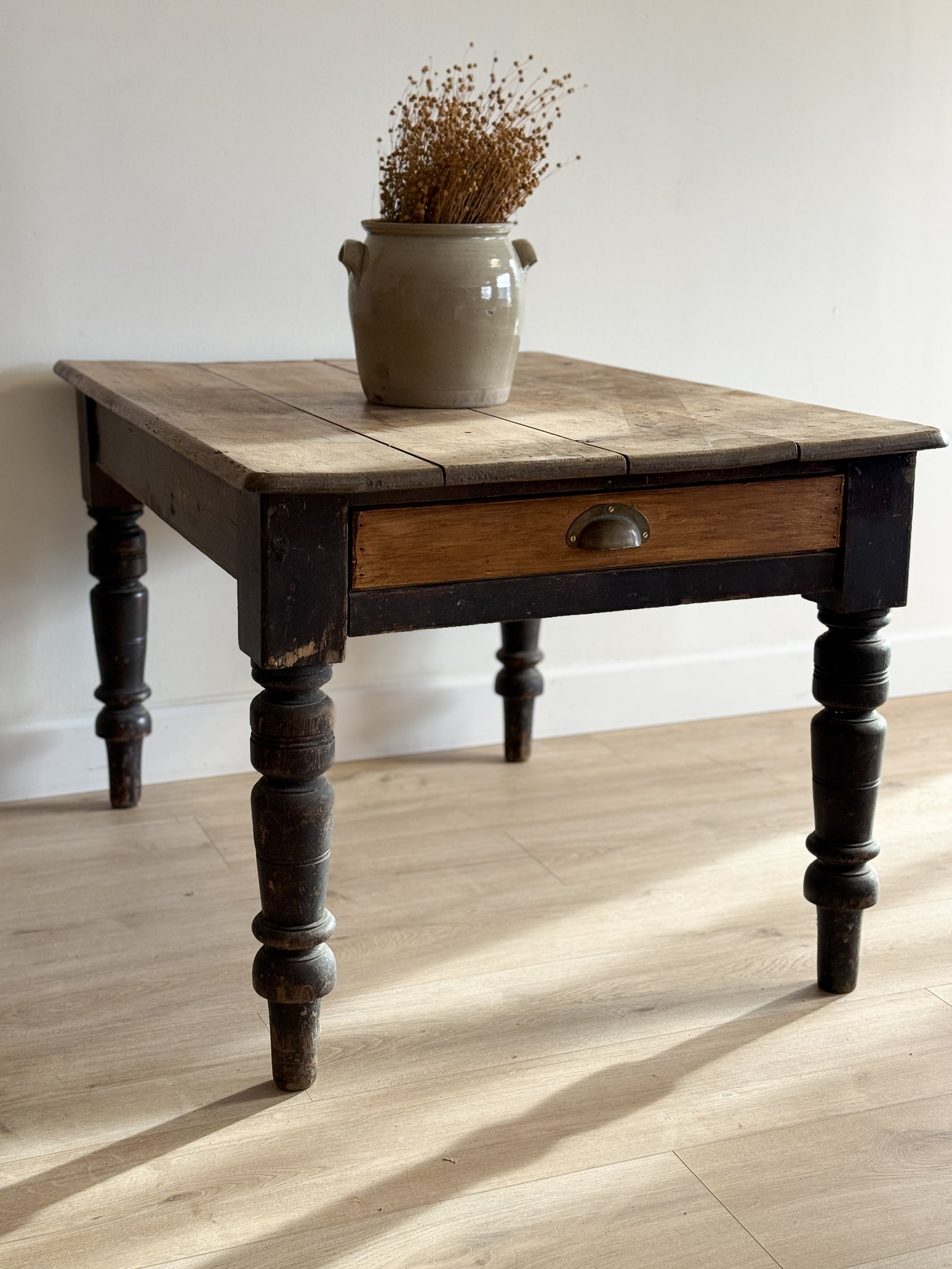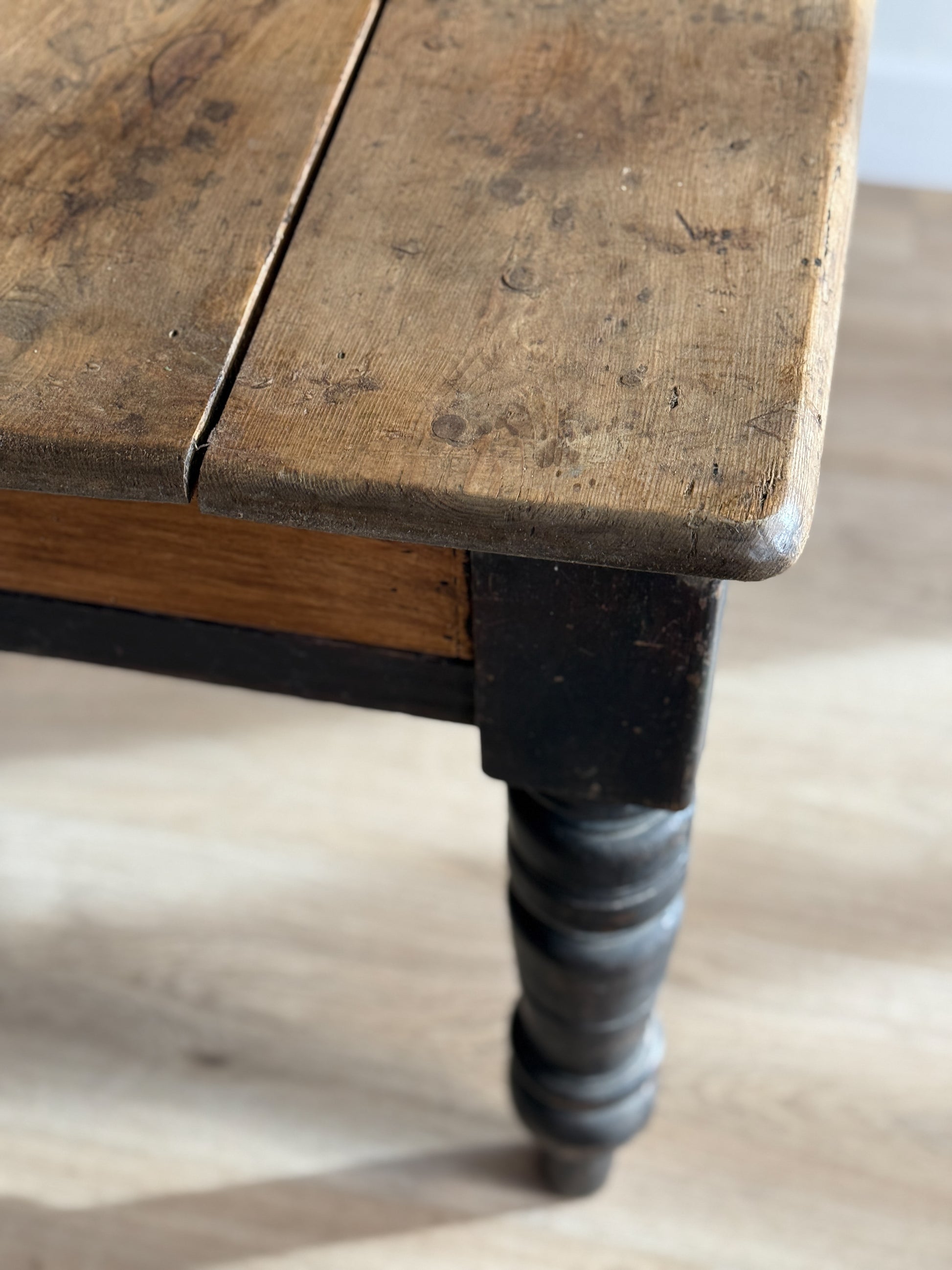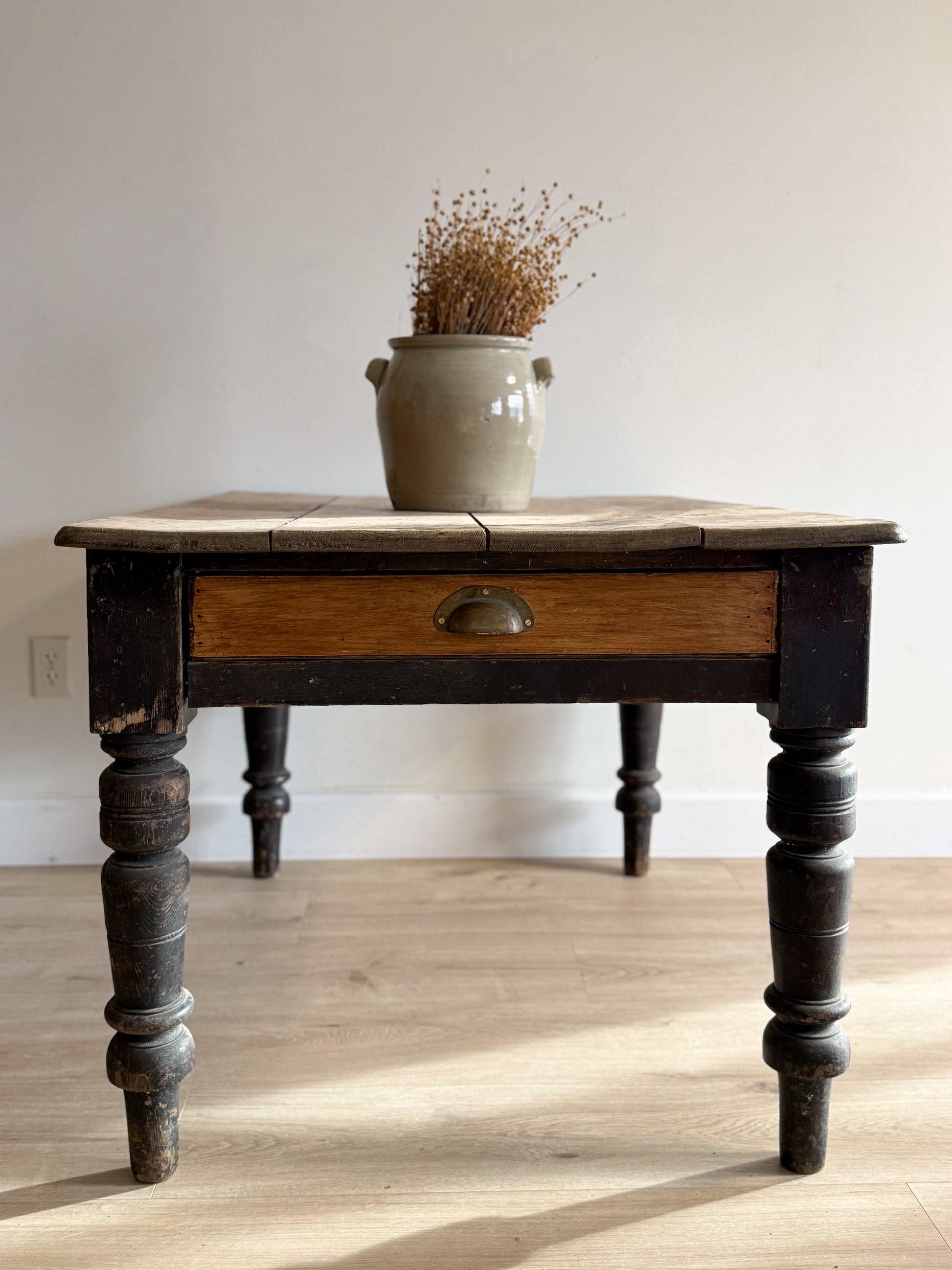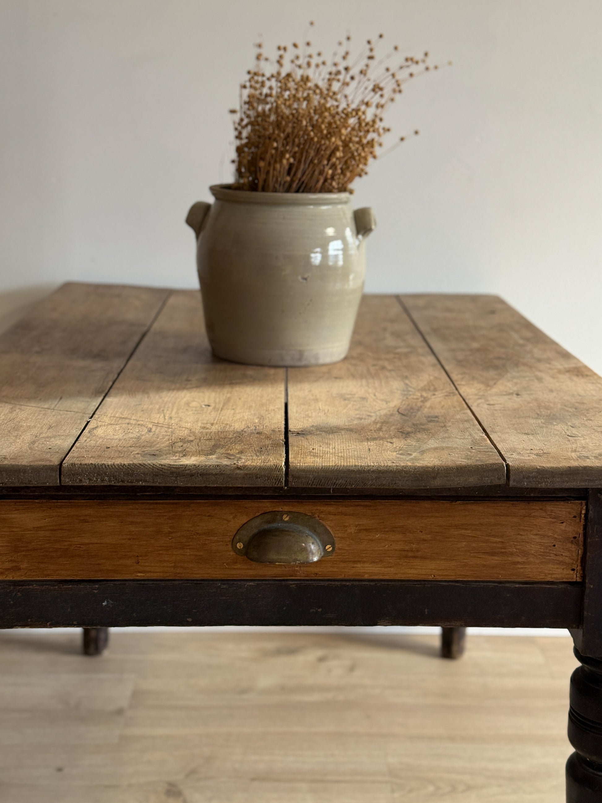 This antique English table features a single drawer with its original brass cup pull and a top of wide boards marked by a beautiful, time-softened patina. The legs are richly turned and finished in a dark stain that has mellowed over time, giving depth and contrast against the lighter wood of the drawer front. Full of character from generations of use, it would be equally at home as a side table, writing desk, or kitchen piece—an authentic reminder of English craftsmanship.
