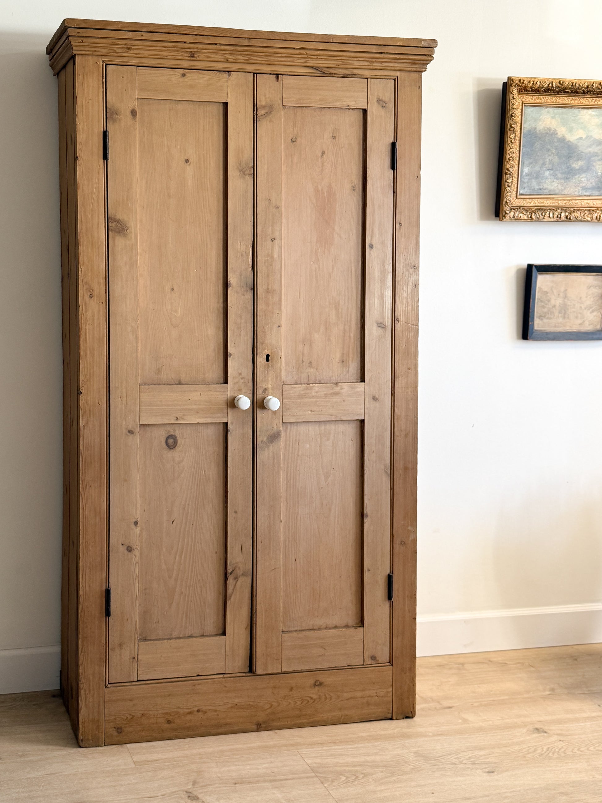 This antique English pine cupboard has the warm, timeworn look that makes early pine so inviting—simple lines, practical proportions, and a naturally mellowed surface shaped by years of daily use. The paneled doors open to wide shelving built from thick planks, each board showing its own knots and grain, a quiet nod to its farmhouse origins. The crown molding adds just enough definition without feeling formal, and the varied tones in the wood and old hardware give the piece depth and presence. With its clean interior and generous storage, it works beautifully as a kitchen larder, linen cupboard, or display cabinet, bringing an easy English cottage feel to any space.