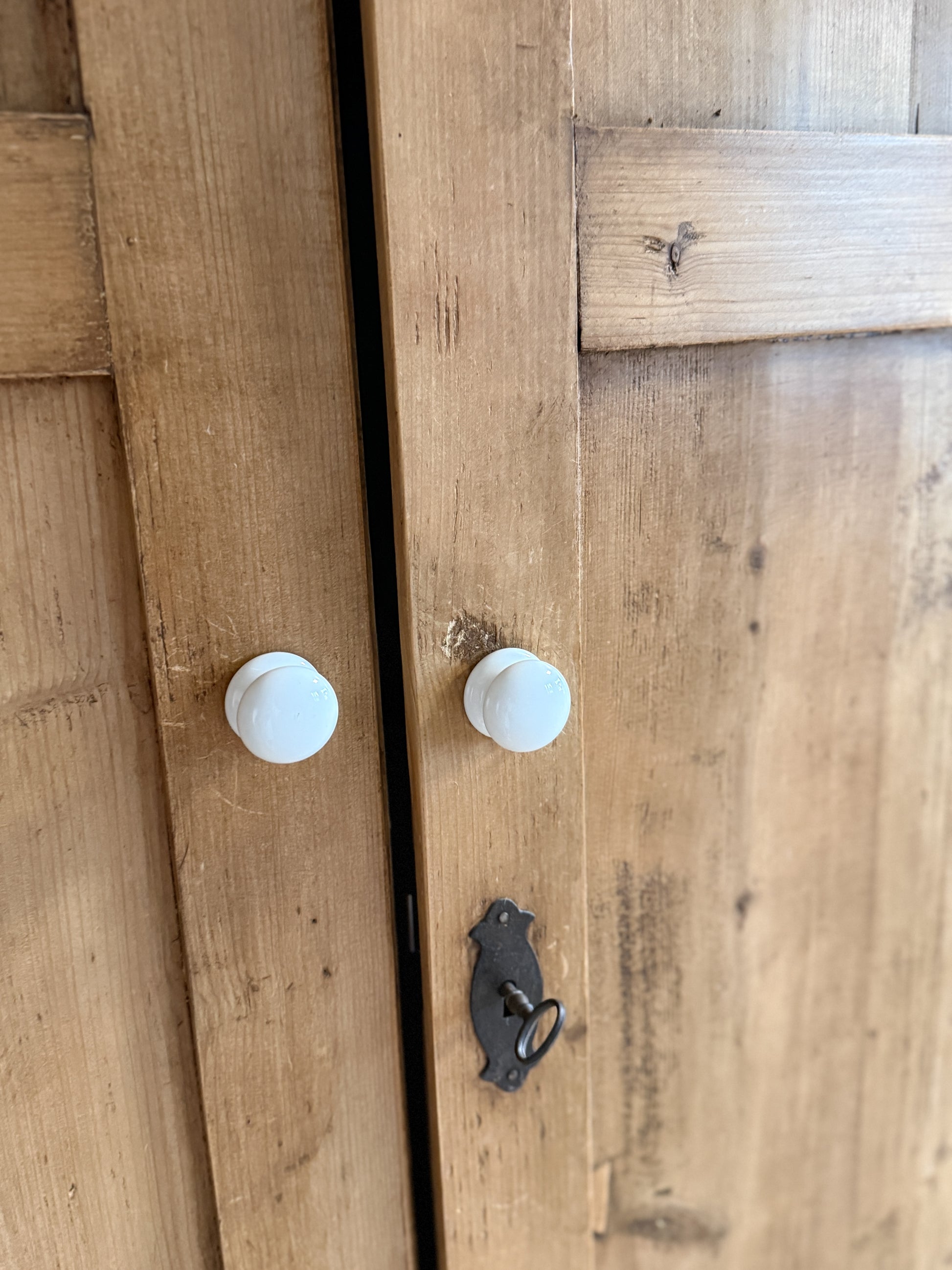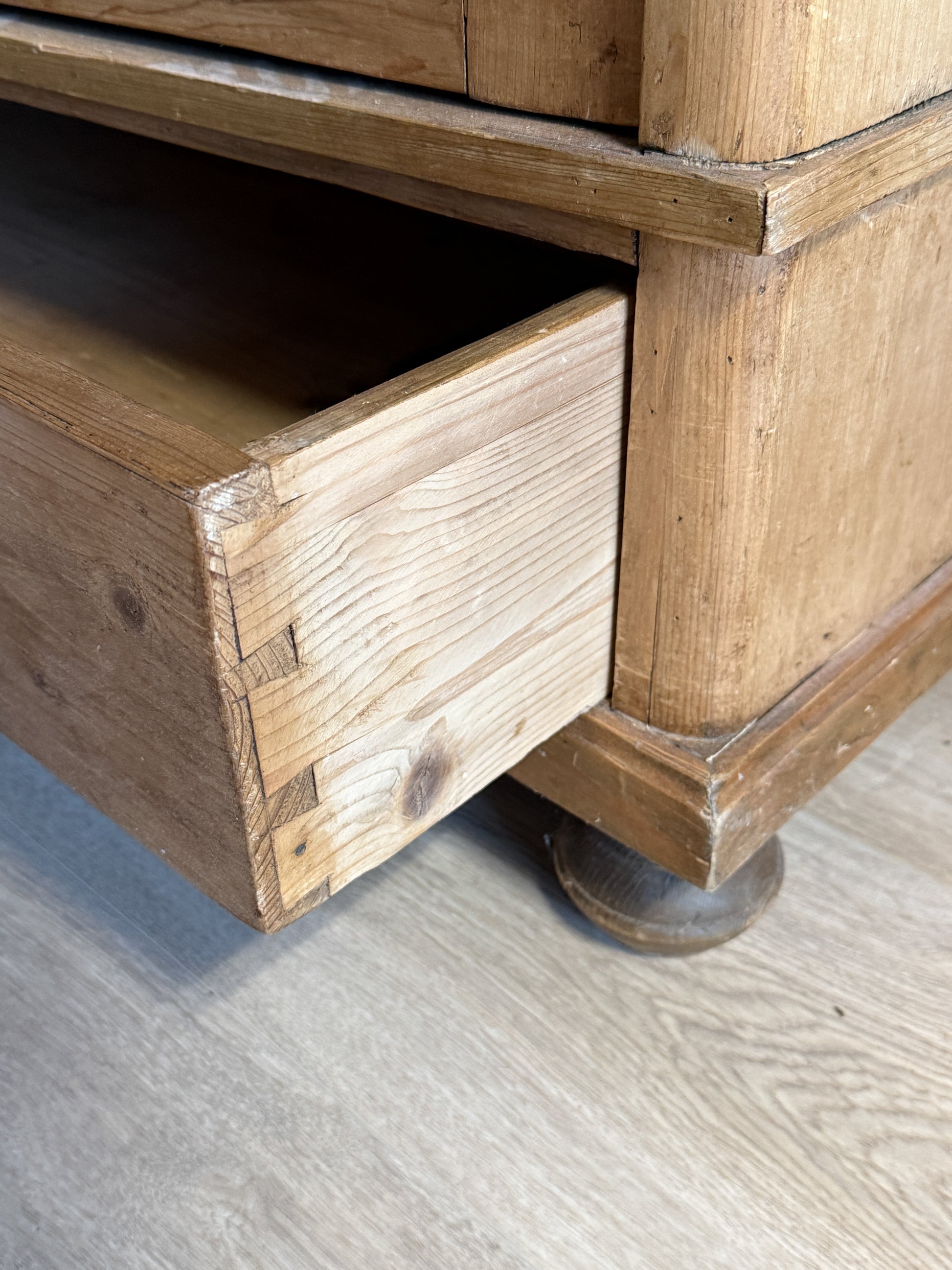 An antique English pine knockdown wardrobe with a straightforward, well-proportioned form and the kind of surface that only develops through long use. Constructed in solid pine with paneled doors, a single lower drawer, and simple turned feet, it offers generous interior storage while keeping a restrained, architectural presence. These knockdown pieces were originally made to be easily assembled inside centuries-old English cottages, where doorways and stairwells were far smaller than those in modern homes. The softly worn patina highlights knots, grain variation, and old nail marks, giving the piece warmth without feeling heavy, while its practical, demountable construction continues to make it an adaptable choice for today’s interiors.