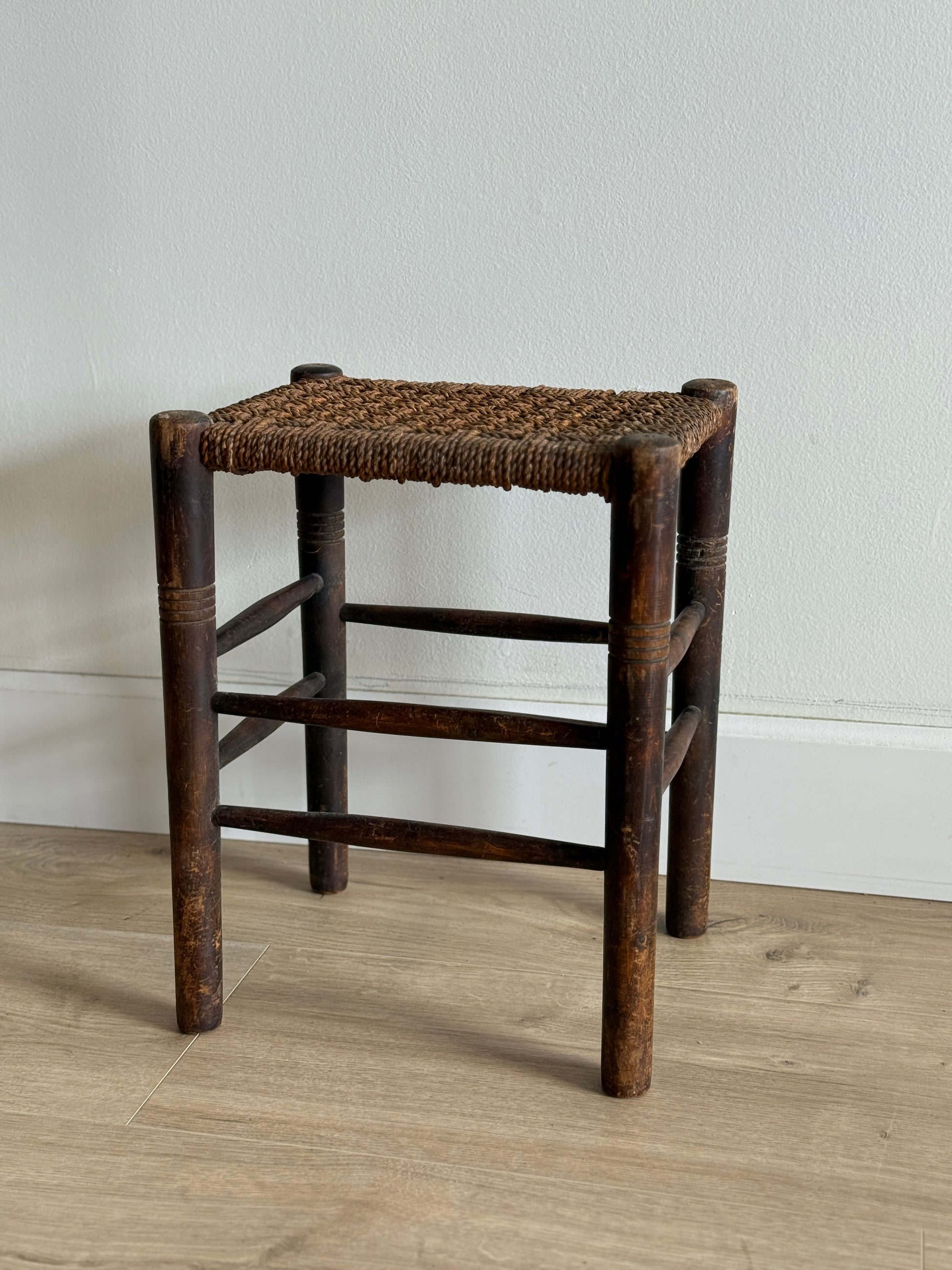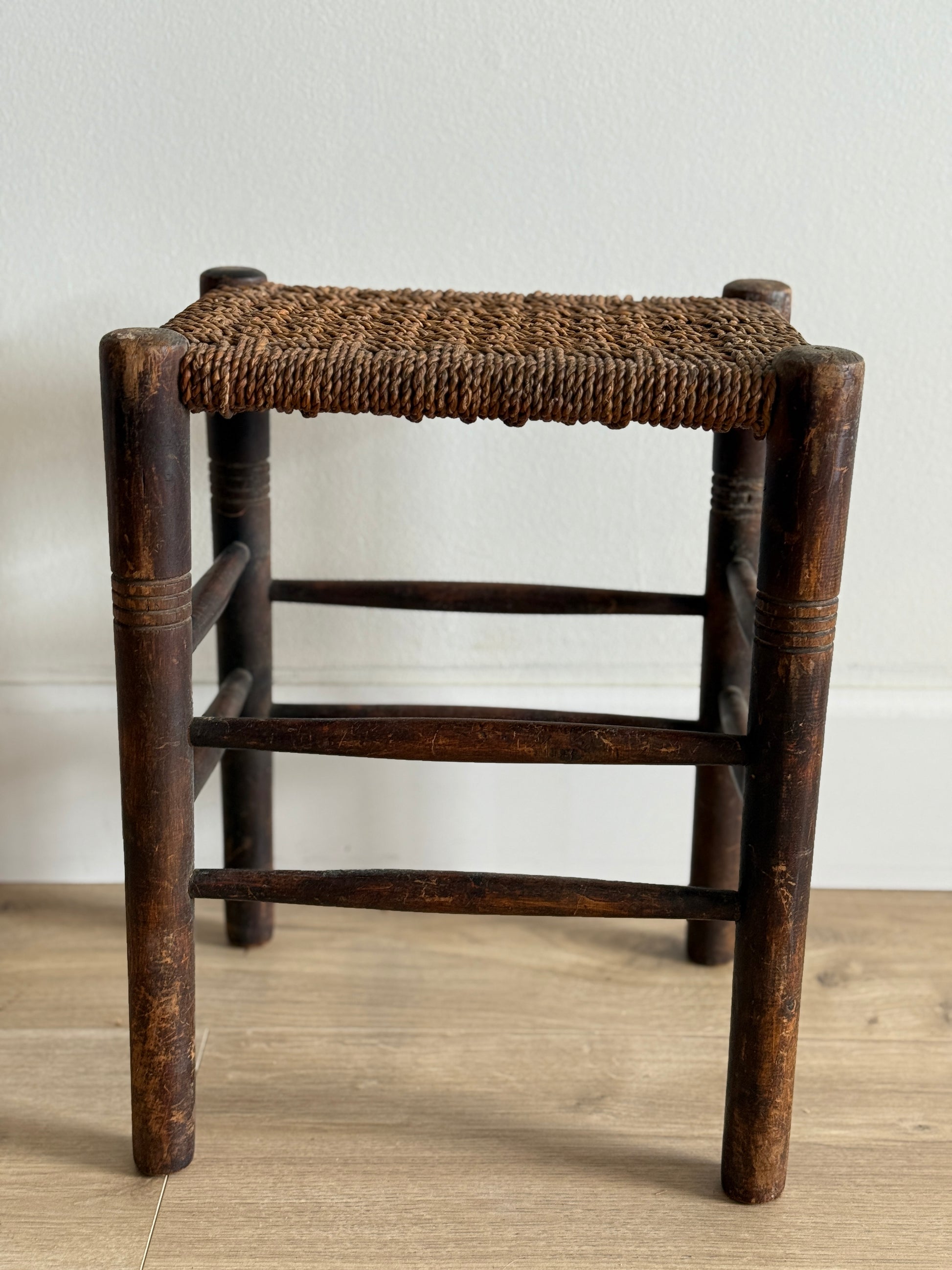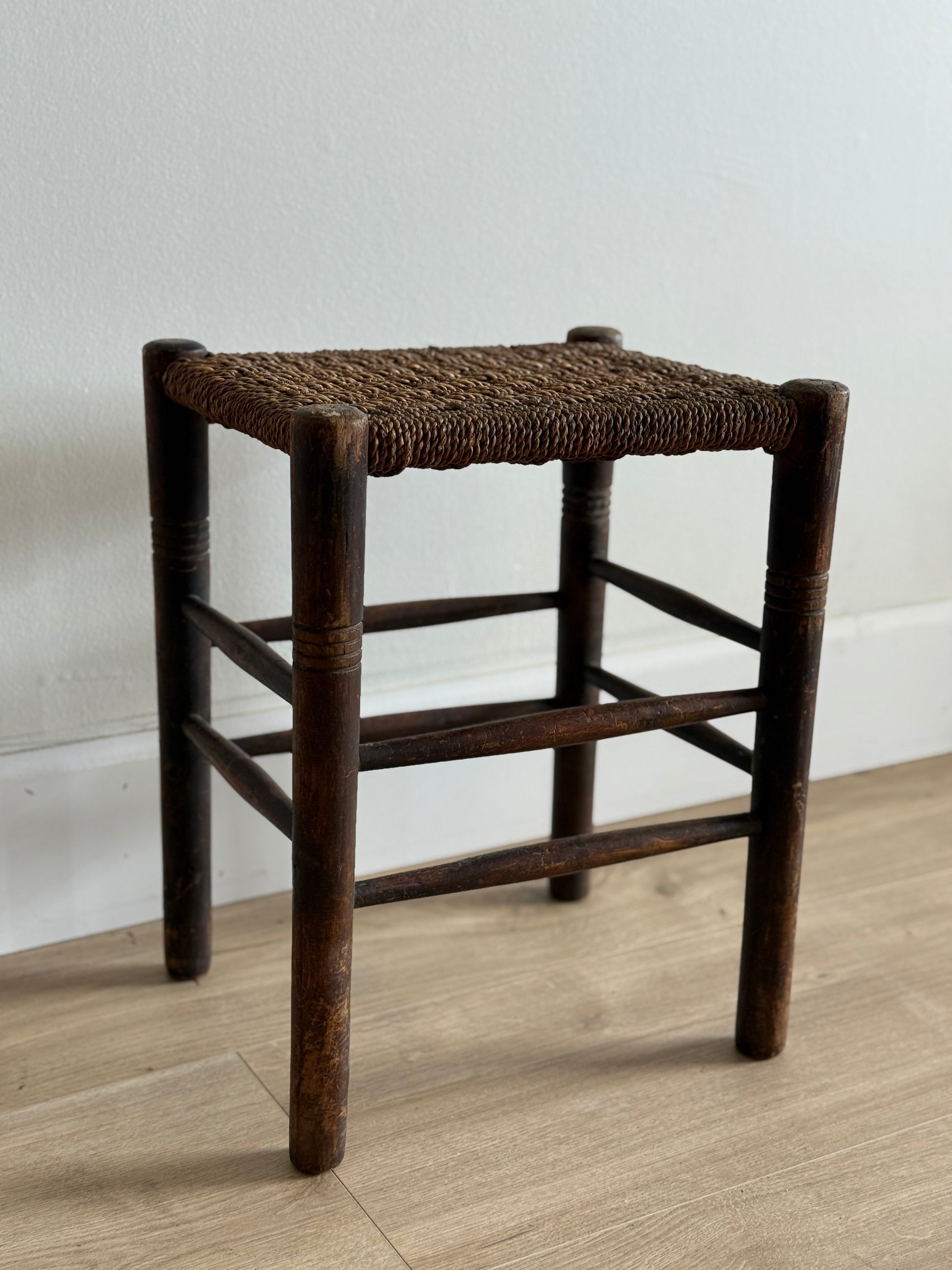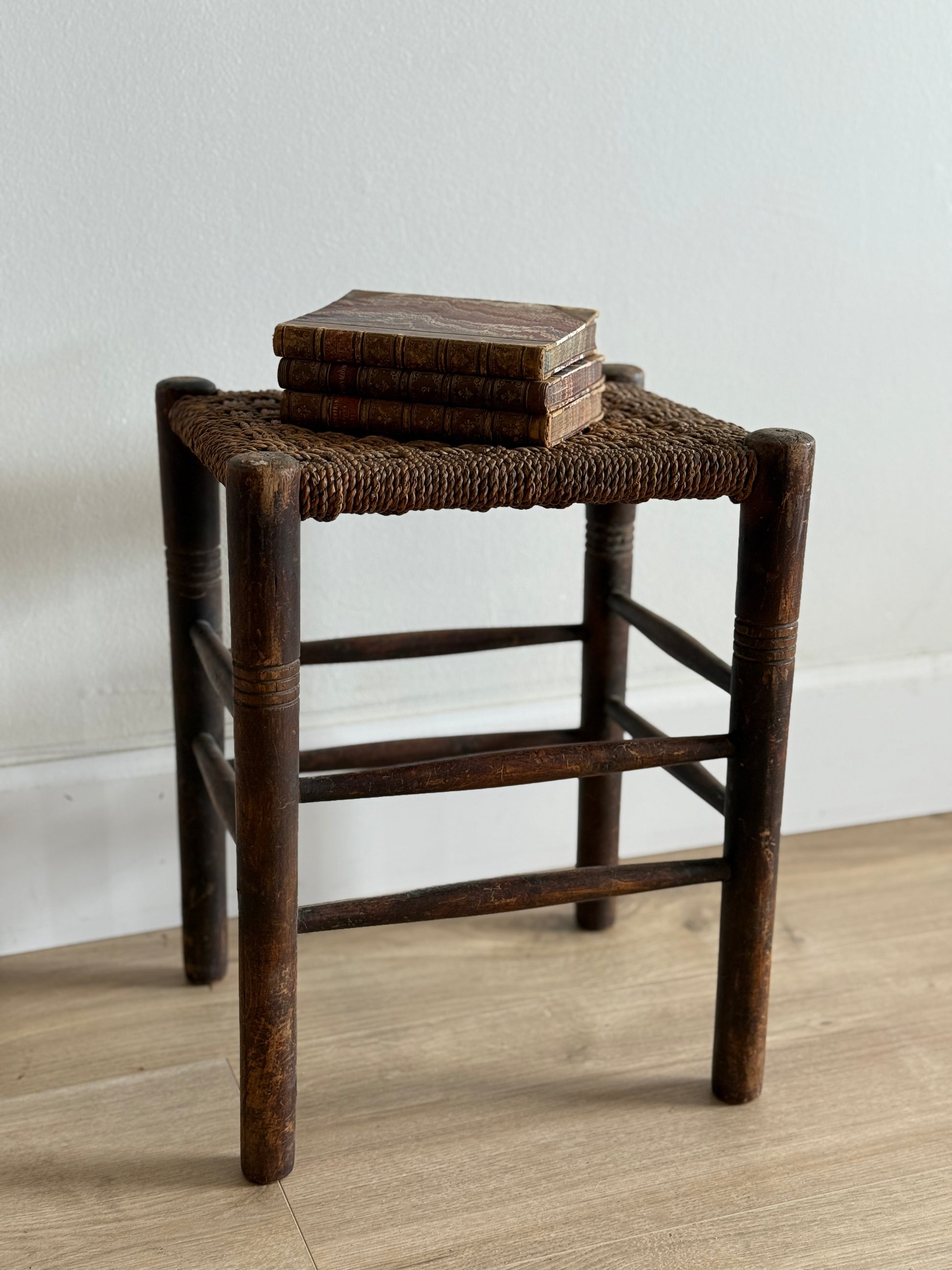 This early 19th-century English stool combines rustic simplicity with enduring craftsmanship. Its square seat is finely hand-woven in a tight rush pattern, supported by round legs joined with multiple stretchers for stability. Subtle turned ring details add a touch of refinement, while the dark, time-worn finish speaks to generations of practical use and the quiet beauty of vernacular country furniture.