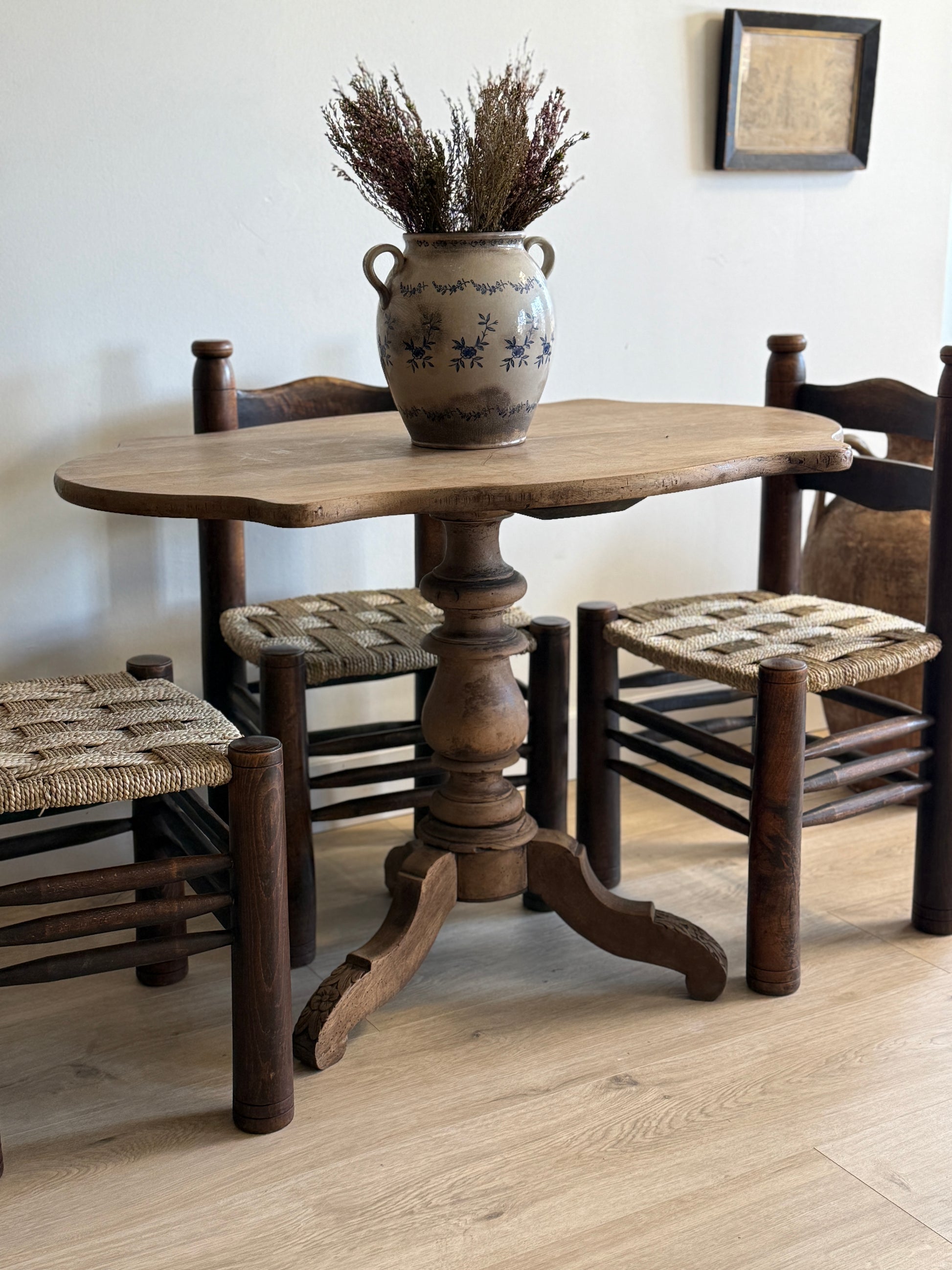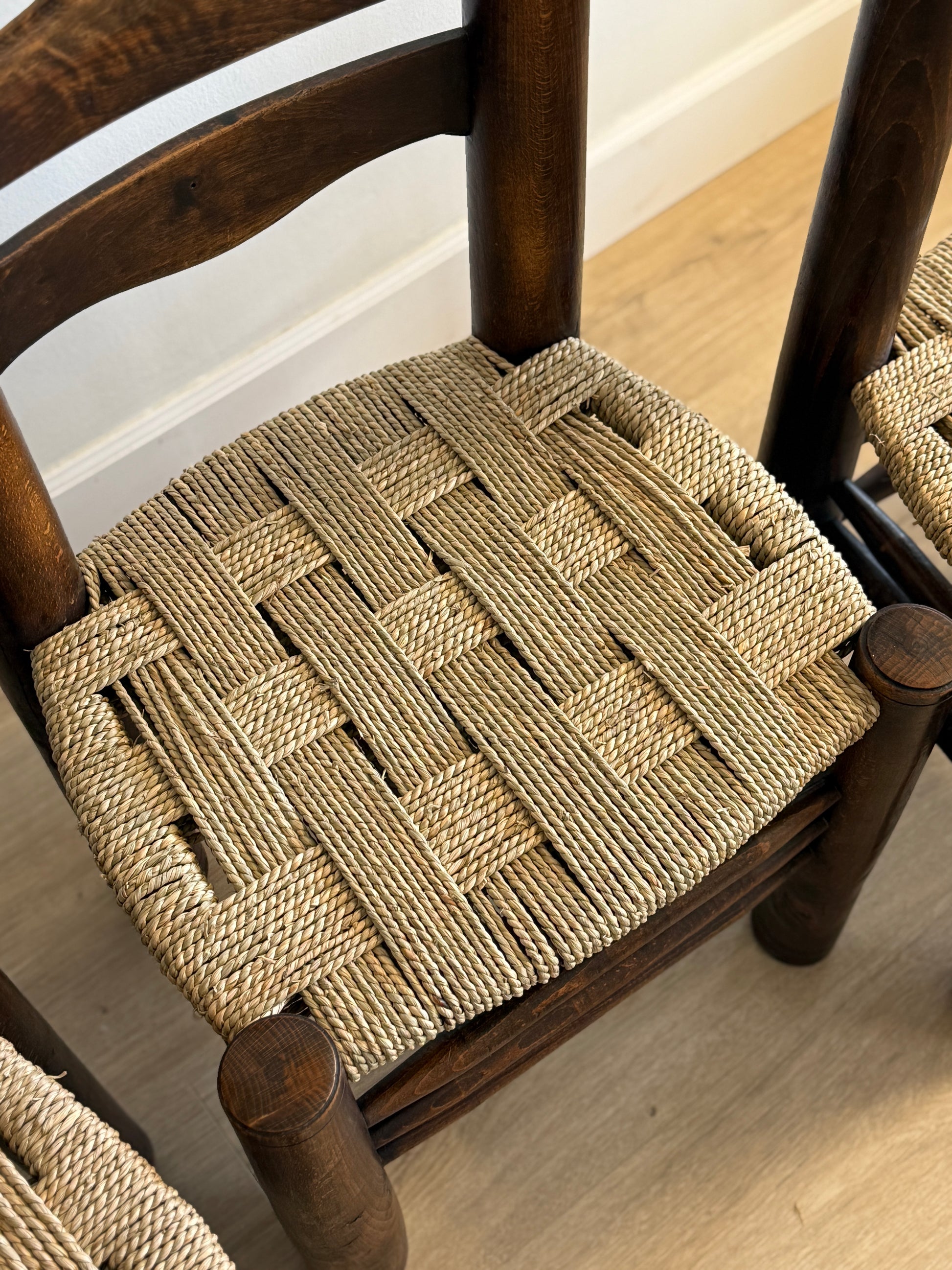 A beautifully preserved set of four original Charles Dudouyt rush chairs, showcasing the designer’s signature balance of sculptural form and honest craftsmanship. Each chair is constructed in richly toned solid wood with softly rounded posts, hand-shaped ladder backs, and traditional turned detailing that gives the set its distinctive presence. The woven rush seats have been expertly crafted in a classic basket weave, offering both visual texture and lasting comfort, and remain in excellent condition. The warm patina across the frames reflects decades of use and care, lending depth and character without feeling worn. Substantial yet refined, these chairs work effortlessly around a dining table, in a breakfast room, or layered into a curated interior, embodying the timeless appeal that has made Dudouyt’s designs so enduringly sought after.