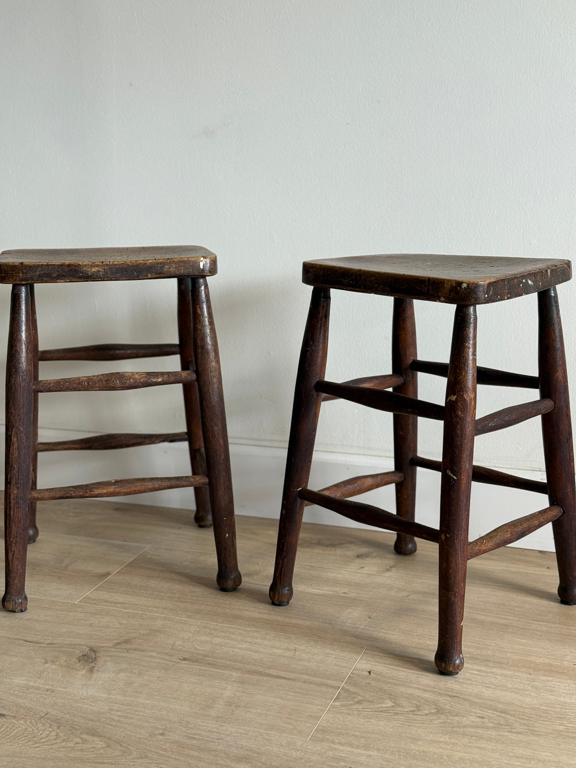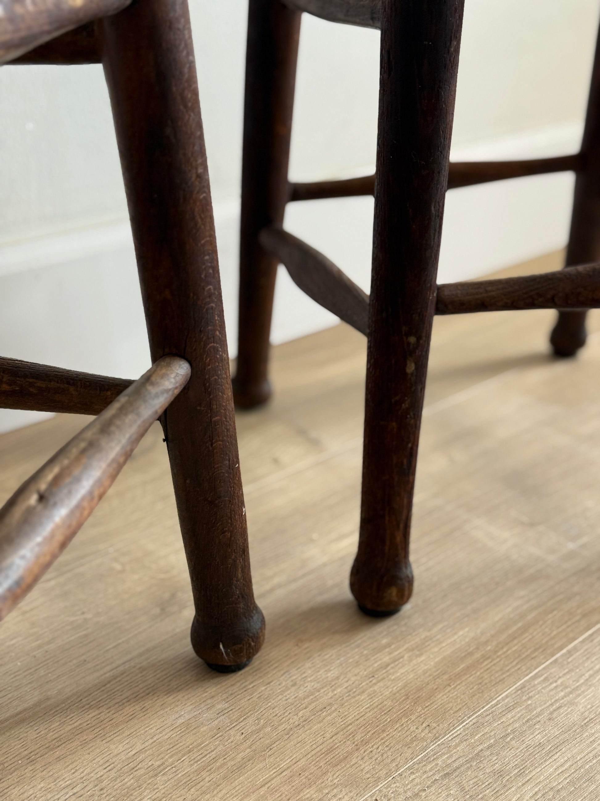 This pair of 19th century antique English stools, reflects the sturdy elegance of rural craftsmanship. Each features a thick, well-worn seat above gently splayed legs, joined by robust stretchers for strength. The legs terminate in simple, turned pad feet—a practical yet graceful detail—while the rich, time-darkened finish and subtle irregularities speak to generations of honest use and the hand of the maker.