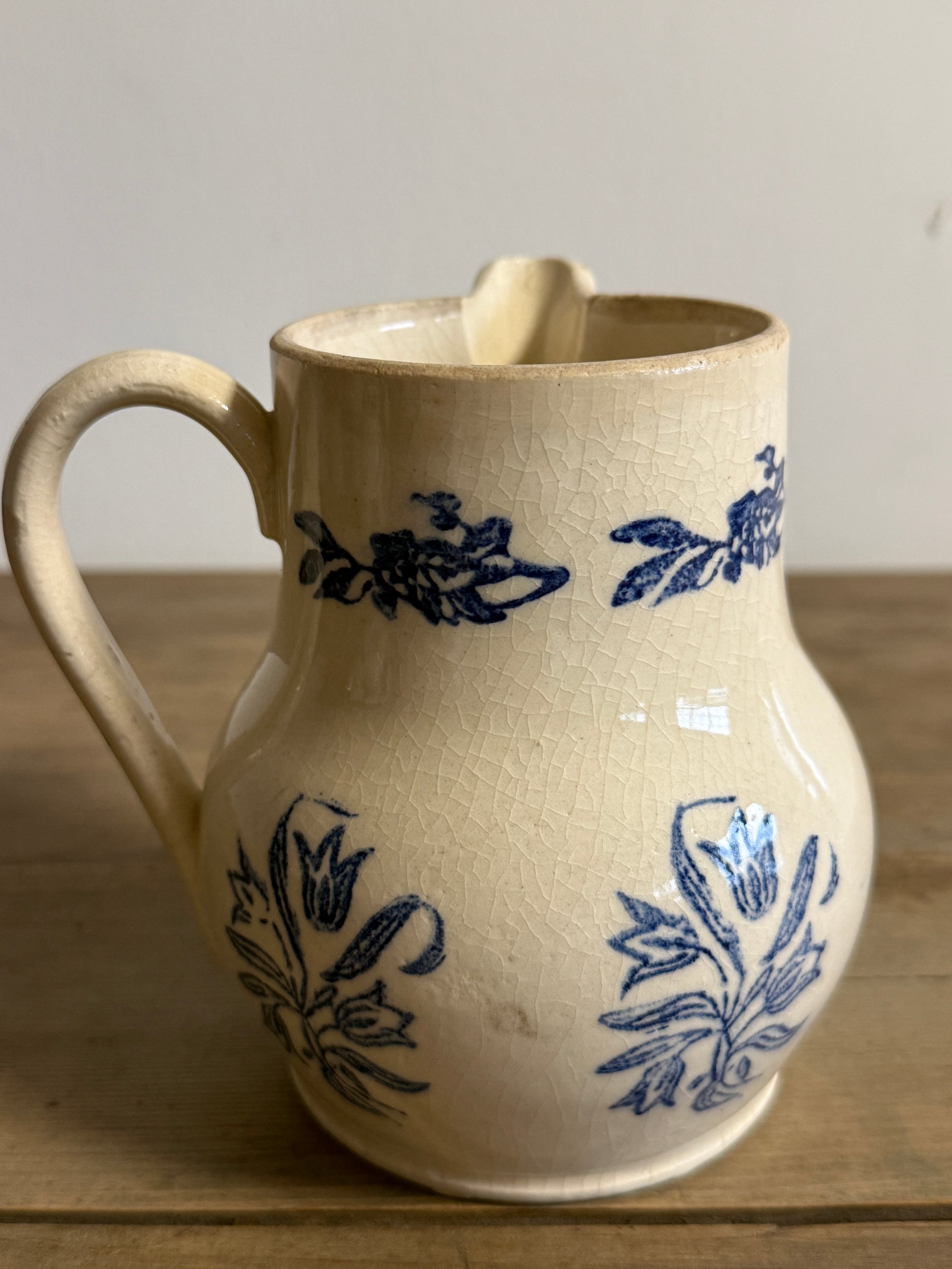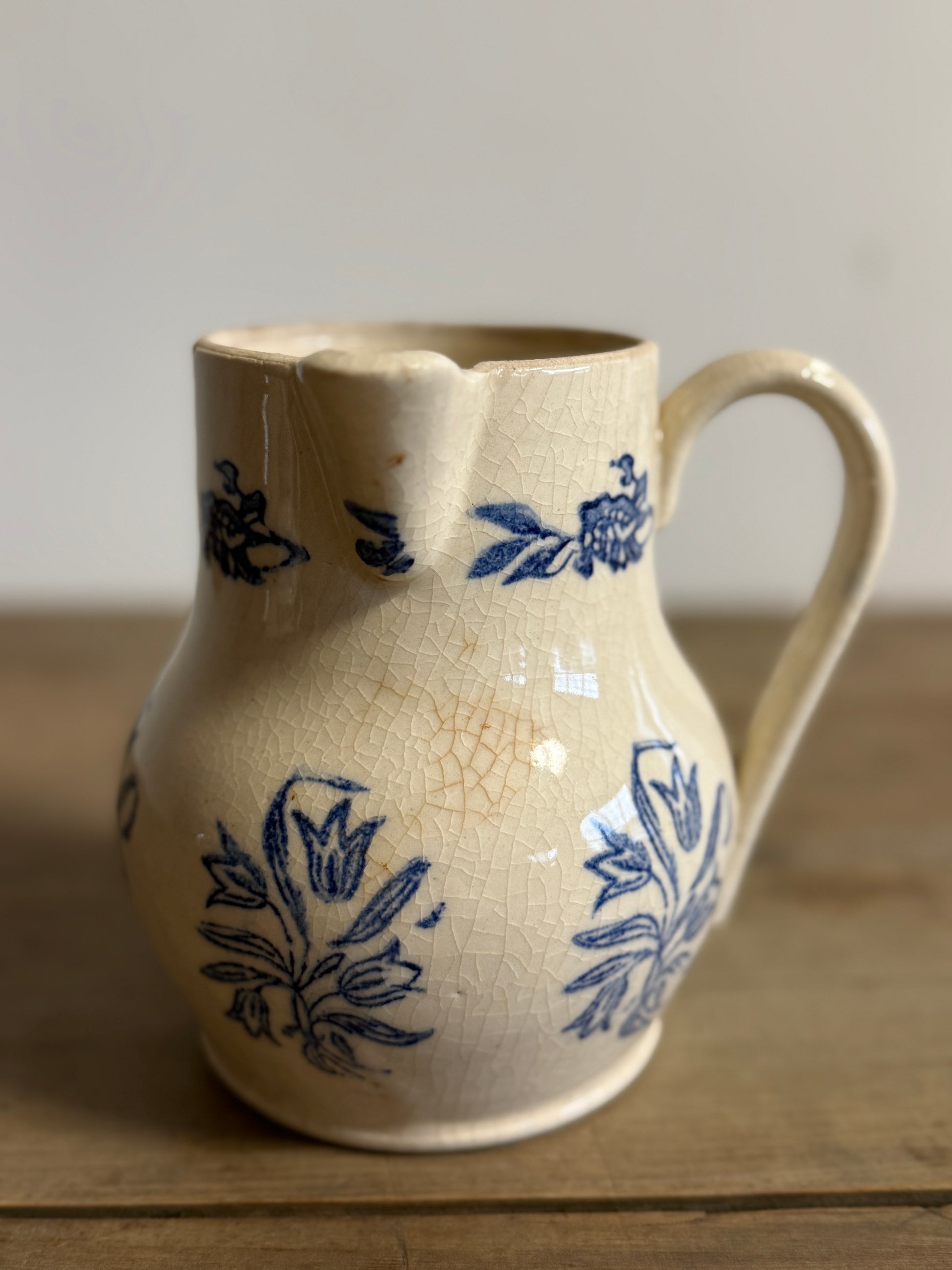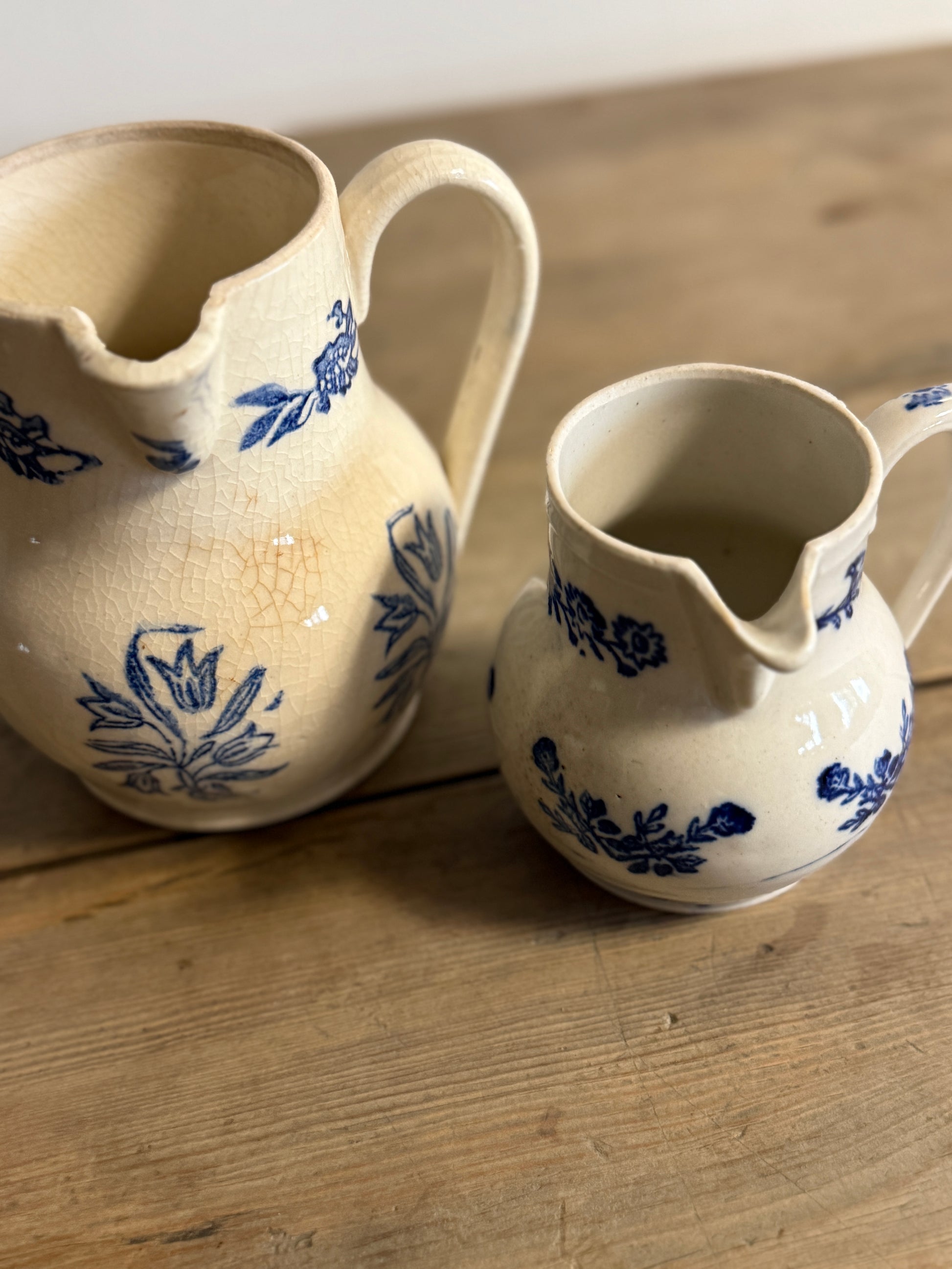 A pair of 19th-century French Saint-Uze pitchers, each decorated in a cobalt floral transfer that stands out beautifully against their warm ivory glaze. Their graceful forms and delicately shaped spouts reflect the refined utilitarian pottery produced in France’s Drôme region during the 1800s. Both show the light craquelure and gentle wear of age that lend authentic charm, lovely displayed together or used individually with flowers or table service.